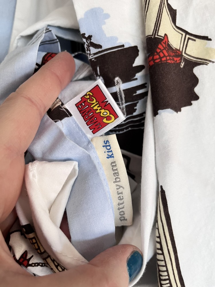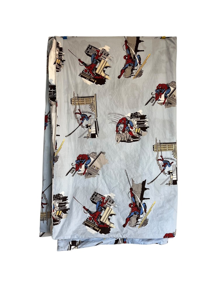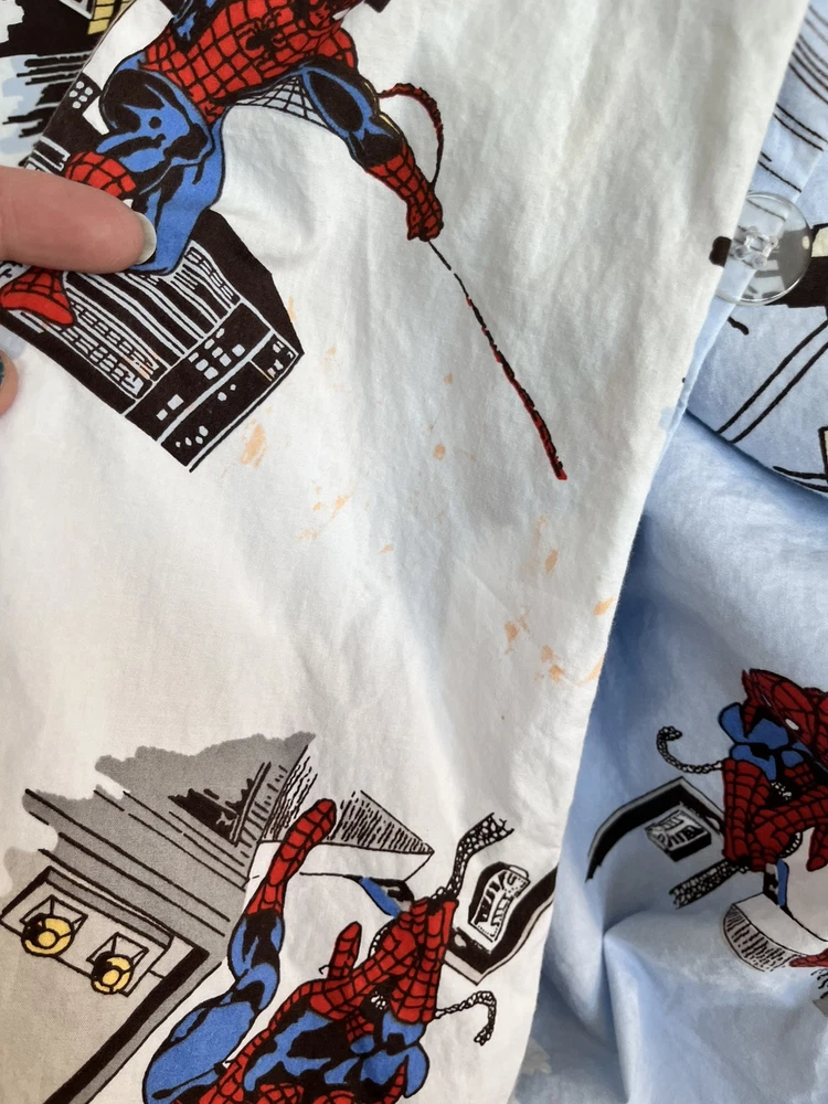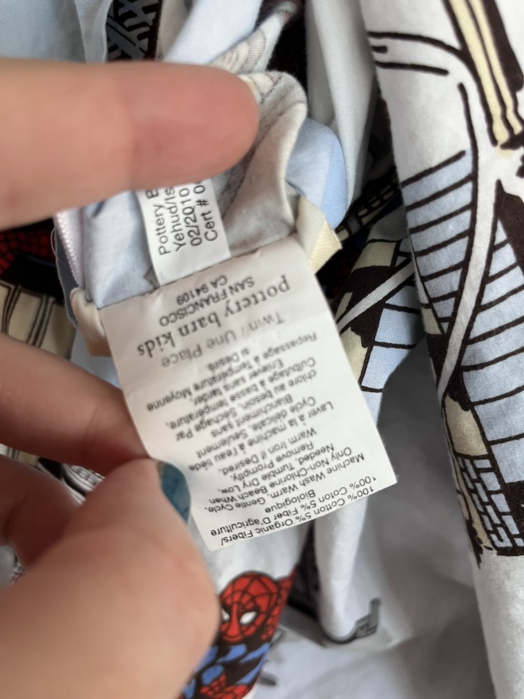 Hello! Featured item: A Pottery Barn Kids X Marvel Spider-Man TWIN Duvet Cover - 100% Cotton - Reversible Blue to White. Button closure. Good shape and clean, but there are some orange colored spots near the buttons on one end. See images for details.