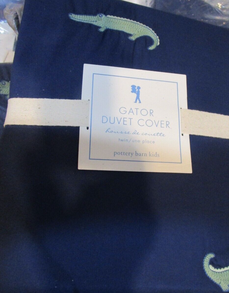 Up For Auction is - Pottery Barn Kids navy blue embroidered gator duvet twin New w tag all cotton Smoke and pet free home.