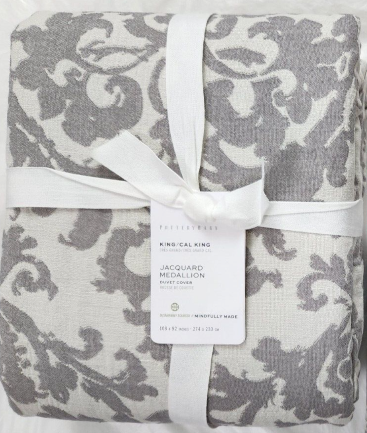 Item New With Tagged, See Picture for more Details. Pottery Barn King/Cal King Jacquard Medallion Duvet Cover 108" x 92" Gray Add a touch of modern elegance to your bedroom with this Pottery Barn Jacquard Medallion Duvet Cover. Made of a comfortable blend of 45% viscose, 38% cotton, and 17% linen, making it both soft and durable. The rectangular shape fits a king or cal king size bed, measuring 92" in width and 108" in length. The Jacquard Medallion pattern adds a sophisticated touch to your bedding. Machine washable fabric makes it easy to care for. The duvet cover features a button closure and is perfect for both teens and adults. This Pottery Barn duvet cover is an excellent addition to any bedroom and is sure to impress your guests.