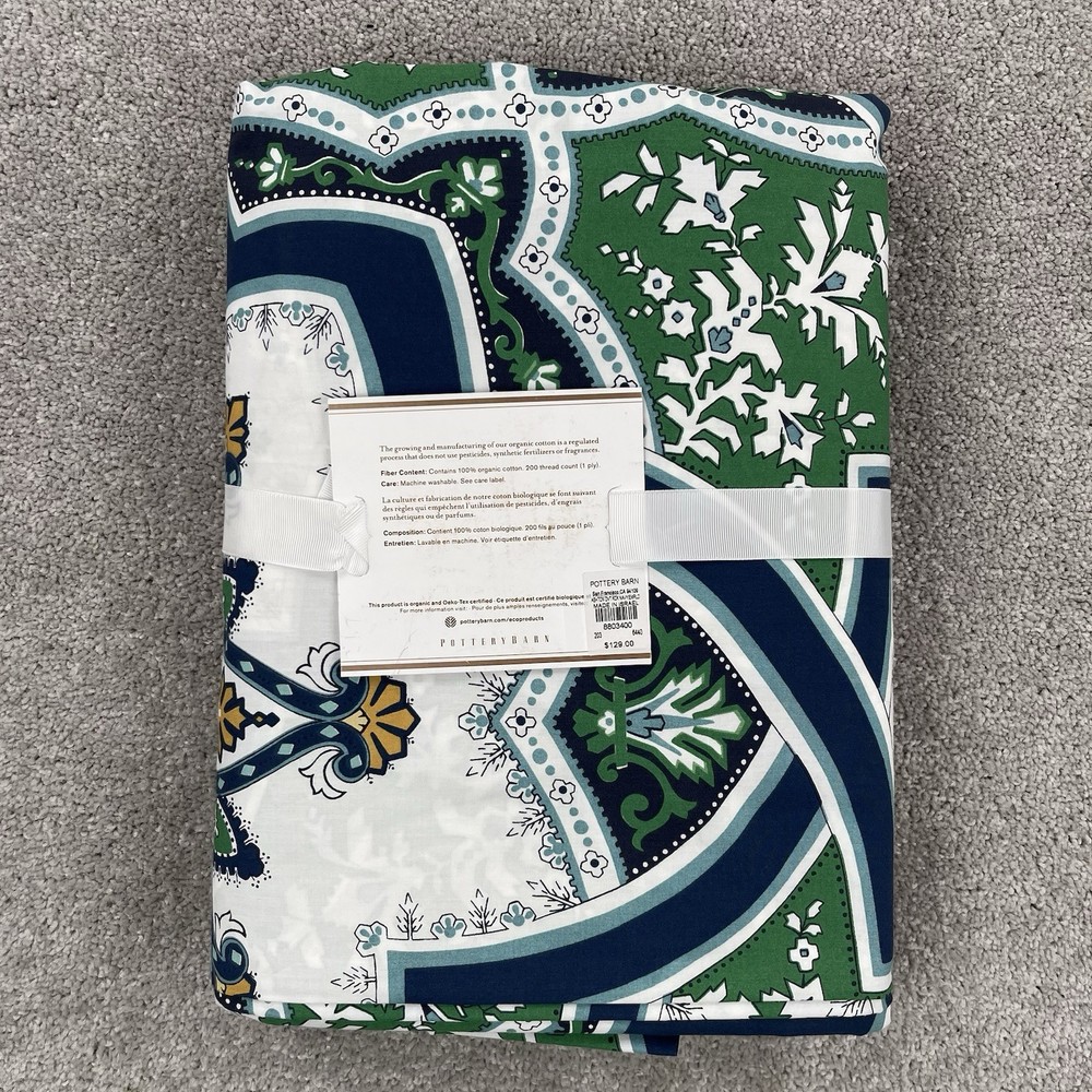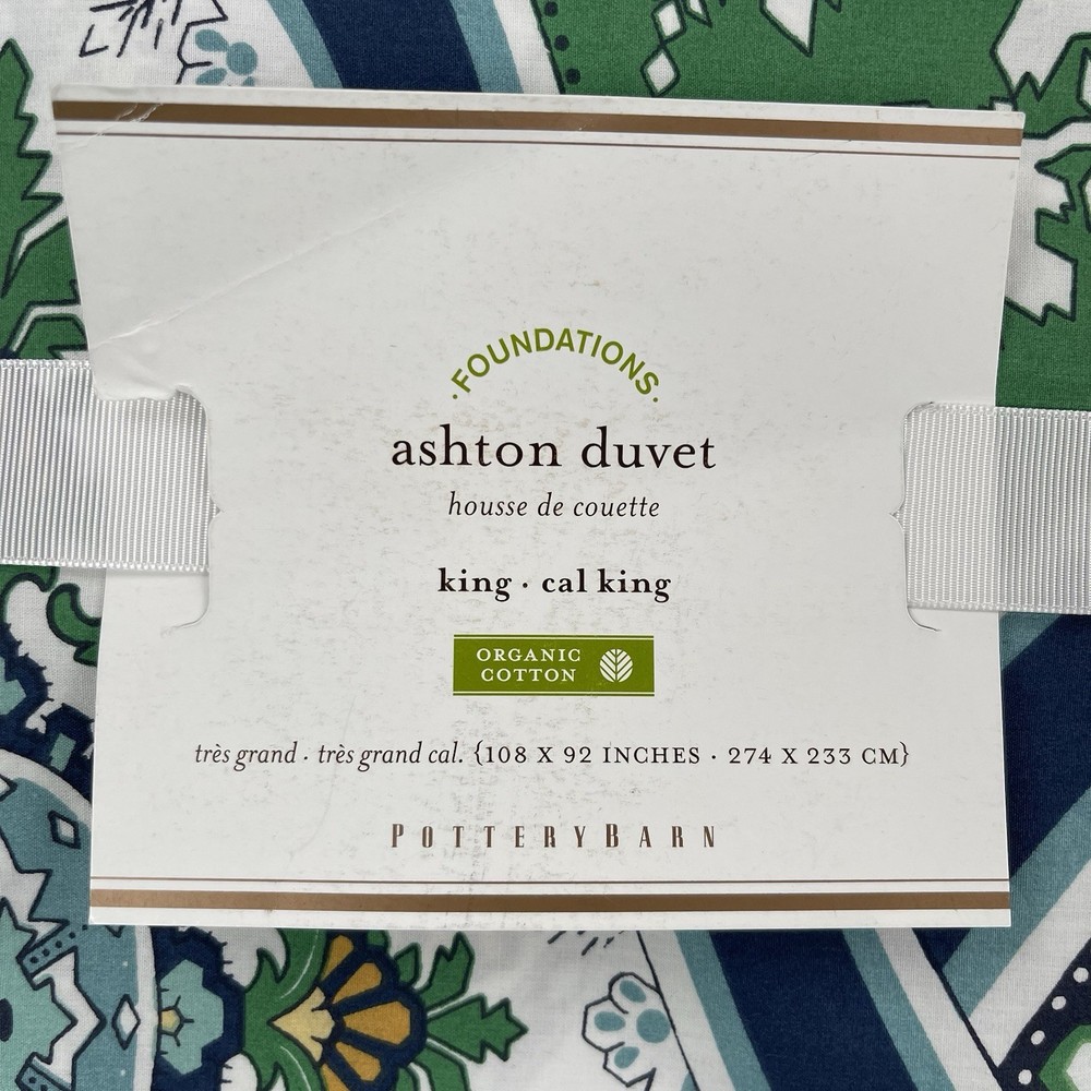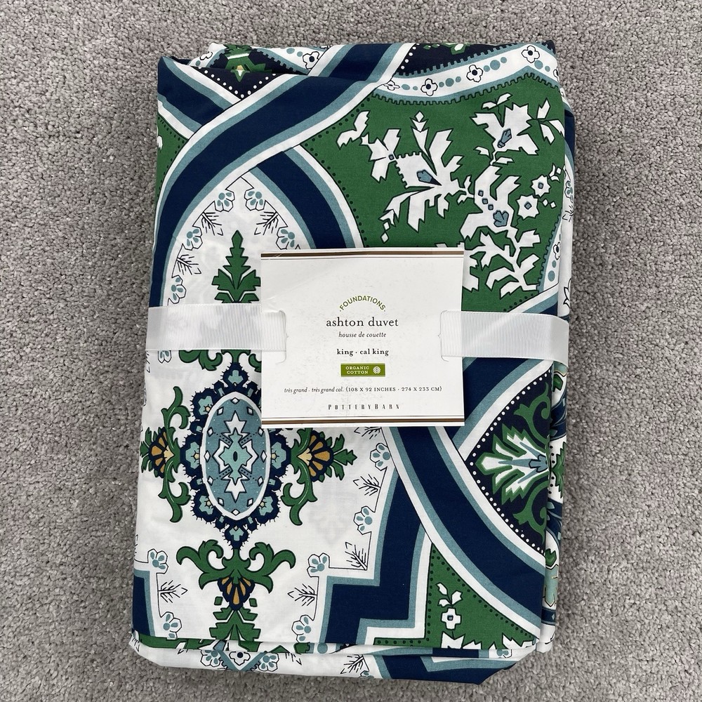 Up for sale is a Pottery Barn Ashton King / Cal King Duvet Cover in green and blue Size: 108" x 92" Condition: New With Tags. Inventory is stored in a smoke free environment. This item ships next business day except for holidays via USPS Mail with a tracking number for confirmation. I package properly and ship every day so you can expect a quick and safe delivery.