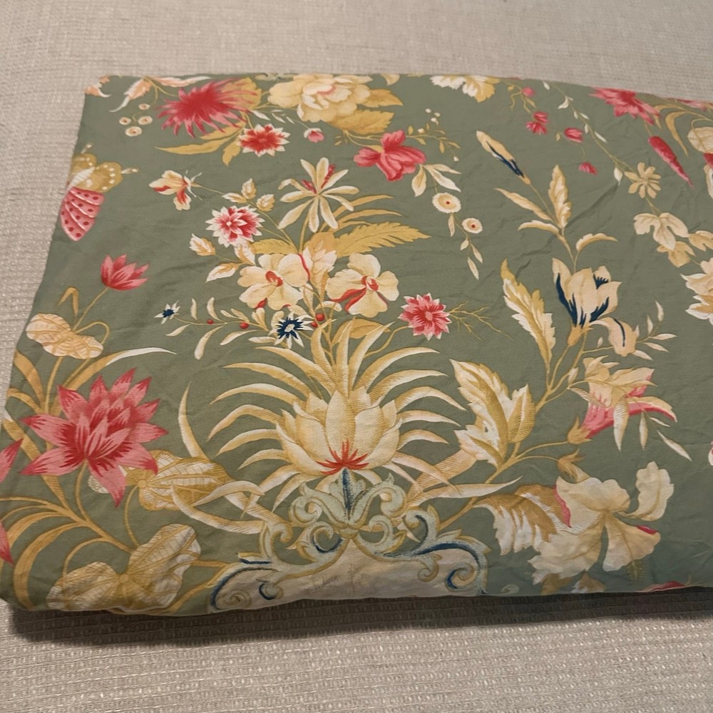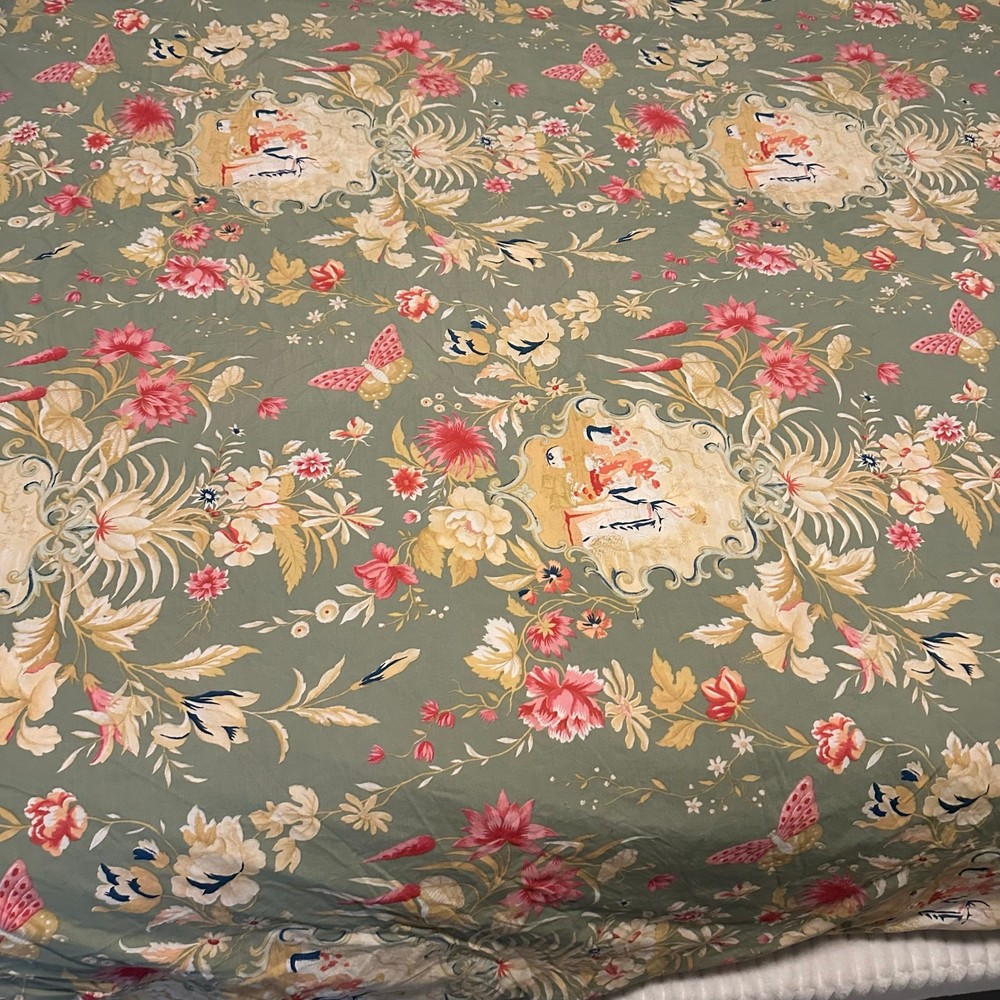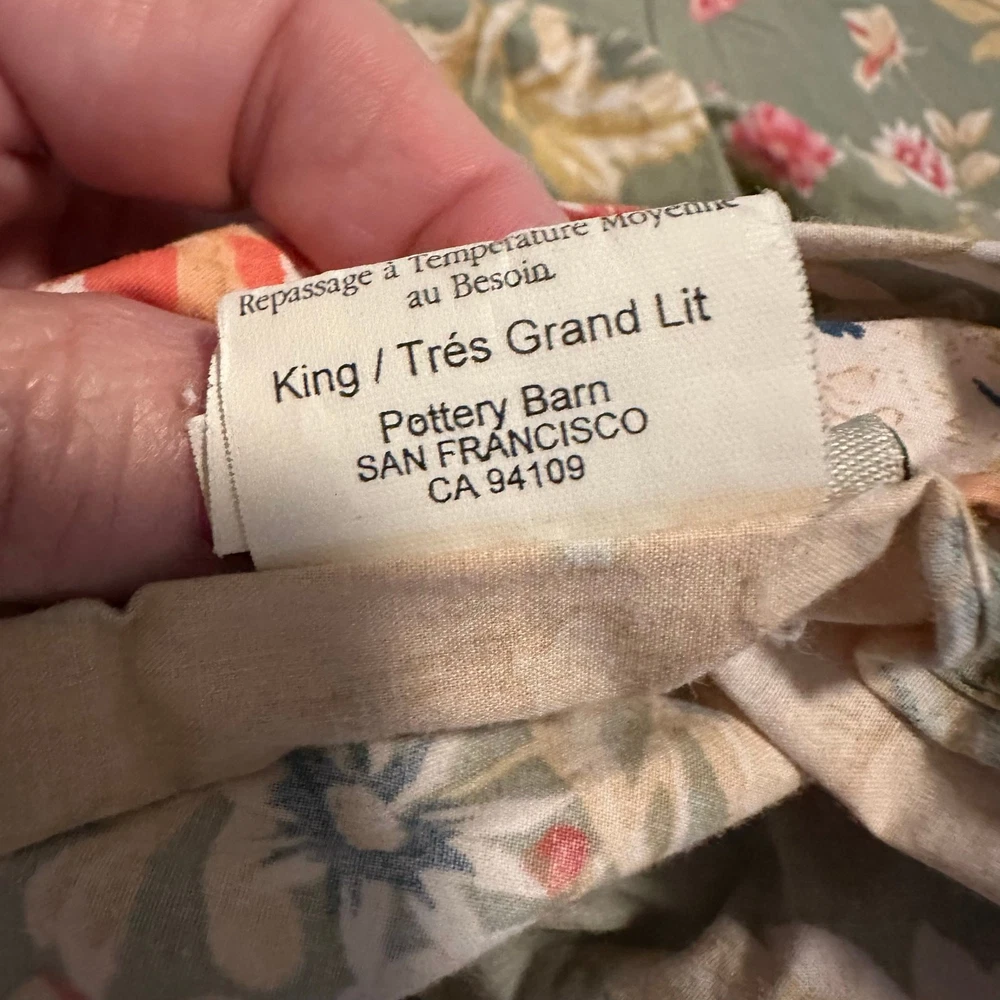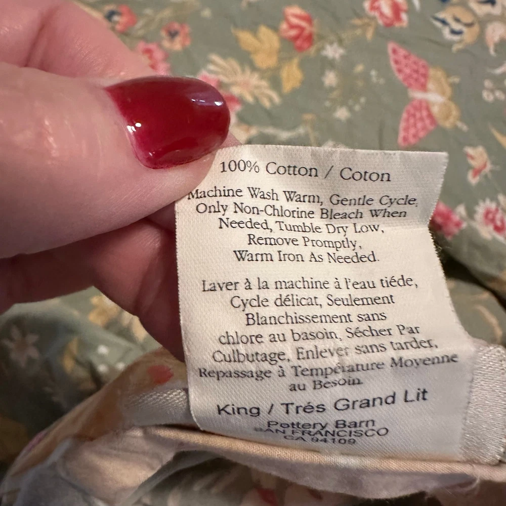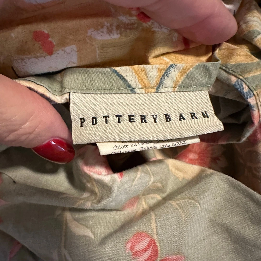 <![CDATA[<div>* Brand: Pottery Barn * Size: King * Design: Asian-inspired floral with butterflies and Geisha girl motifs * Color: Muted sage green base with pink, cream, yellow, and blue accents * Material: 100% cotton * Style: Chinoiserie, vintage-inspired, elegant and timeless Condition: In gently pre-owned condition with no visible flaws. Please review photos to assess the item's condition. Shipping: In an effort to be more environmentally friendly, your package may include some recycled materials but will be safely packaged.