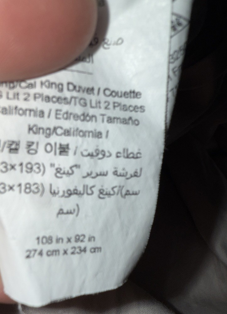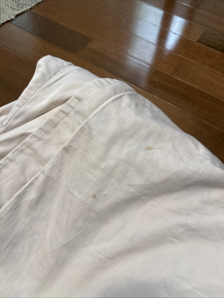 This duvet looks like something blue has transferred onto the duvet. It is faint blue but is on various areas of the duvet. Also a few stains as seen in photo No holes Price is lowered AS IS
