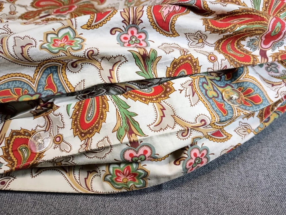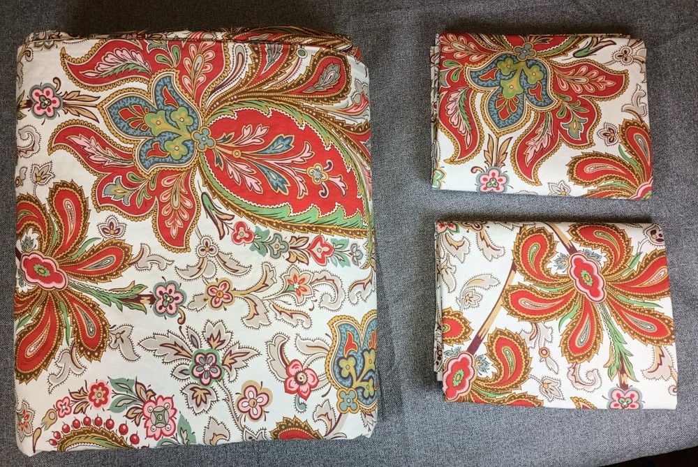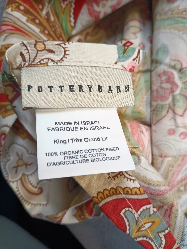 Enhance your bedroom with the Pottery Barn King Duvet Set, a three-piece collection that exudes a Boho style with its vibrant paisley pattern. The set includes a king-size duvet cover and two coordinating pillow shams Crafted from organic cotton, this set promises a comfortable and eco-friendly sleep experience.The duvet cover features a colorful palette of red, blue, and green, adding a touch of playfulness to your bedding. The button closure ensures a secure and seamless fit to your mattress. Whether you're updating your space or gifting a loved one, this duvet set brings a chic and inviting atmosphere to any bedroom.