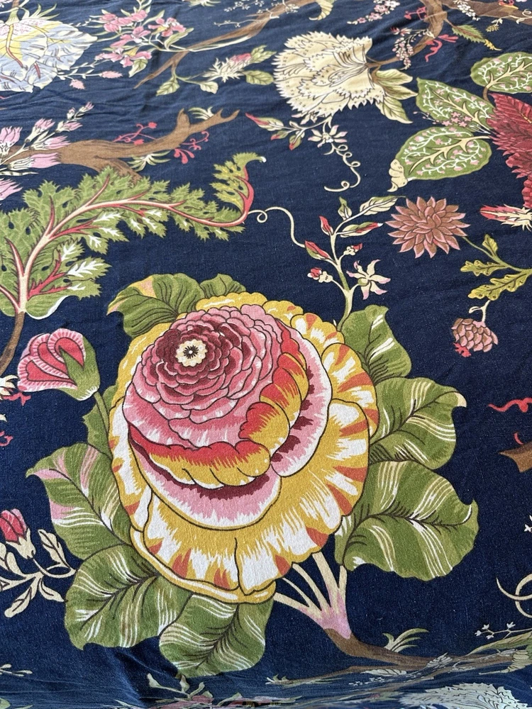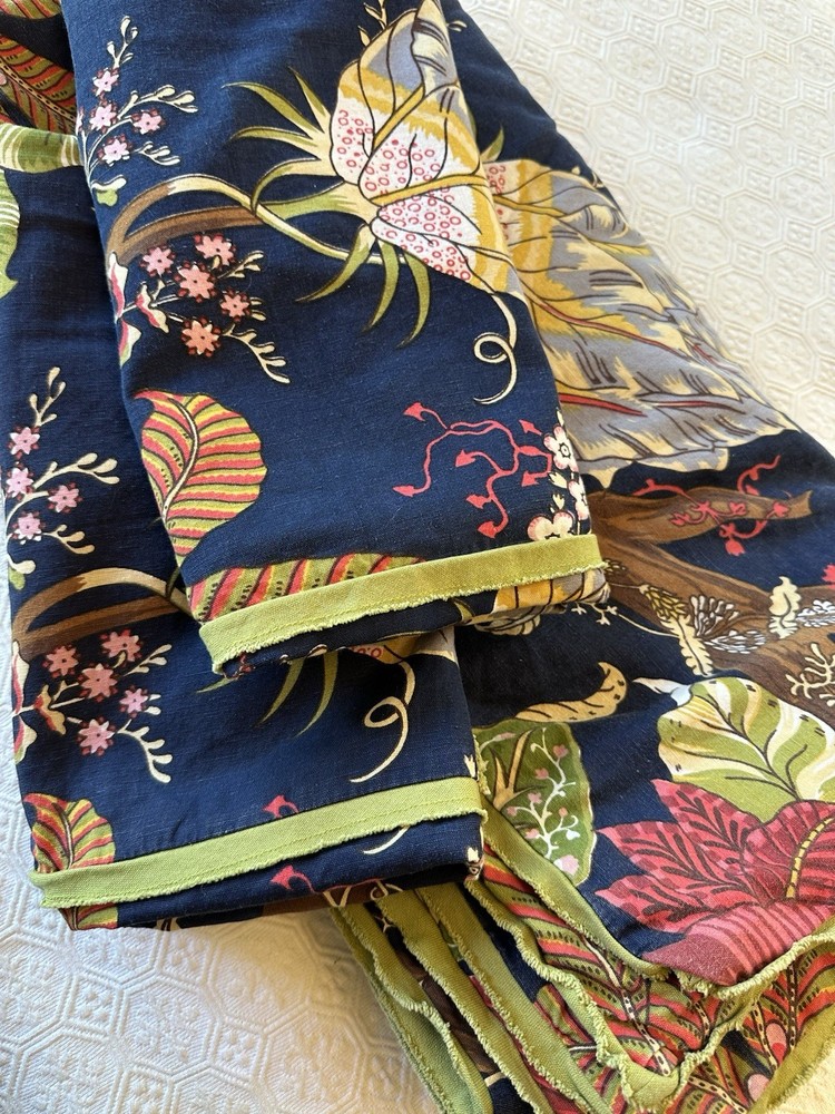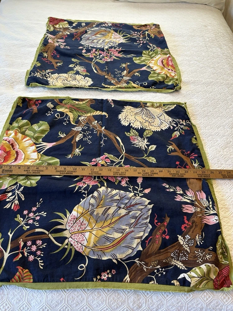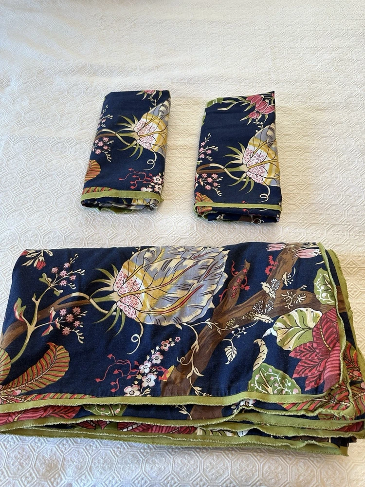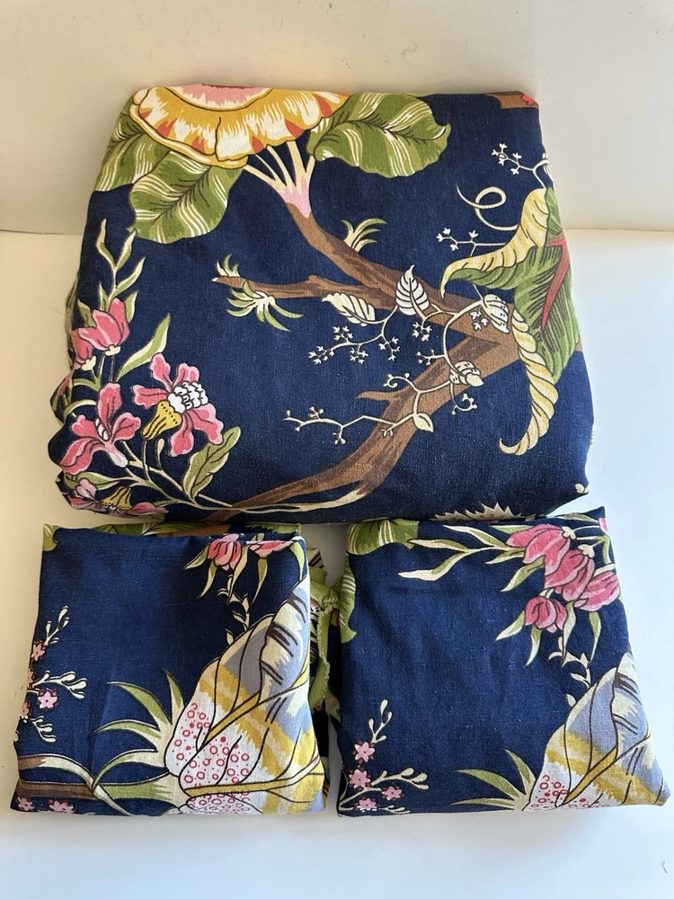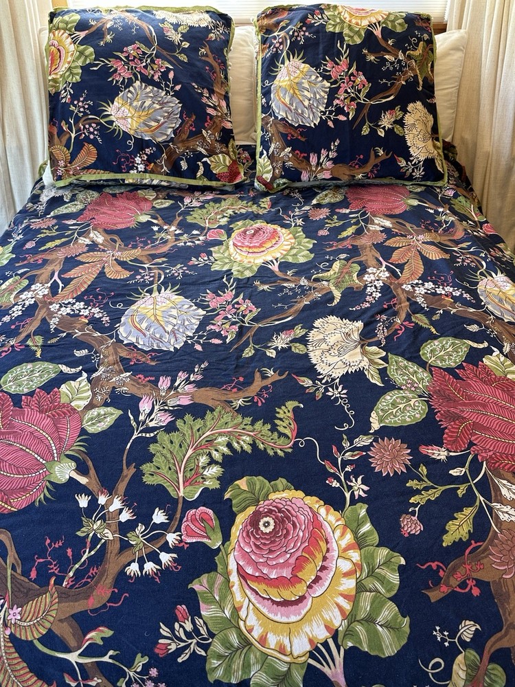 3PC Laina Palampore King Duvet Set with 2 Euro Shams. Gorgeous Jacobean Floral over a navy blue base. This pattern features a 'raw' edge, in an earthy Spring green. 85% Cotton, 15% Linen, made in India. Retired pattern and fairly hard to find. Reversible with identical fabric on both sides. Button enclosure. The 2 Euro Shams have an envelope opening in the back. King duvet size: 92"x108" Euro sham size: 26”x26” Excellent preowned condition with no rips, stains, fading, or obvious wear. Quite gorgeous.