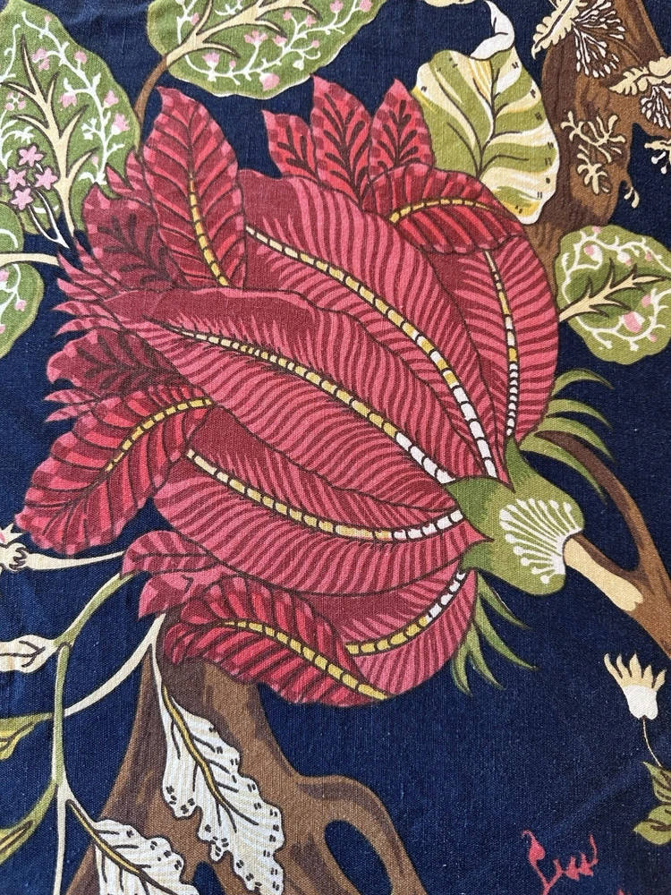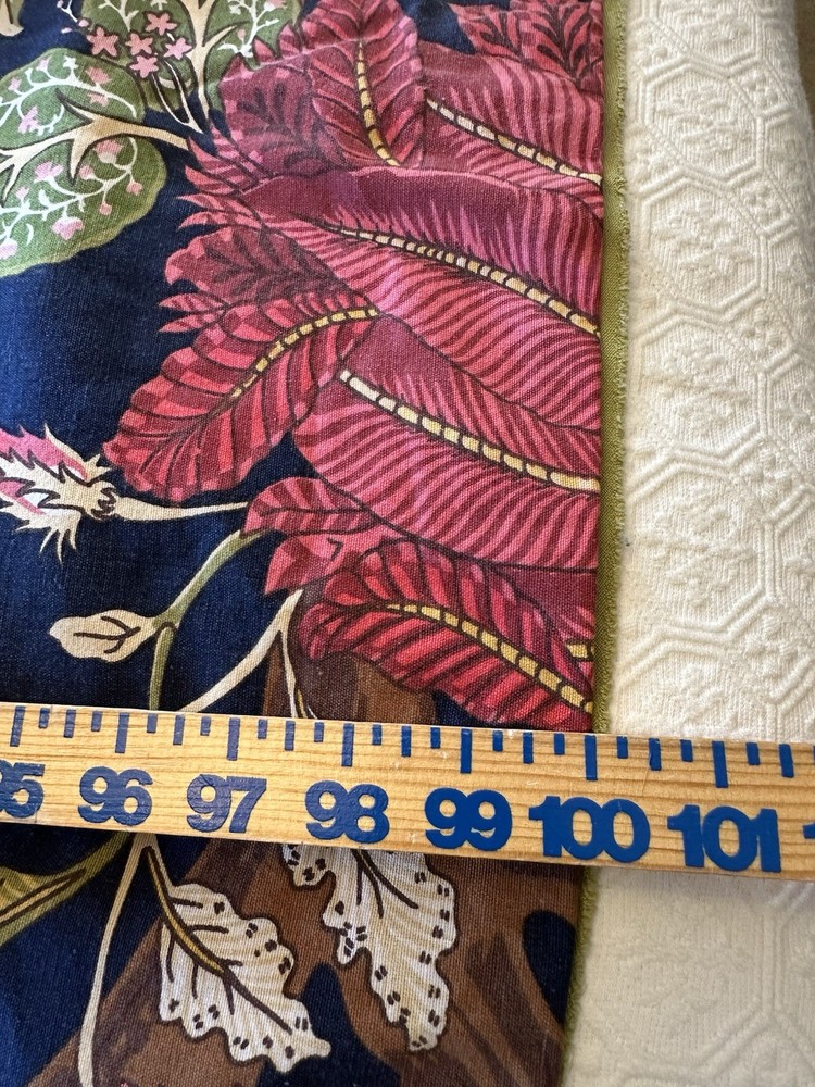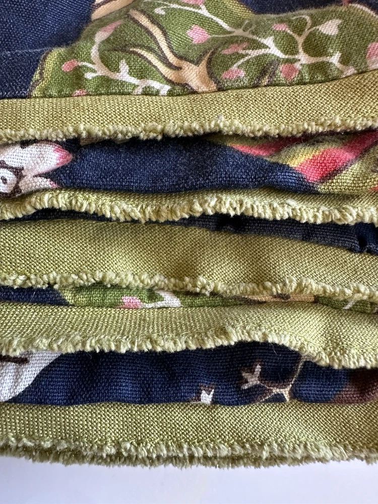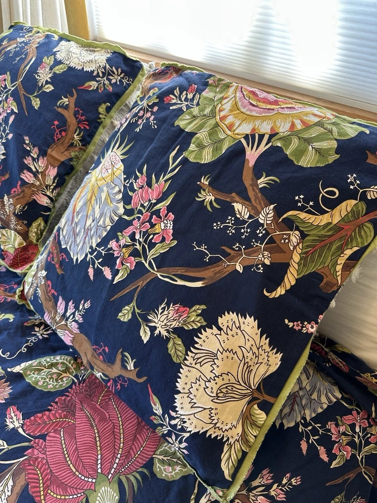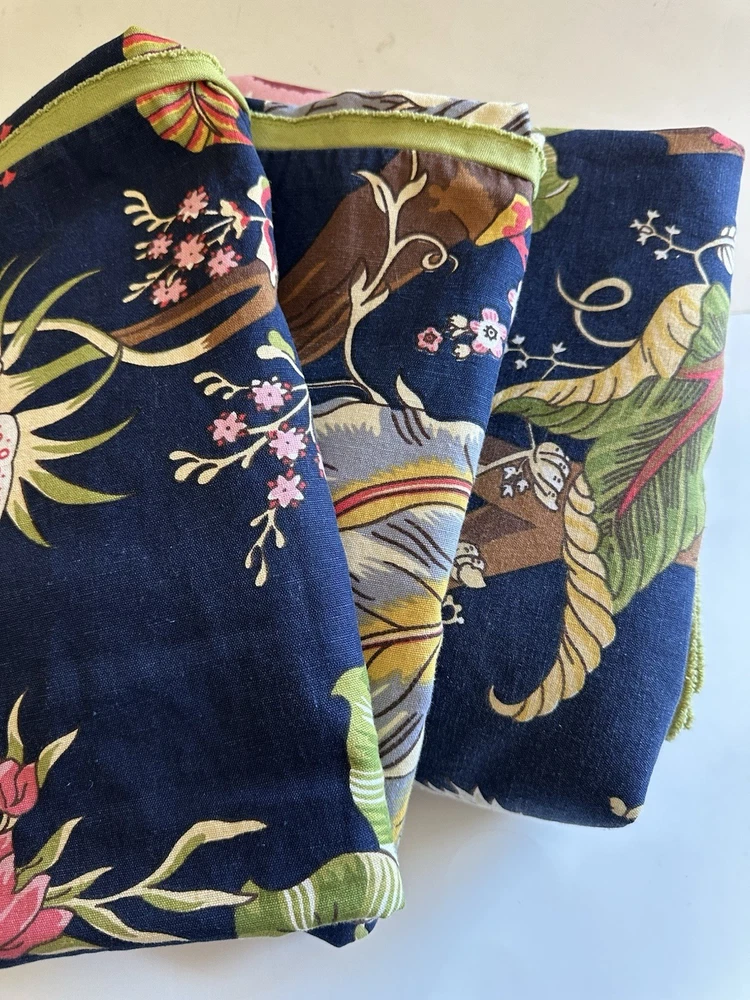 3PC Laina Palampore King Duvet Set with 2 Euro Shams. Gorgeous Jacobean Floral over a navy blue base. This pattern features a 'raw' edge, in an earthy Spring green. 85% Cotton, 15% Linen, made in India. Retired pattern and fairly hard to find. Reversible with identical fabric on both sides. Button enclosure. The 2 Euro Shams have an envelope opening in the back. King duvet size: 92"x108" Euro sham size: 26”x26” Excellent preowned condition with no rips, stains, fading, or obvious wear. Quite gorgeous.