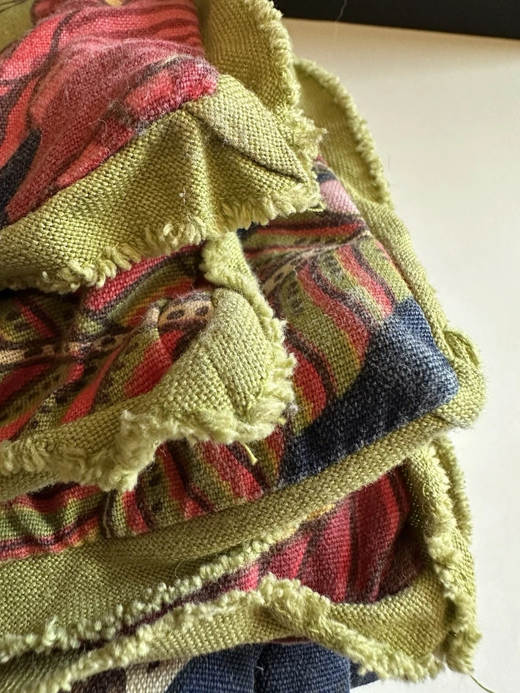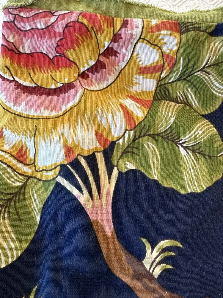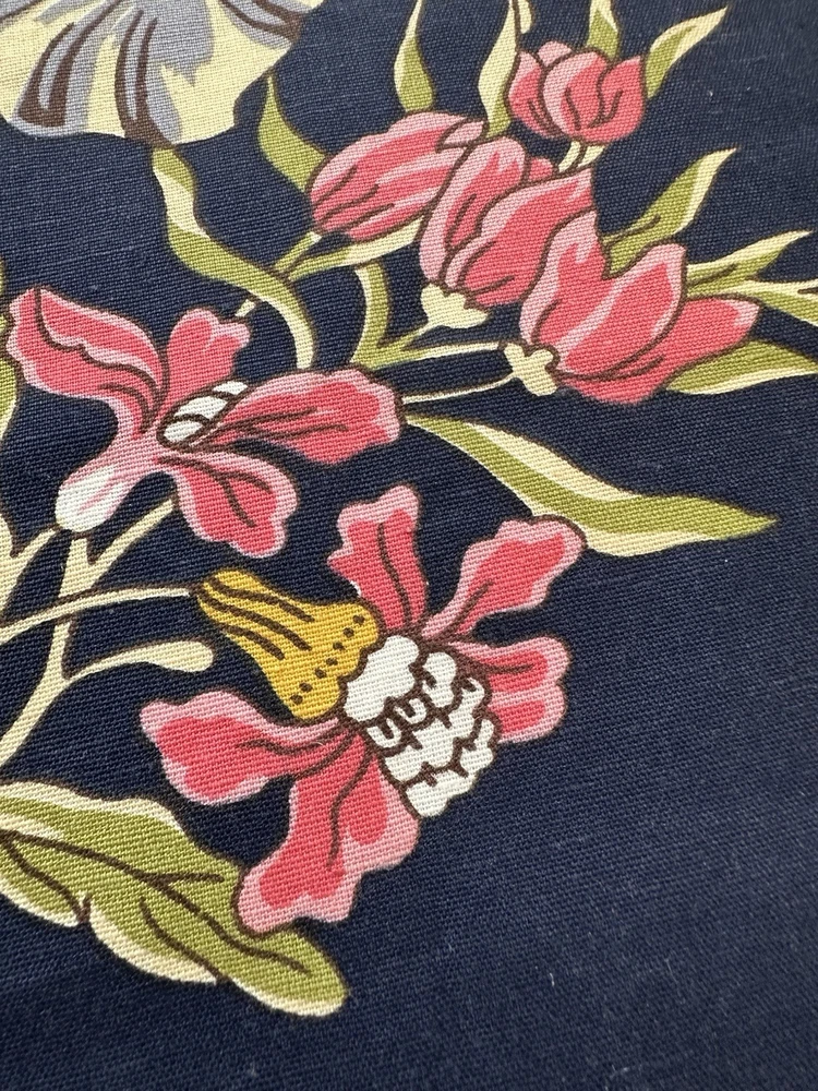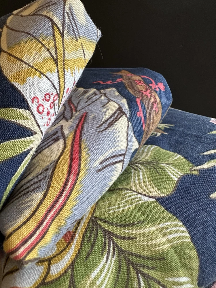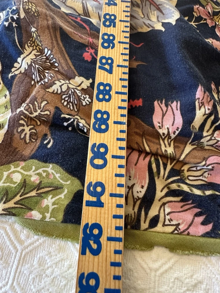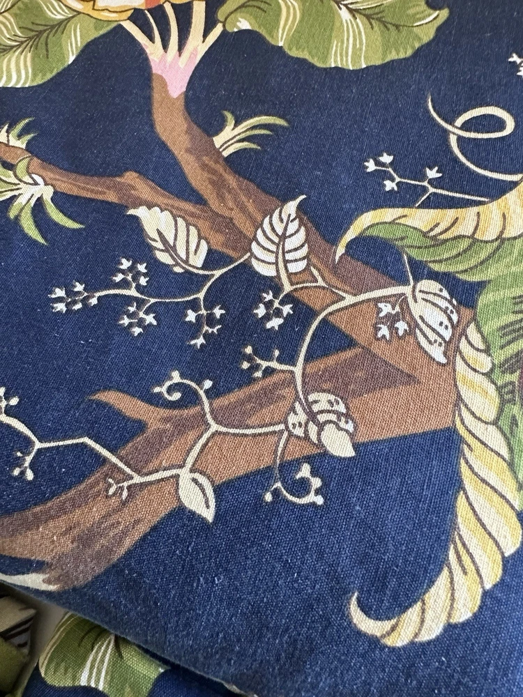 3PC Laina Palampore King Duvet Set with 2 Euro Shams. Gorgeous Jacobean Floral over a navy blue base. This pattern features a 'raw' edge, in an earthy Spring green. 85% Cotton, 15% Linen, made in India. Retired pattern and fairly hard to find. Reversible with identical fabric on both sides. Button enclosure. The 2 Euro Shams have an envelope opening in the back. King duvet size: 92"x108" Euro sham size: 26”x26” Excellent preowned condition with no rips, stains, fading, or obvious wear. Quite gorgeous.
