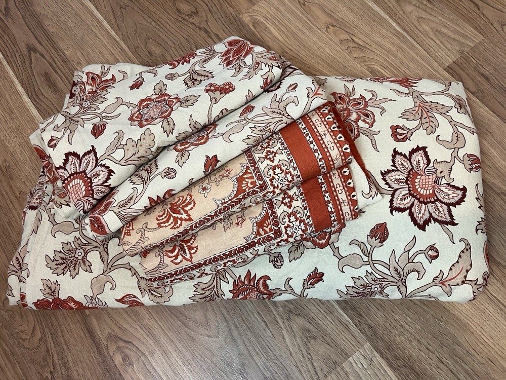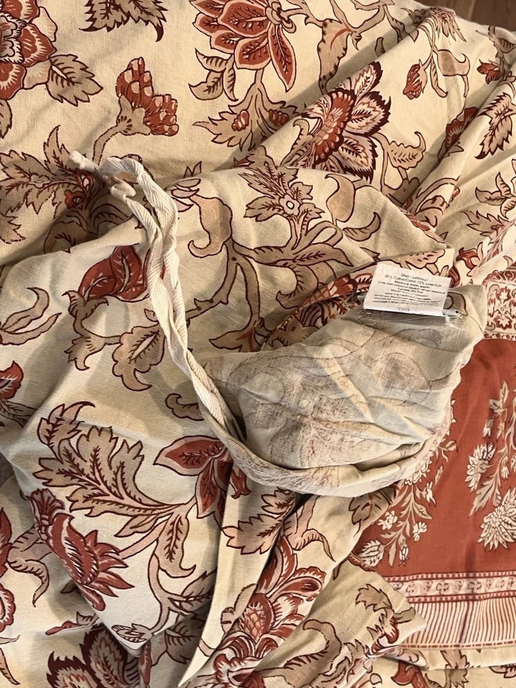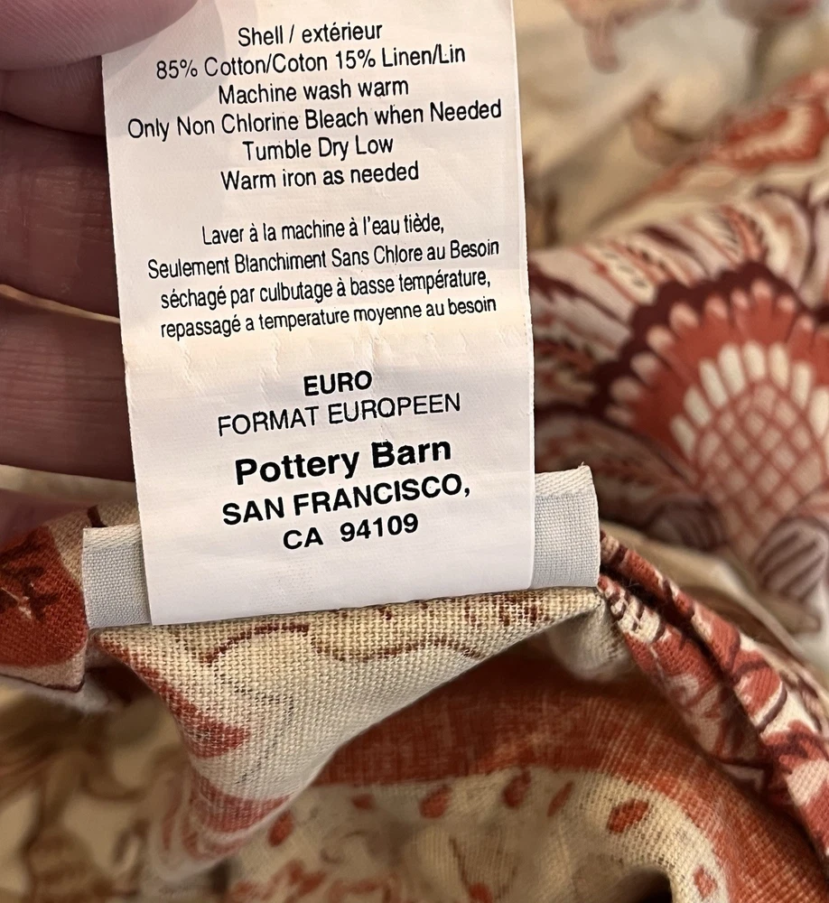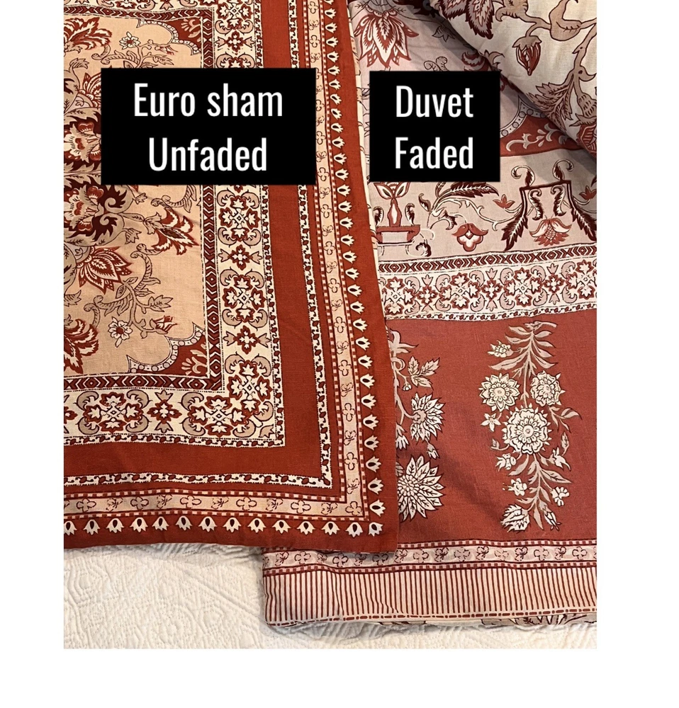 Set includes- 1 king duvet 2 euro shams 2 standard shams Duvet is button closure with interior ties, made of cotton and linen. It doesn't have any stains or holes but it has wash fade. See photo example of fade next to euro sham which wasn't washed as often and is the original color. Smoke free home