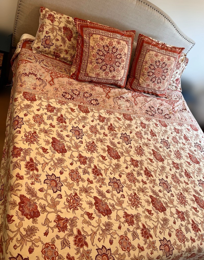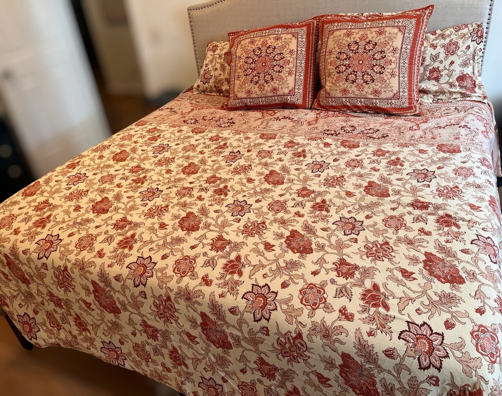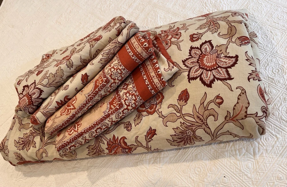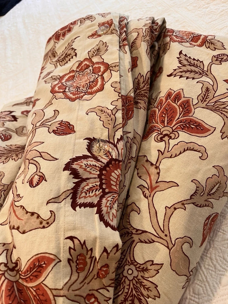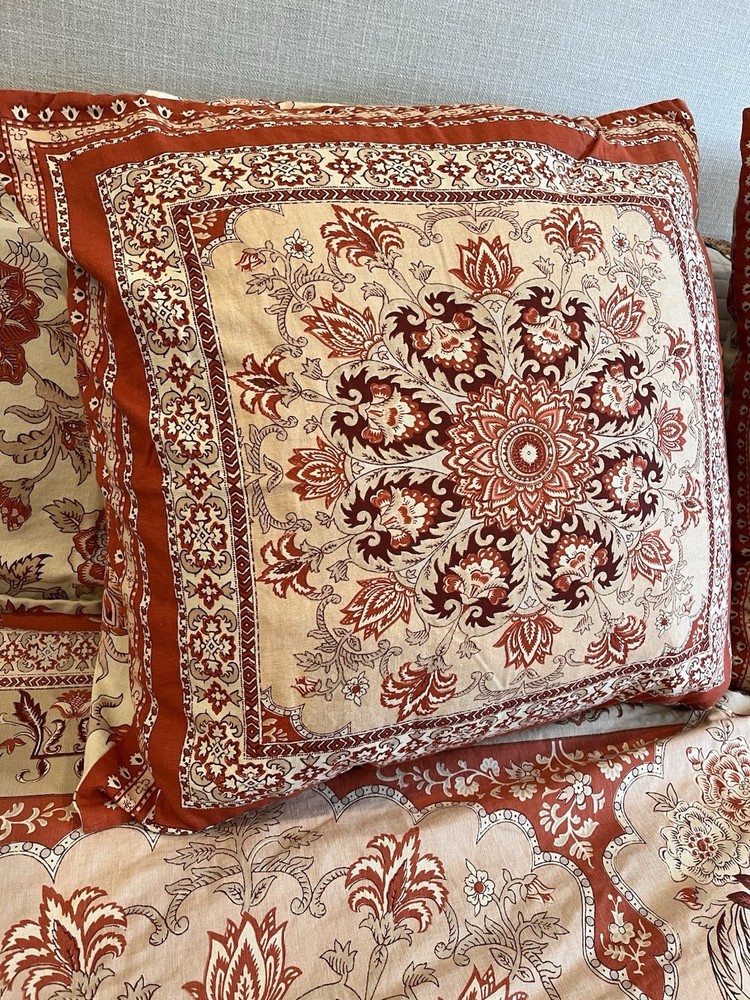 Set includes- 1 king duvet 2 euro shams 2 standard shams Duvet is button closure with interior ties, made of cotton and linen. It doesn't have any stains or holes but it has wash fade. See photo example of fade next to euro sham which wasn't washed as often and is the original color. Smoke free home