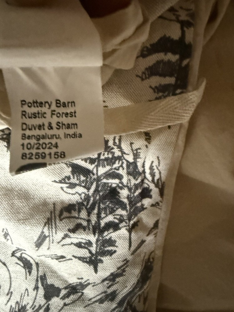 This is an open box item - could have been a store return - no known defects New without tags was the closest option to describe this item Wrap yourself in the coziness of the Pottery Barn King/Cal King Rustic Forest Duvet Cover, a perfect blend of nature-inspired charm and luxurious comfort. Adorned with a French Country style Rustic Forest pattern, this duvet cover brings the serenity of the outdoors into your bedroom. The natural multicolor palette ensures it complements a variety of decor themes and color schemes. Crafted from a high-quality blend of 50% cotton and 50% linen, this duvet cover promises breathability and durability. Measuring 92 inches in length and 108 inches in width, it fits King and Cal King beds perfectly. Designed for ease, it's machine washable, ensuring that maintaining its beauty is as simple as it is elegant.
