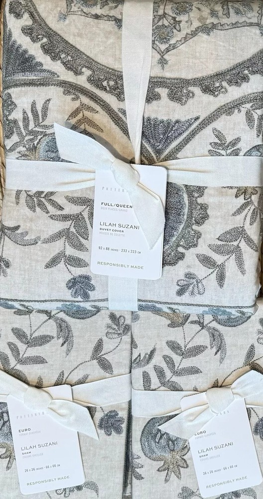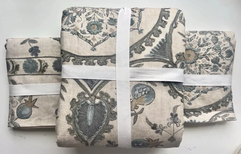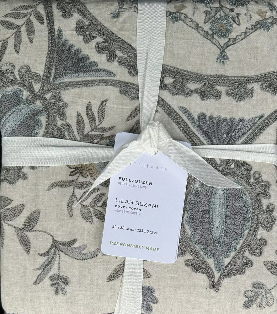 Offering a modern interpretation of a traditional suzani—embroidered textiles originating from Central Asia— duvet is the perfect balance of delicacy and drama. The antique-inspired design pops against a neutral ground, setting the tone for effortless layering. PRODUCT DETAILS CONSTRUCTION Made from 100% cotton. Reverses to same. By choosing our cotton products, you’re supporting our investment in Better Cotton’s mission. This product is sourced via mass balance and therefore may not contain Better Cotton. Duvet features a hidden button closure with inner ties that keep insert in place; sham features an envelope closure. Imported. CARE Machine wash in warm water separately on gentle cycle. Use only non-chlorine bleach, if needed. Line or tumble dry on a low temperature. Warm iron as needed. DIMENSIONS: Duvet: Full/Queen 92" x 88" Sham : Euro 26" x 26" Retail: $359