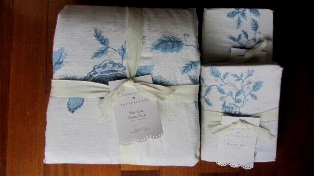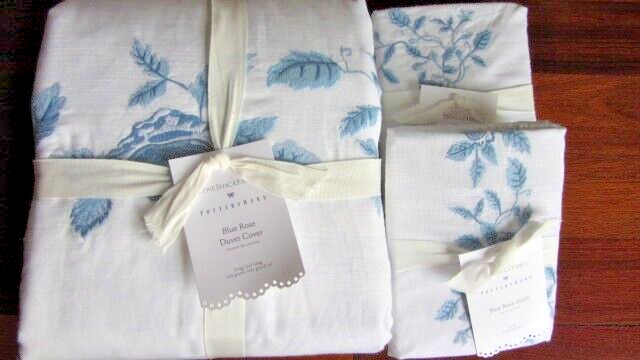 Crafted of cotton and trimmed with lace, this bedding adds instant charm to your space. Designed in collaboration with life style brand LoveShackFancy, it features romantic reversible design - finised with satin embroidered floral frame on one side and a wash of beautiful blue blooms on the other. Made from 100% cotton. Duvet features a hidden button closure with ties that keep insert in place. Shams features an envelope closure. Imported. King/Cal King duvet: 92" x 108" king Shams: 36" x 20'