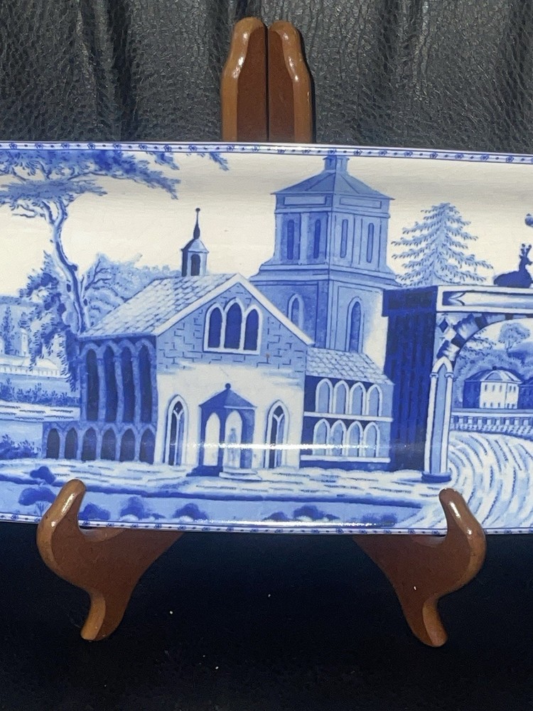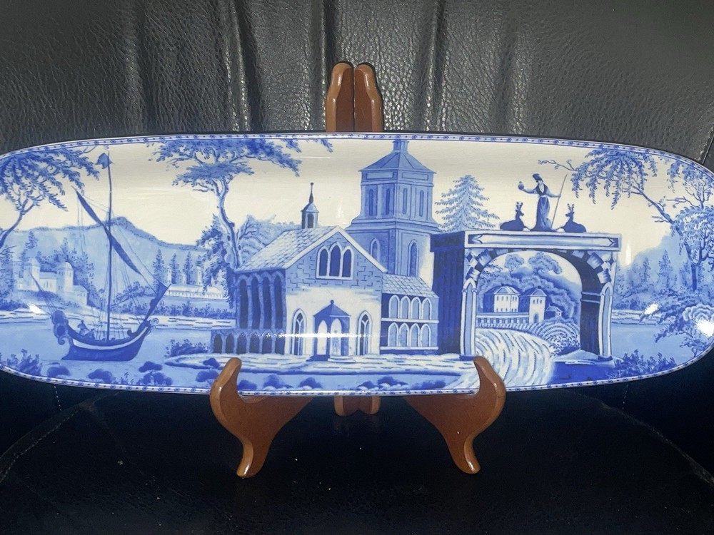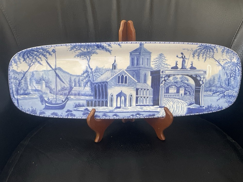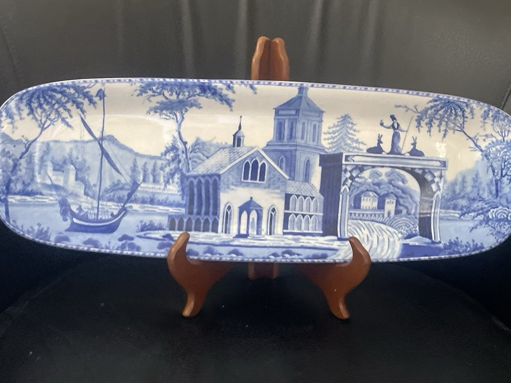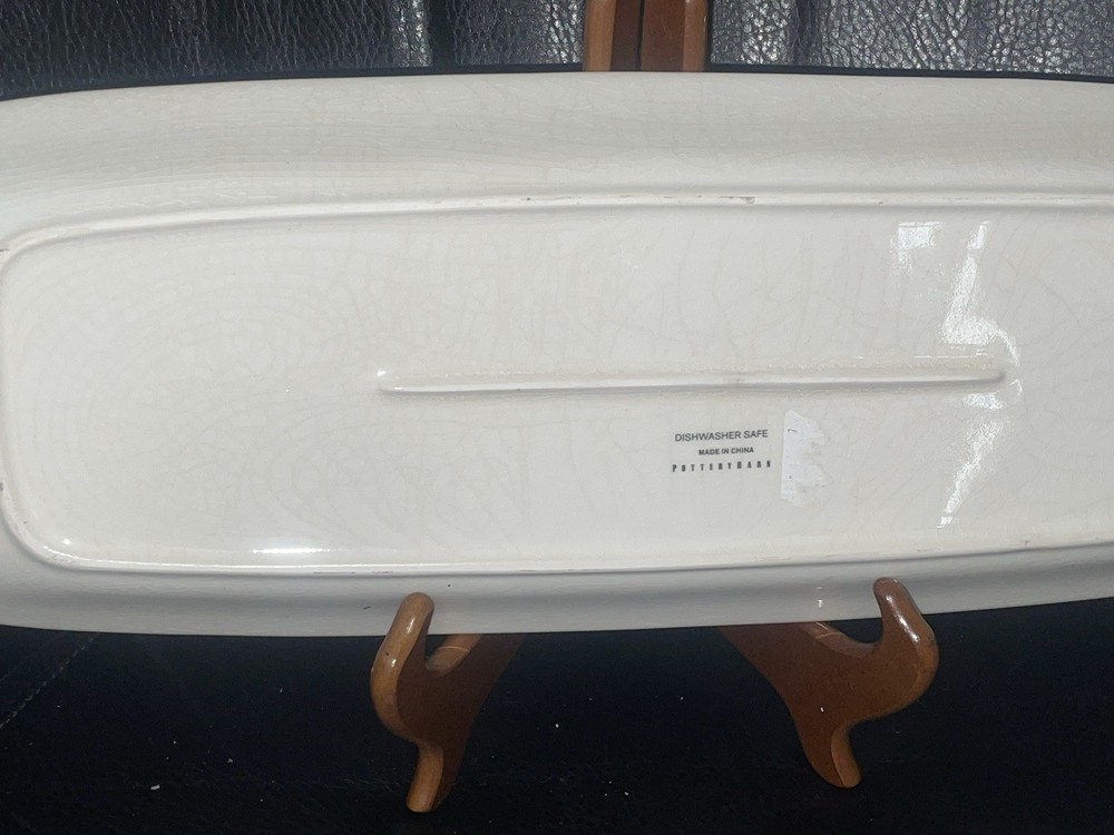 Pottery Barn SOPHIA 19.5" Rectangular Serving Platter, Long Narrow Oval Tray, Crazed Glaze Finish, Off-White with Blue Transfer Scene