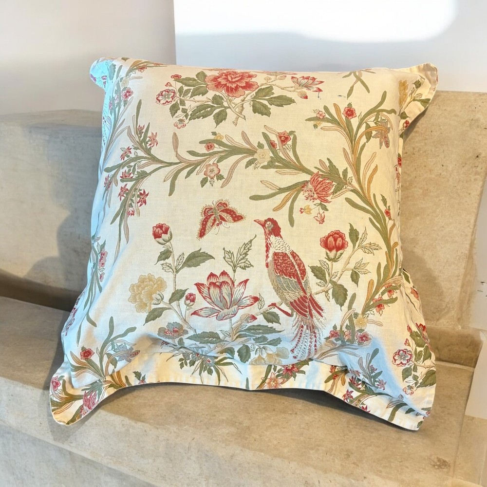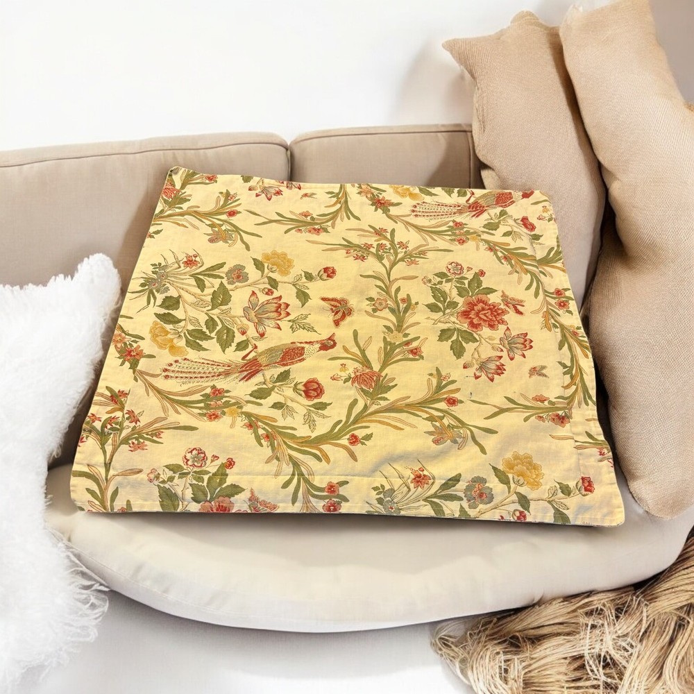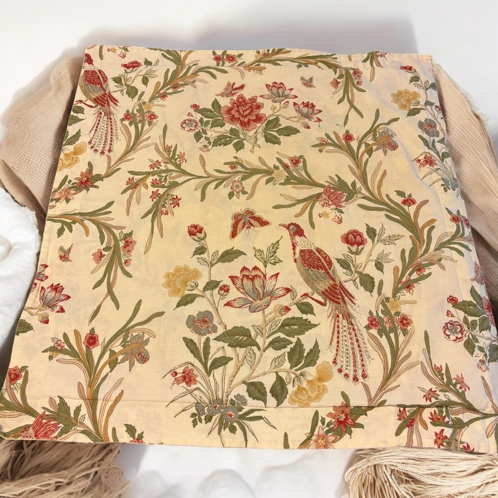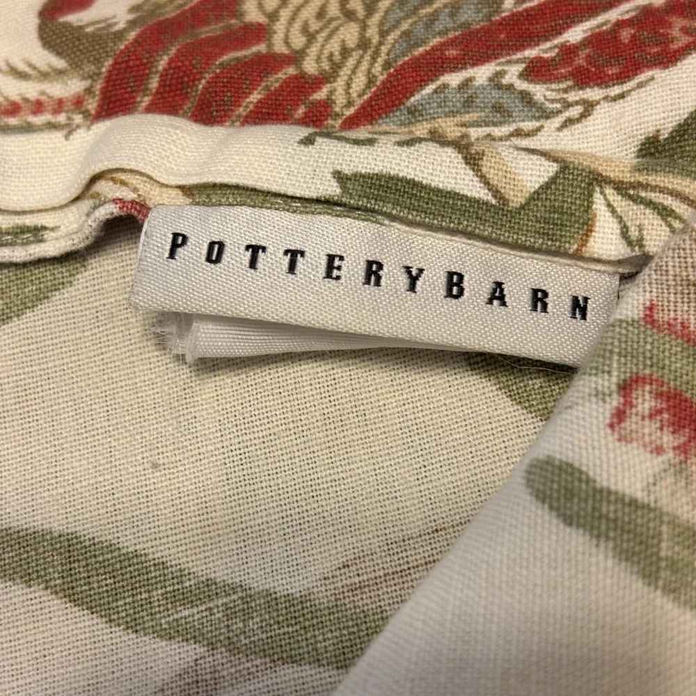 Butterflies Flowers- Green Red Yellow Gold- Display Pillow 21”x 20” Pillow Not Included- See Last Picture for Stain. This is a Pottery Barn Pillow Sham in a Tropical Exotic Birds pattern, made of a Cotton Linen blend. It is a Standard size measuring 29" in length and 27" in width, suitable for a bedroom with a Tropical theme. The multicolor design adds vibrancy to the room, perfect for those looking to incorporate a touch of nature into their decor.