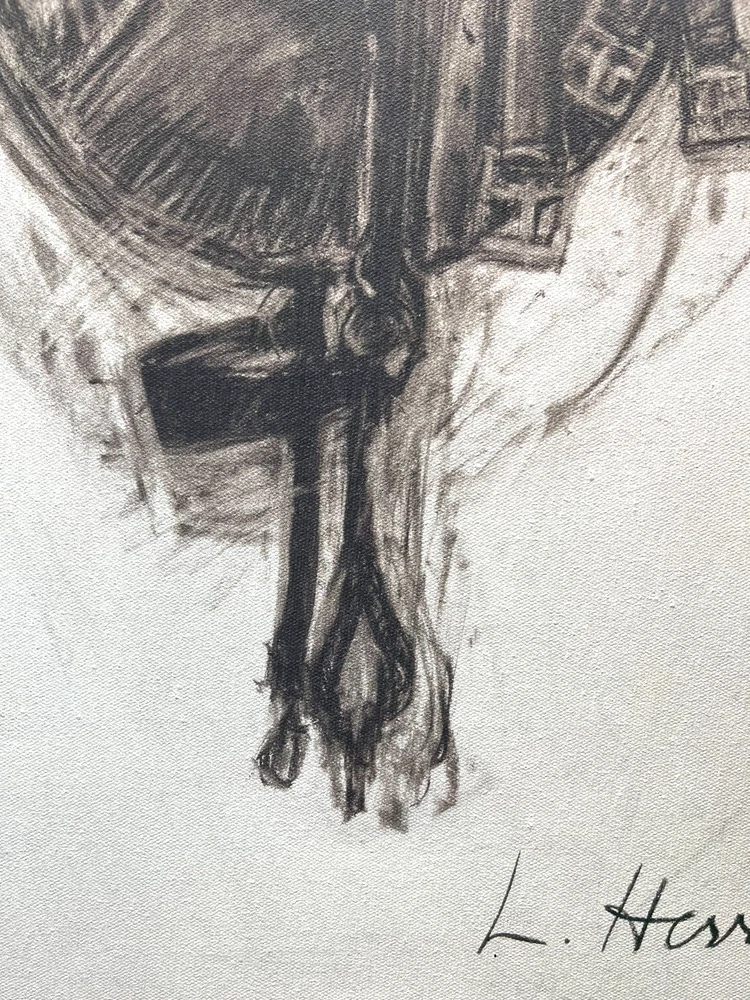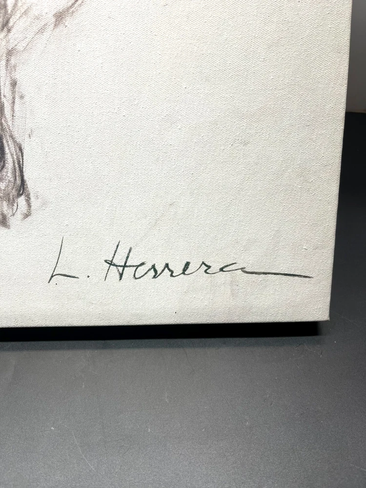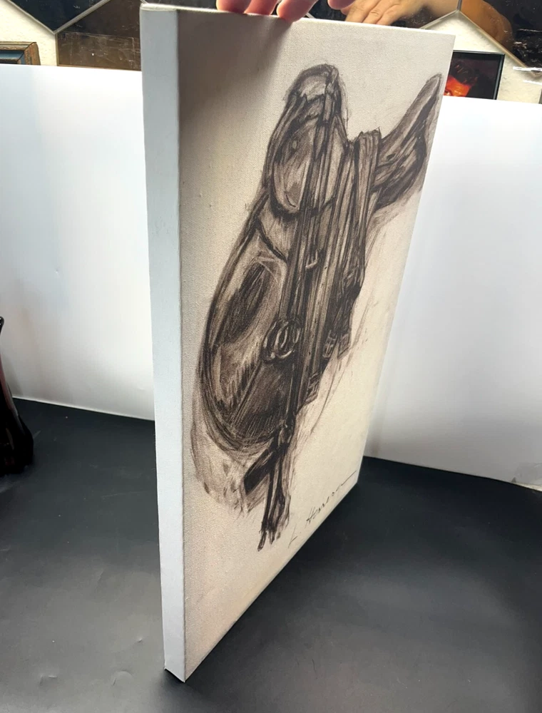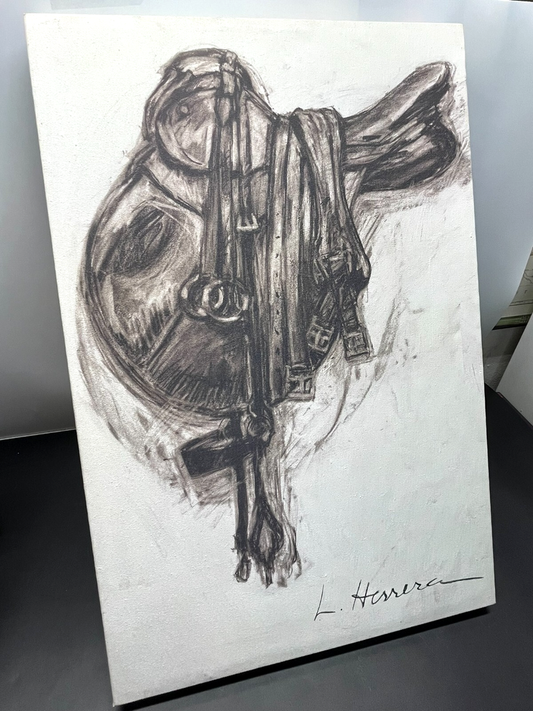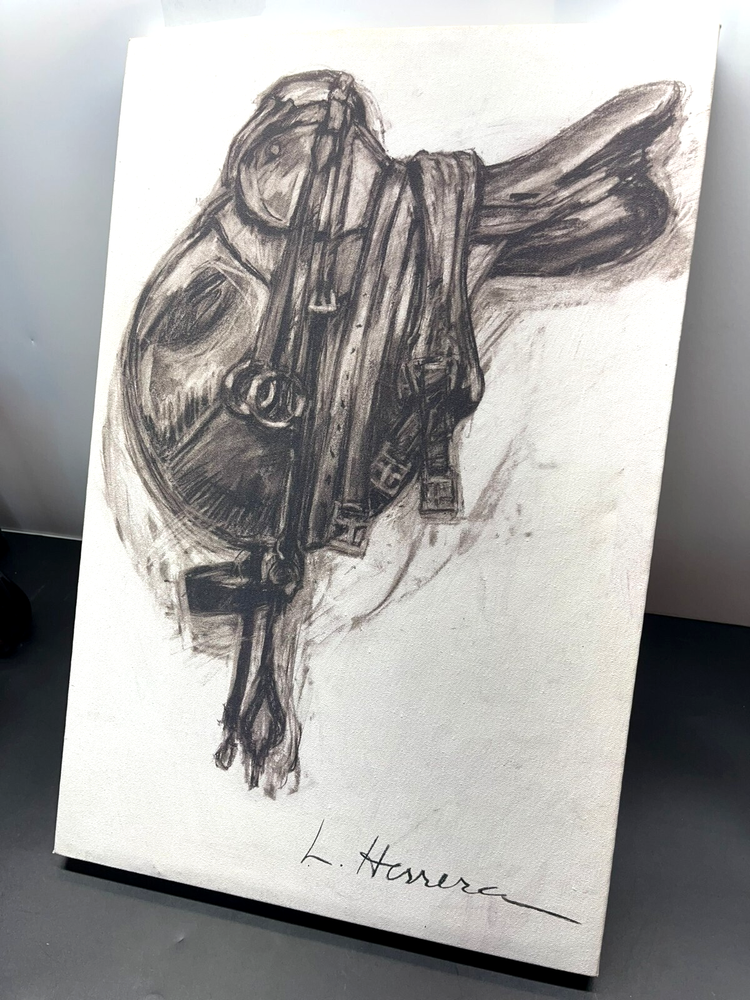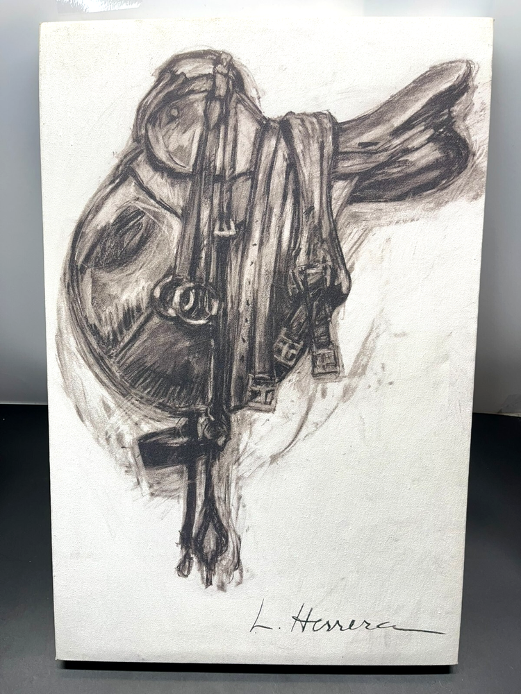 "Charcoal Saddle" by Lauren Herrera. Giclee print on canvas, gallery wrapped around sides. Impressionist drawing of Western horse saddle. Printed signature at bottom: L. Herrera. Originally from Pottery Barn. 22" long x 14.5" wide x 1" thick. Sawtooth hangers on back. Good pre-owned condition. There is a soft dent near middle right. A few rough and raised spots on the canvas, as made. The smudges marks are part of the original artwork.