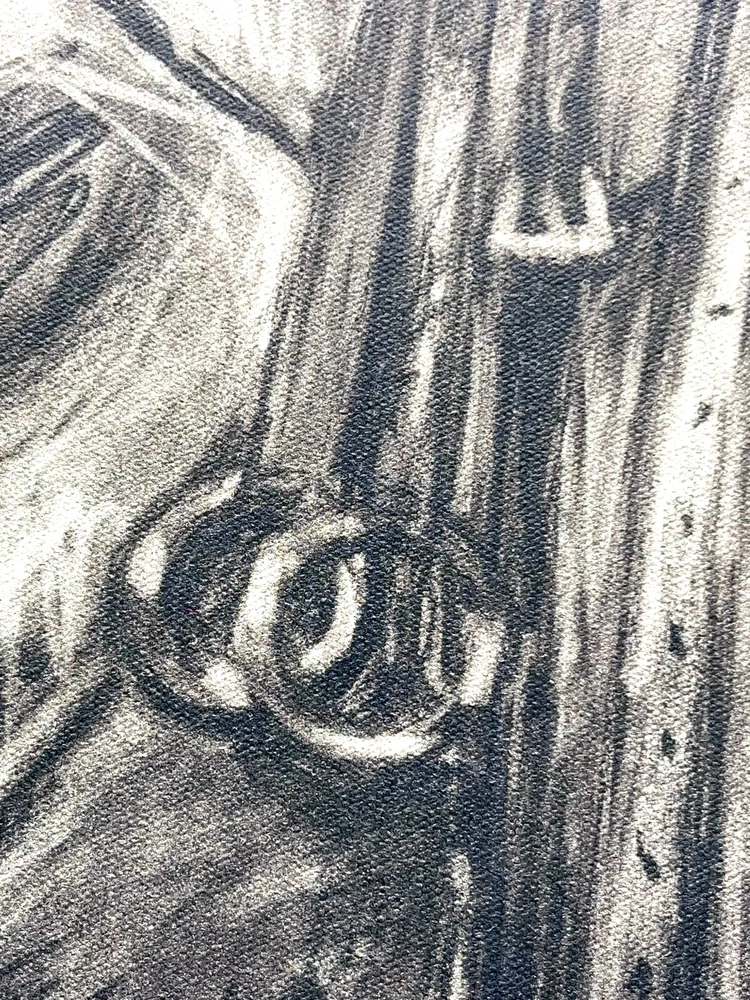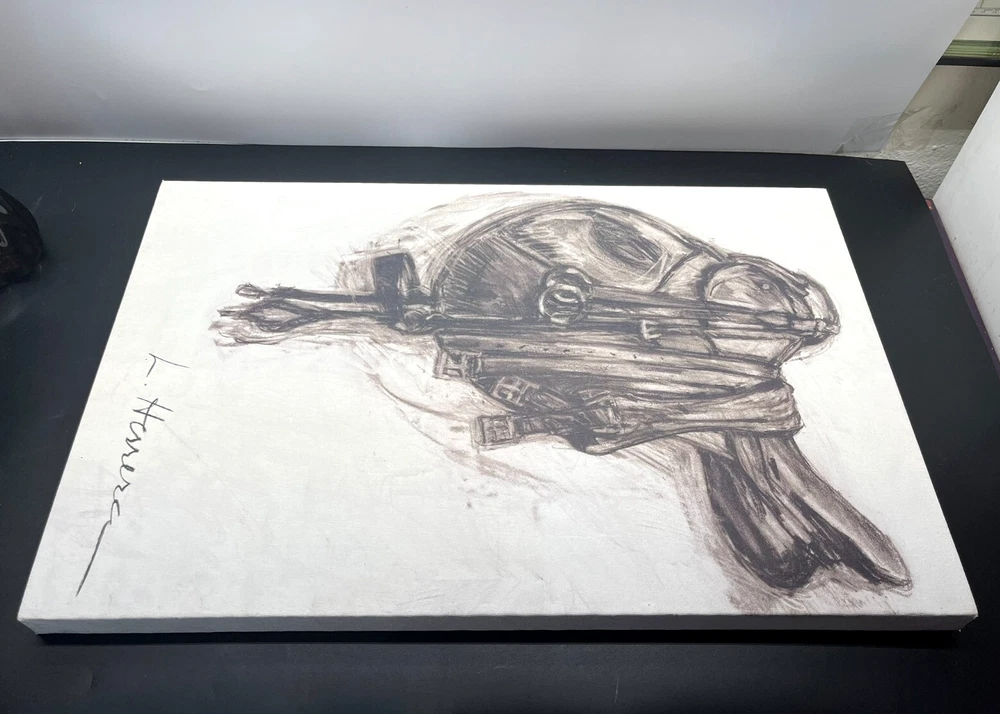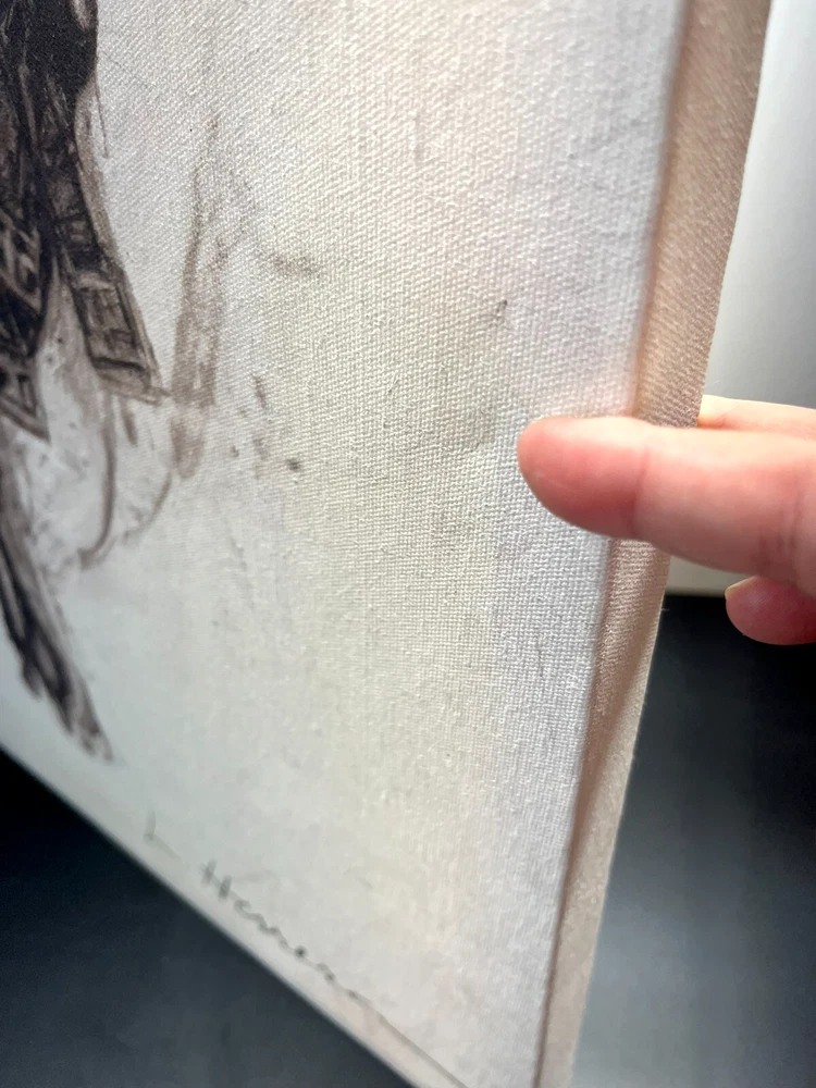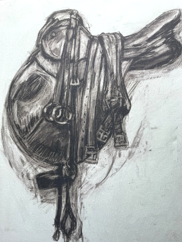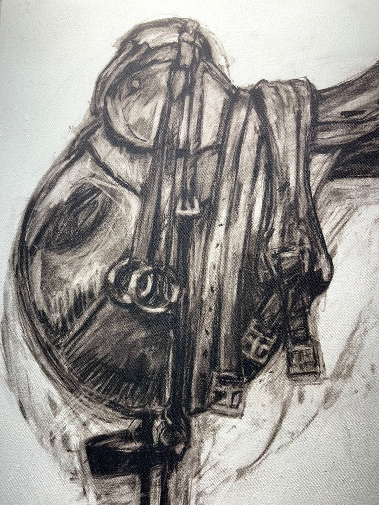 "Charcoal Saddle" by Lauren Herrera. Giclee print on canvas, gallery wrapped around sides. Impressionist drawing of Western horse saddle. Printed signature at bottom: L. Herrera. Originally from Pottery Barn. 22" long x 14.5" wide x 1" thick. Sawtooth hangers on back. Good pre-owned condition. There is a soft dent near middle right. A few rough and raised spots on the canvas, as made. The smudges marks are part of the original artwork.