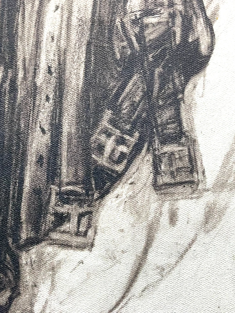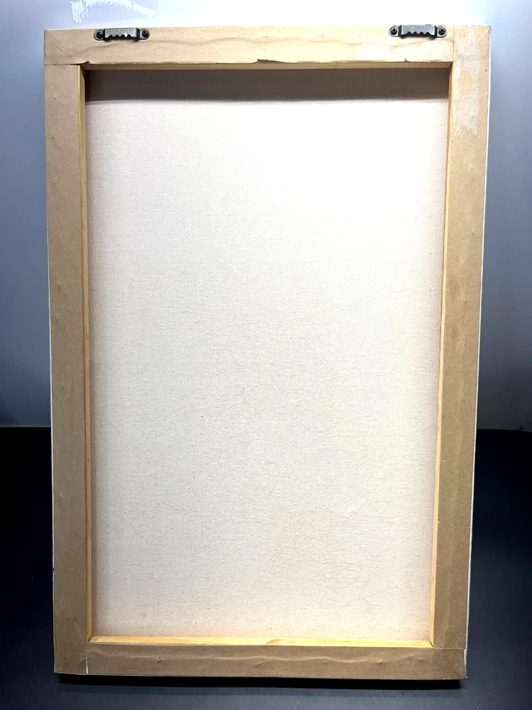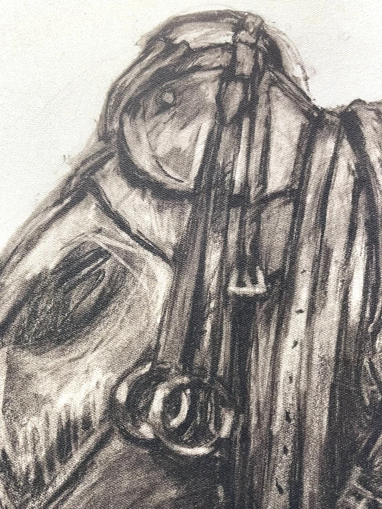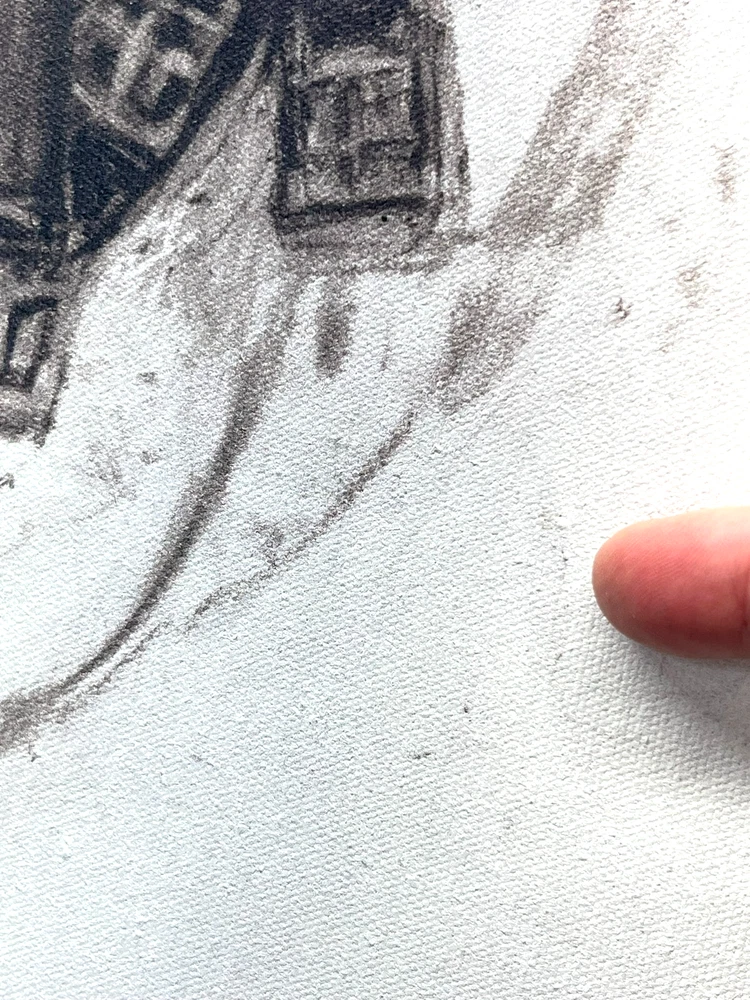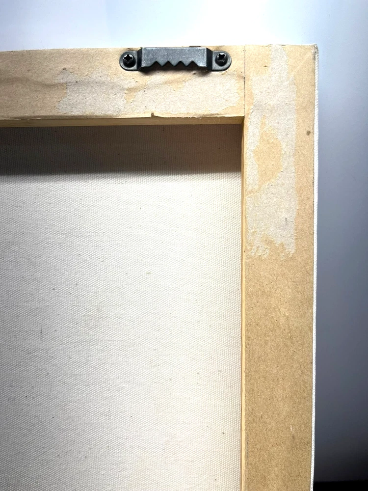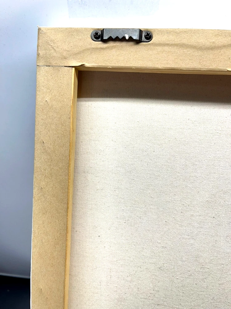 "Charcoal Saddle" by Lauren Herrera. Giclee print on canvas, gallery wrapped around sides. Impressionist drawing of Western horse saddle. Printed signature at bottom: L. Herrera. Originally from Pottery Barn. 22" long x 14.5" wide x 1" thick. Sawtooth hangers on back. Good pre-owned condition. There is a soft dent near middle right. A few rough and raised spots on the canvas, as made. The smudges marks are part of the original artwork.