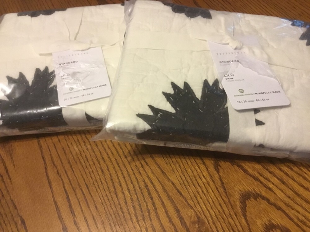 Add charm to your bedroom with this handcrafted Pottery Barn Lilo pillow sham set in white and charcoal color, made of 100% cotton fill material and quilted features. These standard-size shams are perfect for your bed and come with an envelope closure type. The beautiful Lilo pattern adds a touch of sophistication to your bedroom decor. These shams are brand new with tags and machine washable for easy care. They are perfect for those who love Pottery Barn's quality products and want to add a touch of elegance to their bedroom. Add these shams to your bedding collection and enjoy the softness and style they bring.
