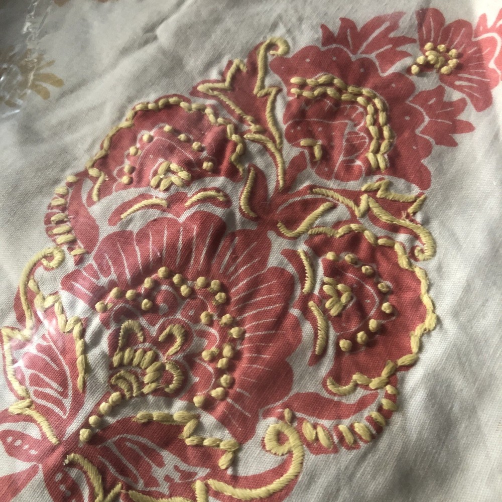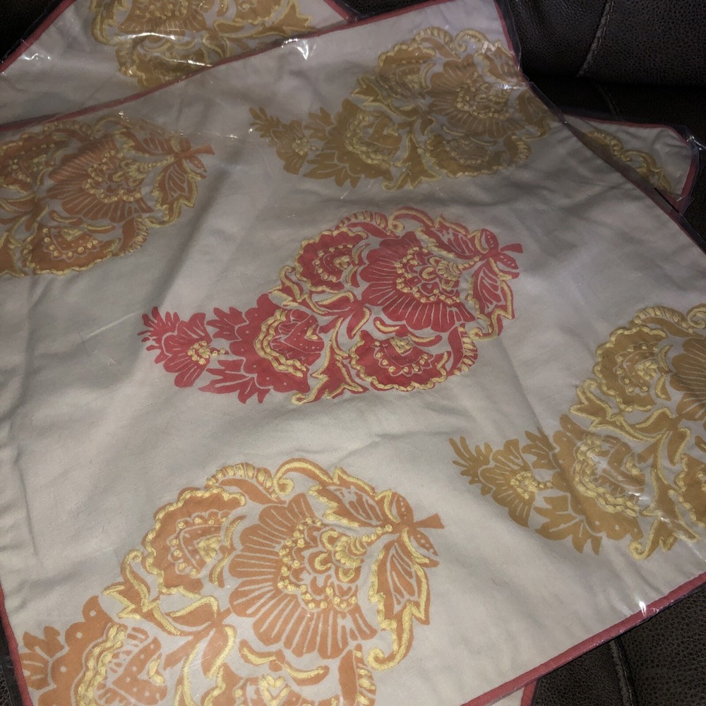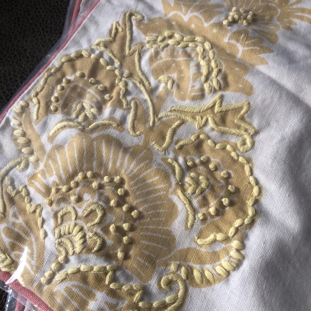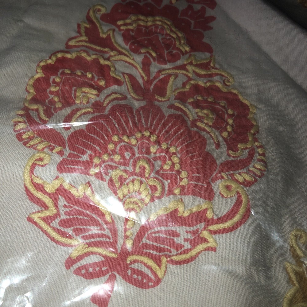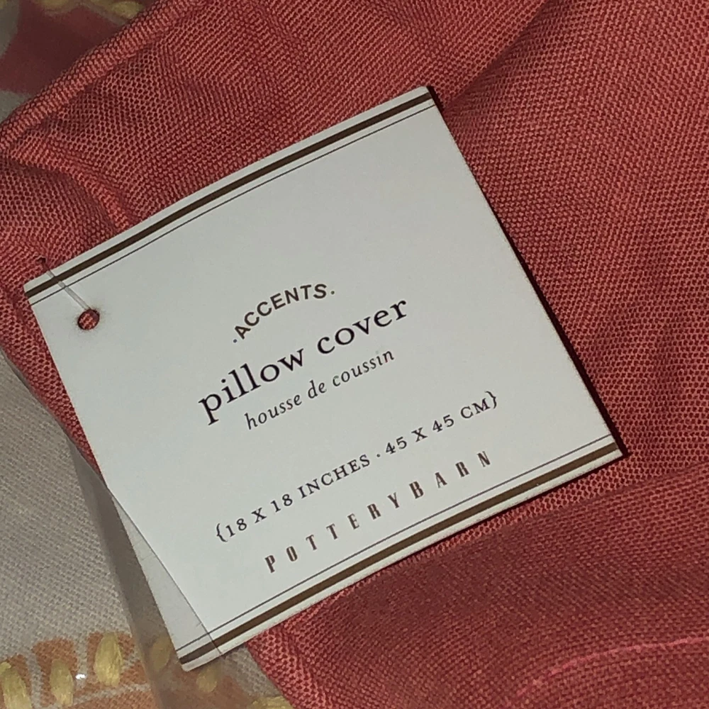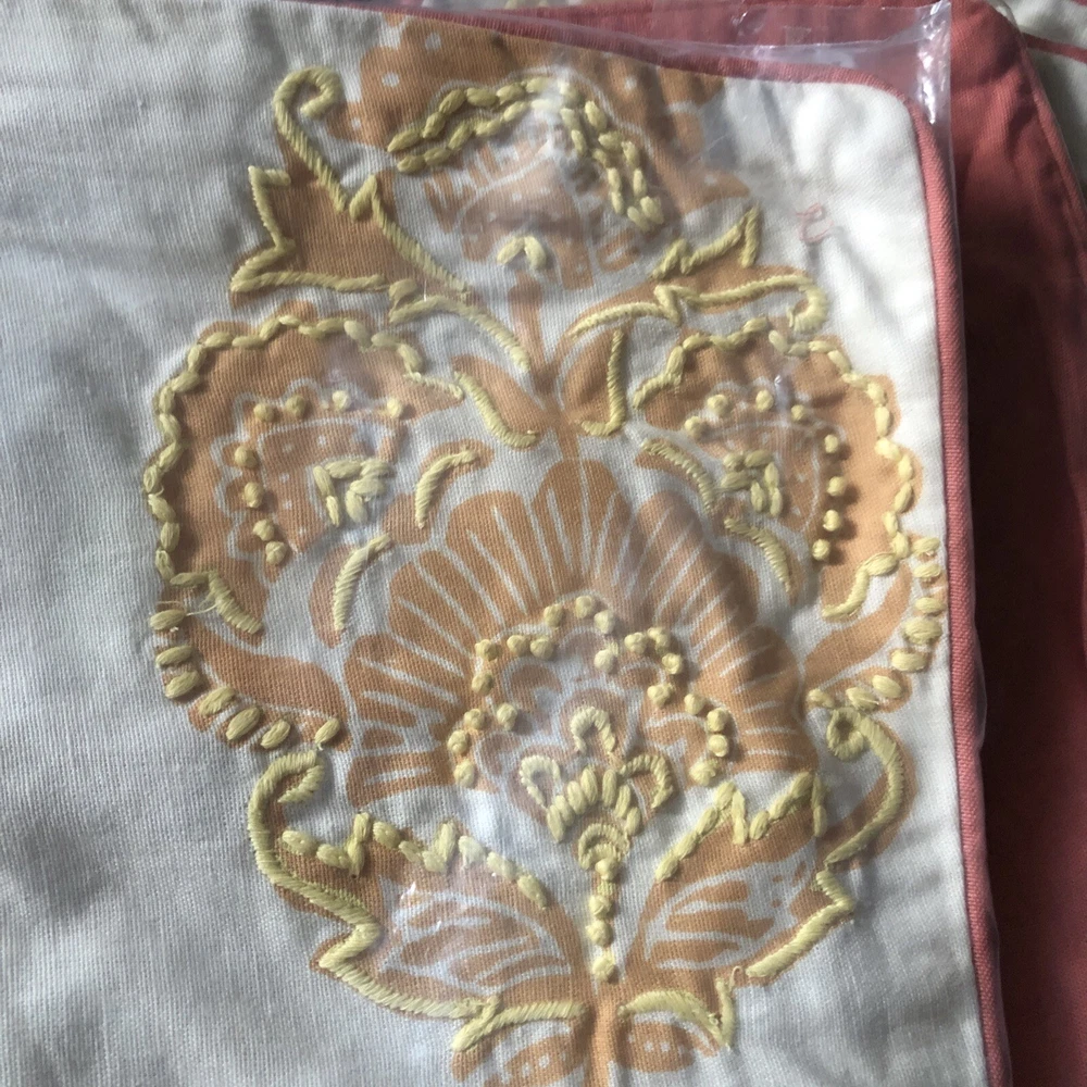 Pottery Barn Linen Blend Pillow Cover Yellow Salmon 18” x 18" NWT Embroidered. Two beautiful spring or summer Pottery Barn pillow covers. Floral design has embroidered stitching. See photos for more details including care instructions. Never used, still in original packaging. Comes from a clean, smoke free home.