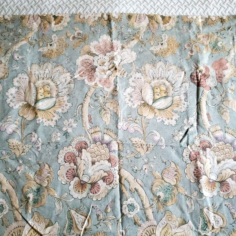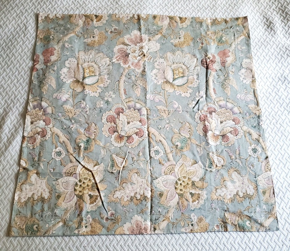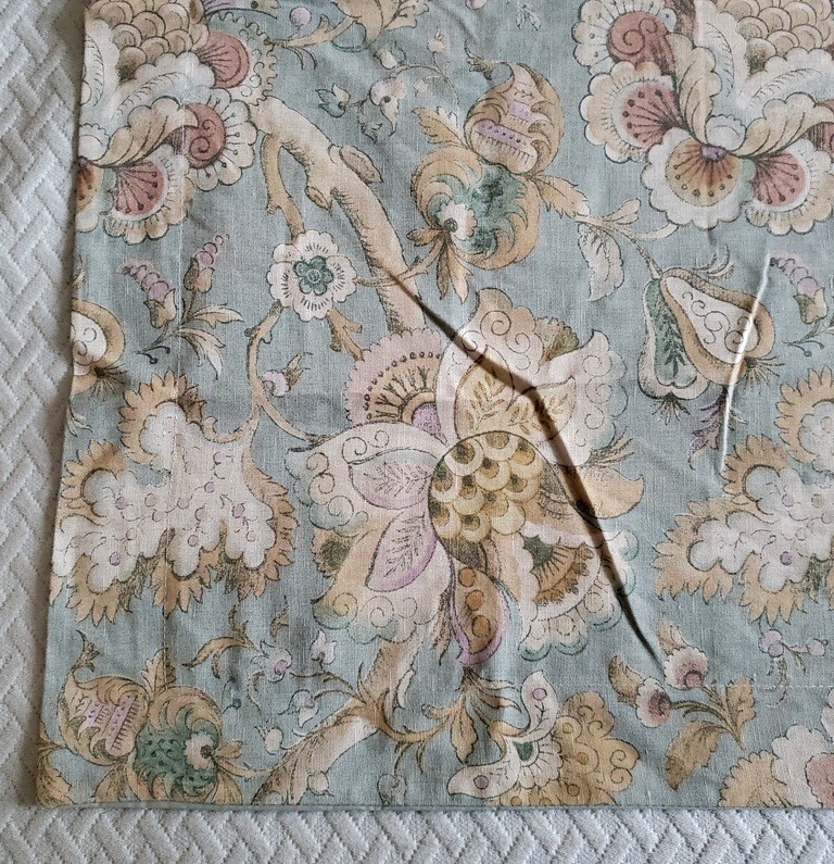 Beautiful linen-blend Euro sham by Pottery Barn, made in Israel. Lovely Jacobean flowers and fruit pattern softly colored in light blue and tan. Monochromatic light blue back. Blend of 45% linen and 55% cotton. Measures 30" by 30". In excellent condition, free of holes or stains. Buyer to pay for item plus shipping.