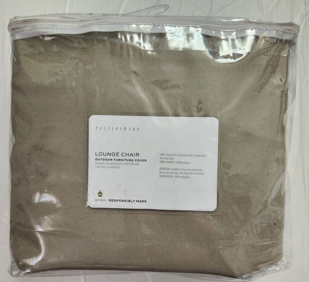 Item New in Pack With Tagged, ( 1-Cover ), as Shown on Photos. Pottery Barn Lounge Chair Universal Outdoor Furniture Protector Cover 32" Khaki Constructed of 100% polyester and polyvinyl chloride (PVC). Ties help secure the cover to the furniture pieces. Reinforced seams and substantial ties add durability. Built-in vents provide air circulation. Cover is water-repellent and approved for outdoor use. 32" Lounge Chair Cover fits our Cammeray, Chatham, Hampstead, Indio, Madera, Palmer, and Riviera Occasional Chairs. It also fits our Torrey Square-Arm Dining Chair.
