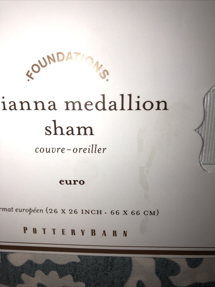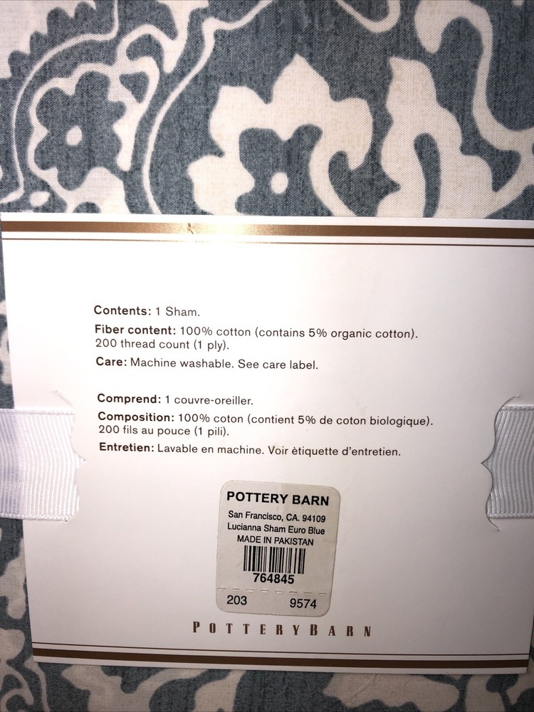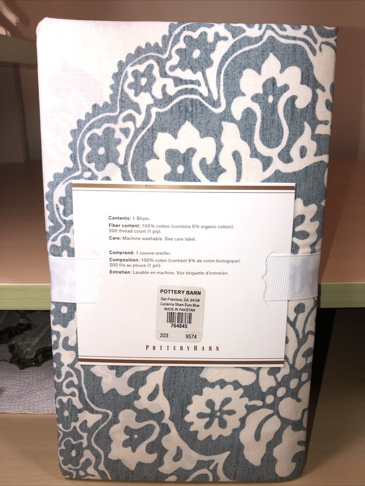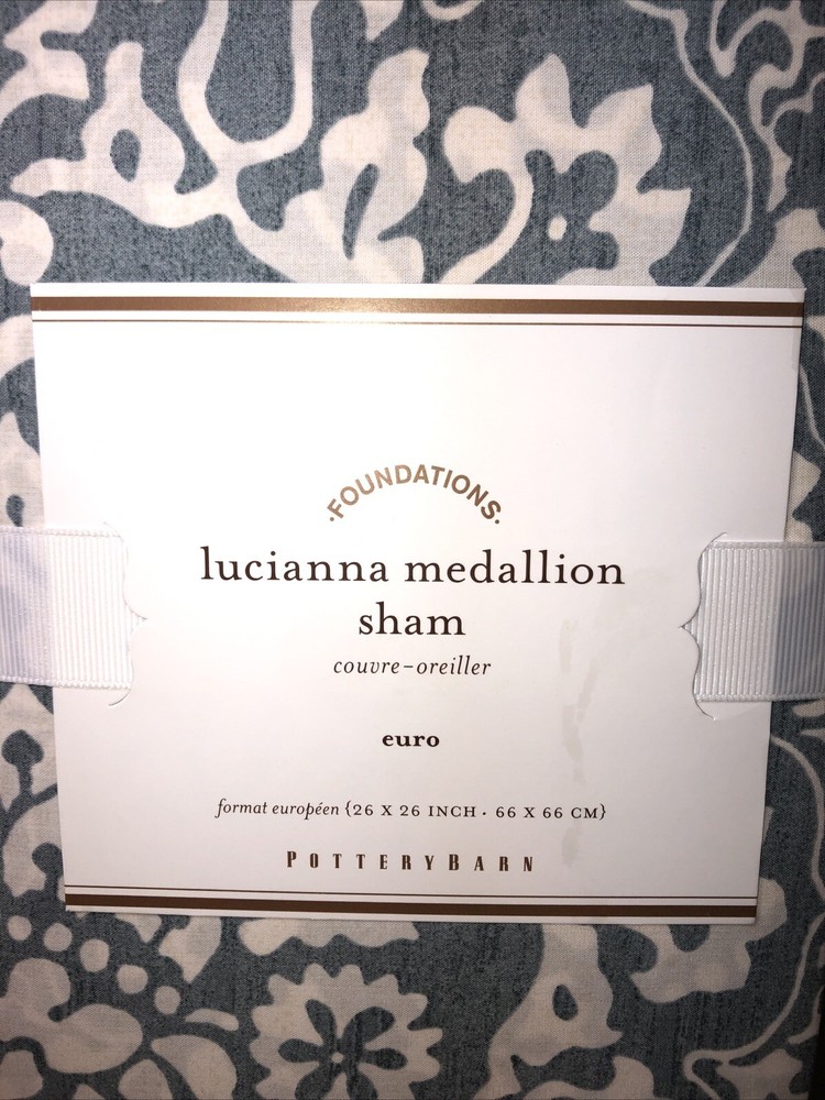 Add a touch of elegance to your bedroom with this beautiful Pottery Barn Lucianna Blue Floral Medallion Euro Sham. Made from 100% cotton, this sham is not only soft and comfortable but also durable. The intricate blue floral design will add a pop of color to your bedding and enhance the overall look of your room. Measuring 26x26 inches, this sham fits perfectly on a standard euro pillow. It is brand new and comes in its original packaging. There is slight wear to the packaging which does not affect the product.
