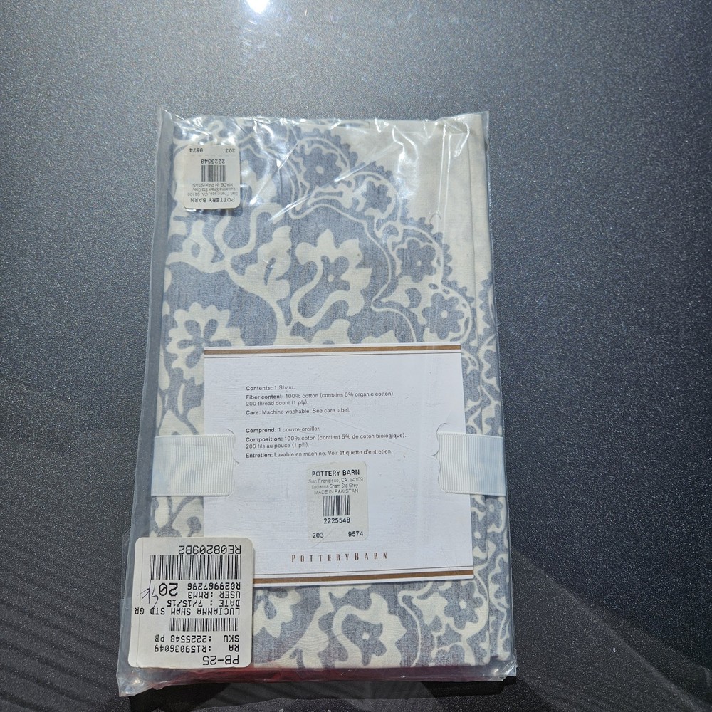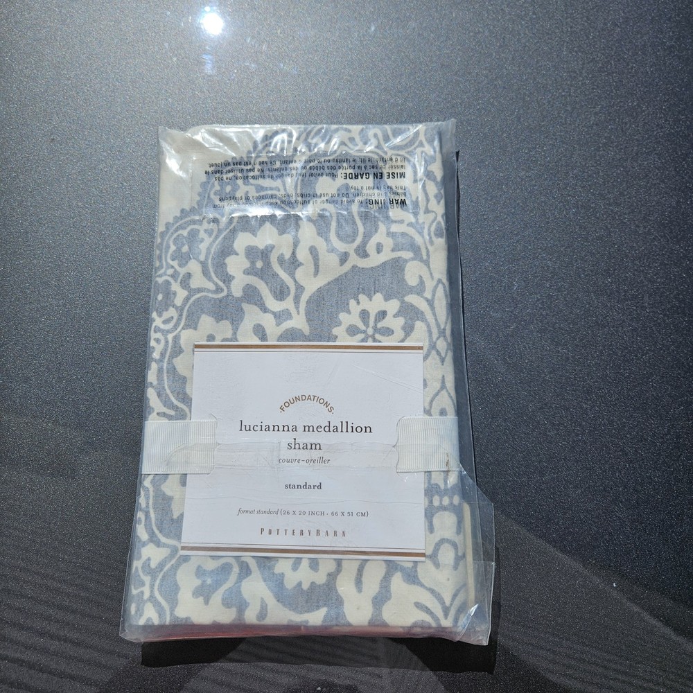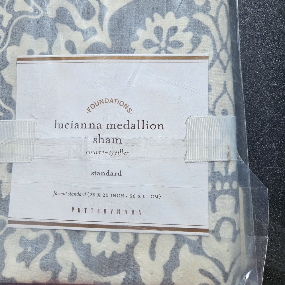 Elevate your bedroom with the elegance of the Pottery Barn Lucianna Medallion Standard Sham. Impeccably designed with a rich French Country medallion pattern, this king-size sham is a statement piece for any luxurious bedding ensemble. Crafted from 100% cotton, the sham promises breathable comfort and lasting durability. The sham features a versatile gray color that complements a myriad of decor styles, while the machine-washable fabric ensures easy care. Measuring 26 inches in length and 20 inches in width, it fits seamlessly onto your bed, adding a touch of sophistication to your sleeping space.