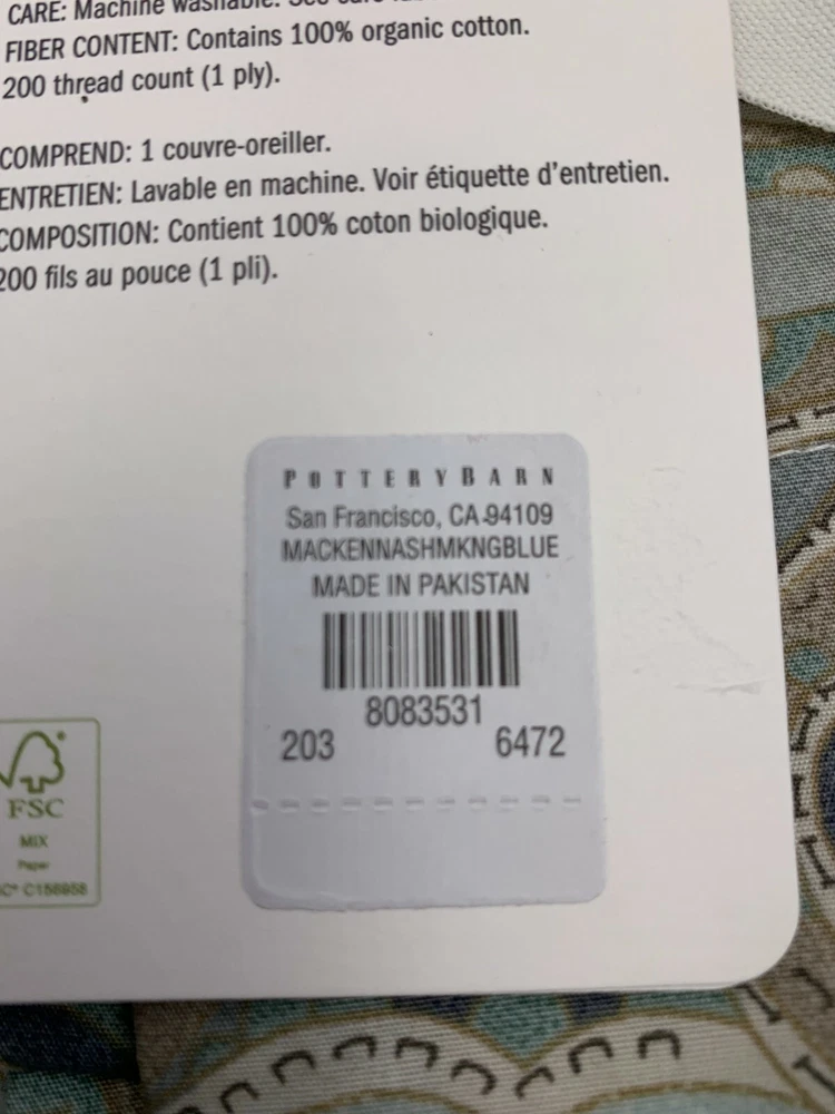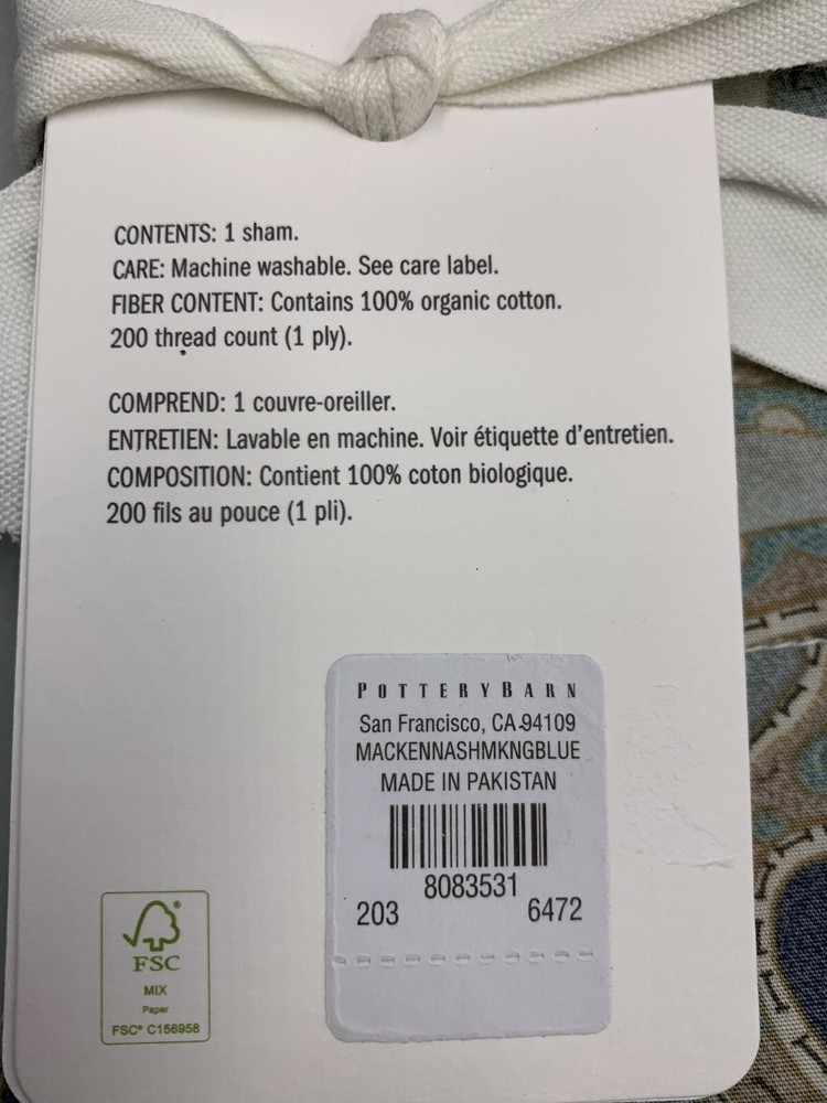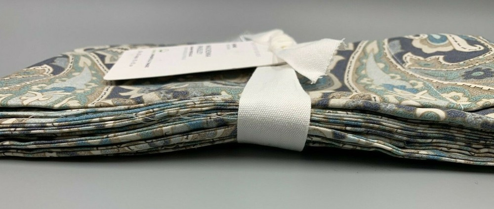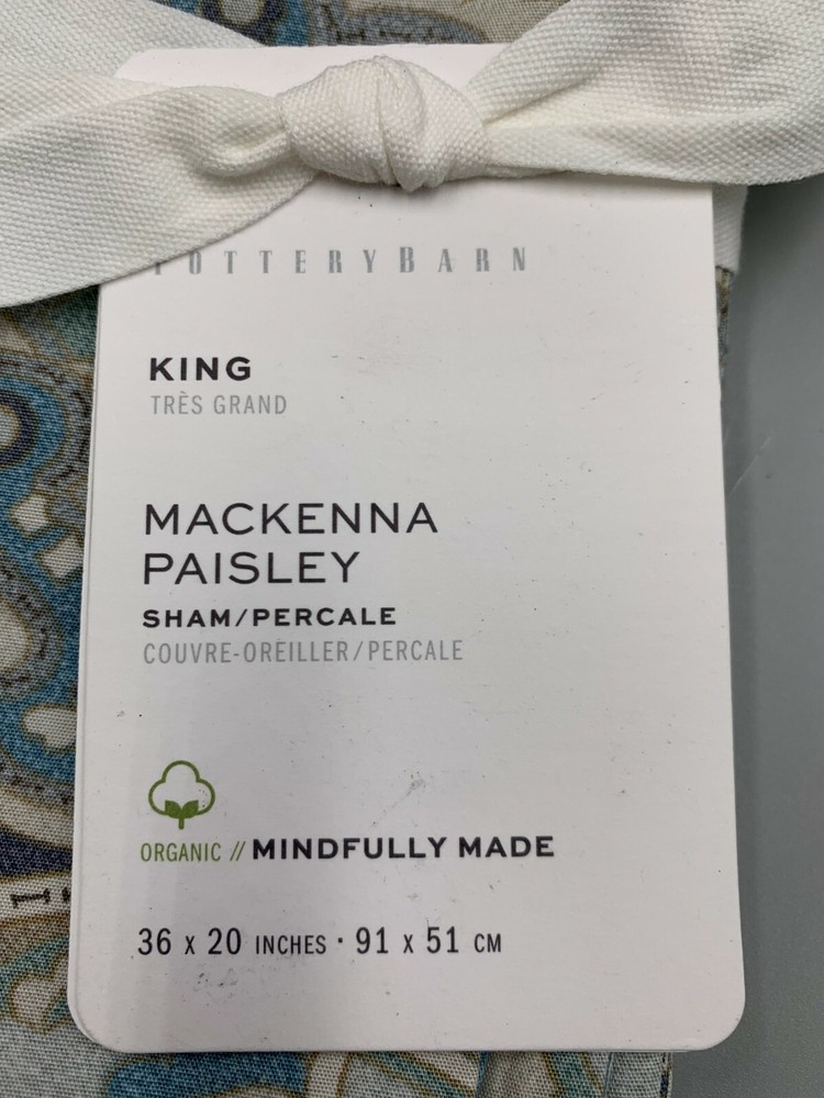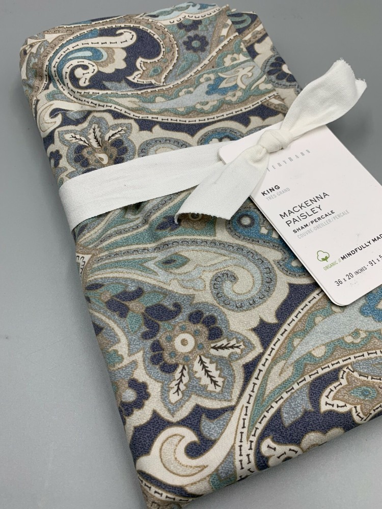 Pottery Barn Mackenna Paisley Percale Sham King Blue Multi Item is brand new. Auction includes 1 sham. Made of 100% cotton. Sham reverses to same. Sham features an envelope closure. Machine wash. Imported. DIMENSIONS King: 20" h x 36" w CARE AND MAINTENANCE Machine wash in warm water; gentle cycle. Use only non-chlorine bleach when needed. Tumble dry on low heat; remove promptly. Warm iron as needed.