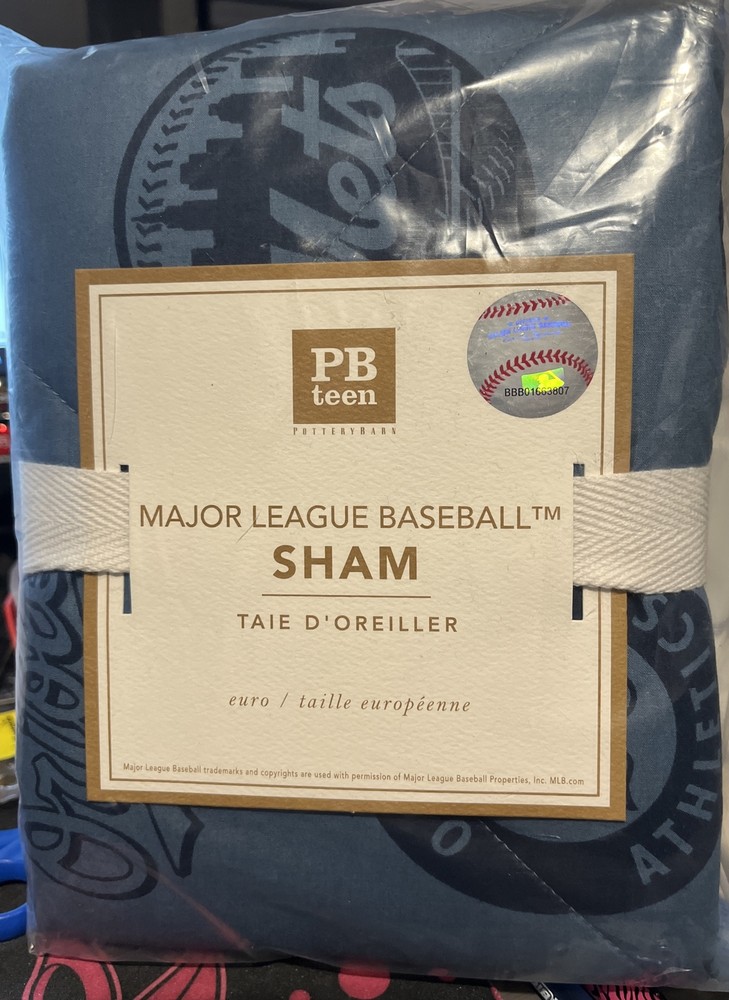 Show off your love for baseball with this brand new Pottery Barn Major League Baseball Sham in standard size. The vibrant blue color and baseball-inspired style make it perfect for any baseball lover's bedroom. Made of 100% cotton, this pillow sham is soft and comfortable to sleep on. It's machine washable, so it's easy to maintain its fresh look and feel. Use it to complete your baseball-themed bedding set or add a pop of color to your room. Don't miss out on this unique and high-quality piece from Pottery Barn.