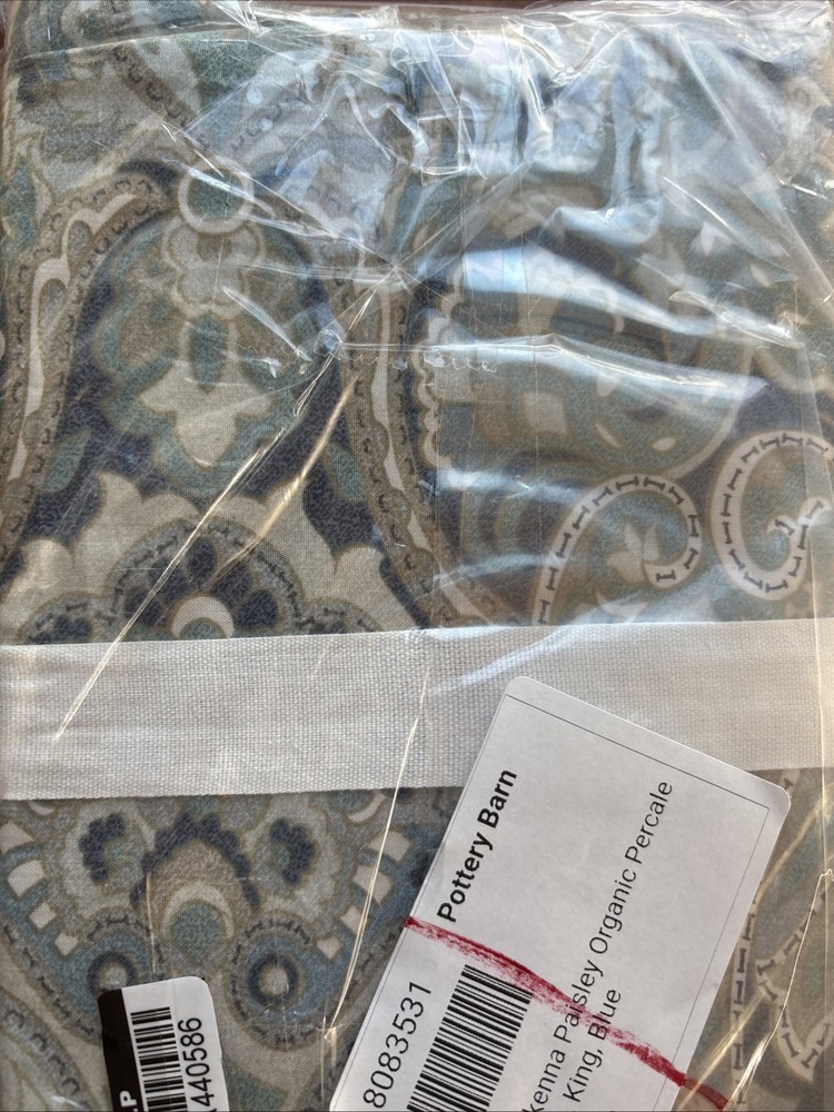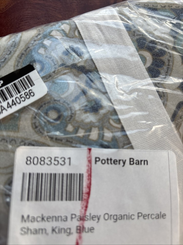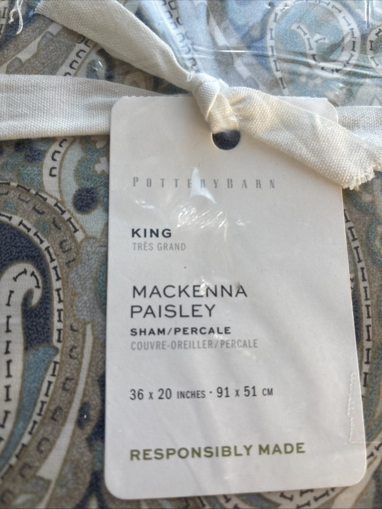 The Pottery Barn Makenna Paisley Percale Sham in size King is a bedroom essential that adds a touch of elegance to any bedroom decor. The blue paisley pattern on percale material gives it a sophisticated and stylish look, fitting seamlessly with a variety of bedroom themes. This sham, measuring 20" in length and 36" in width, is perfect for enhancing the comfort and style of your sleeping space.