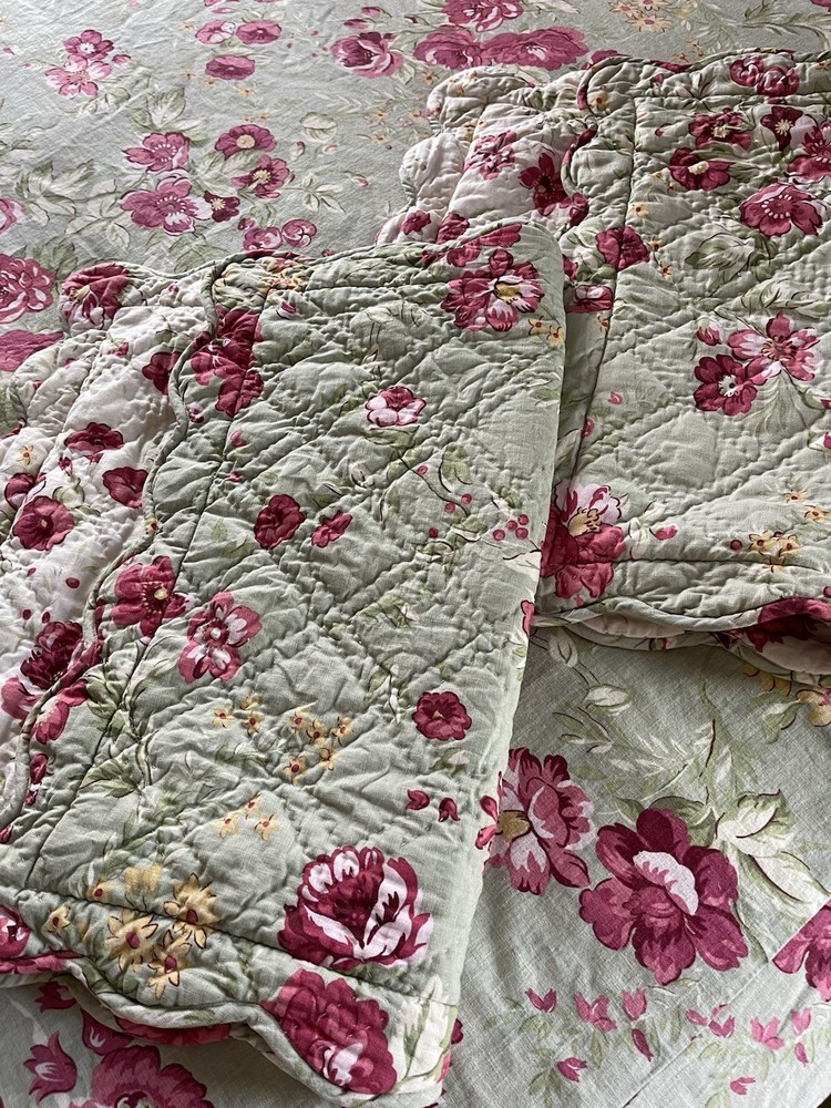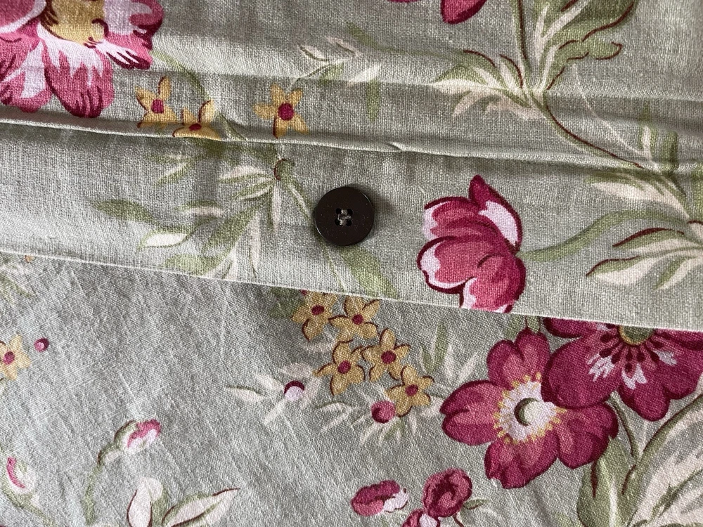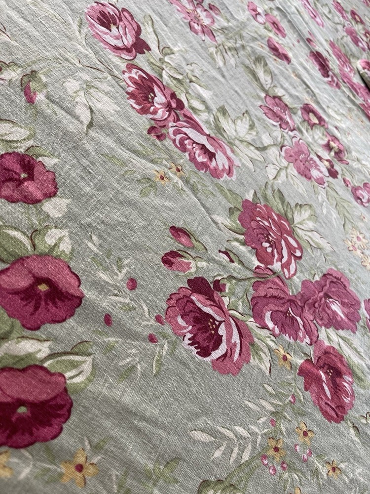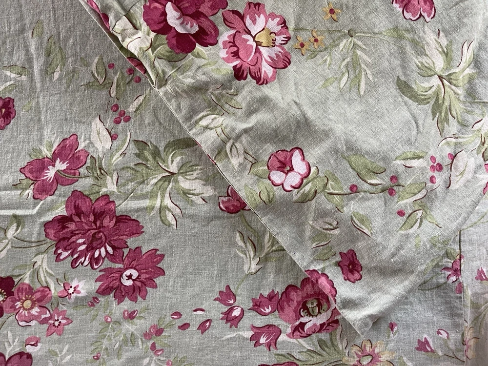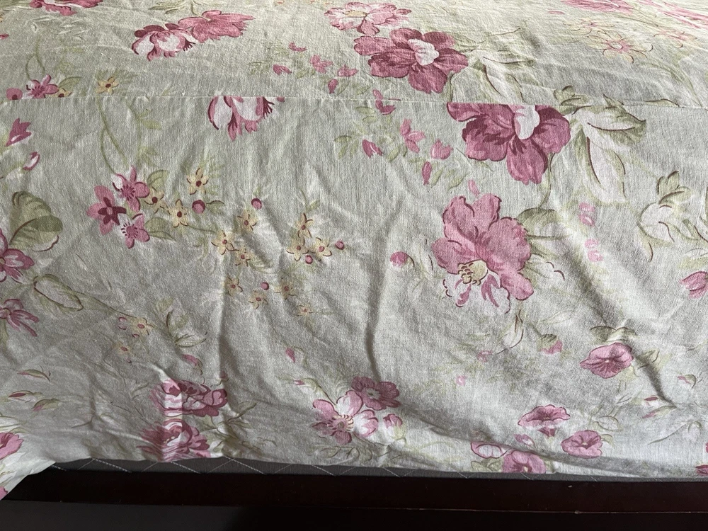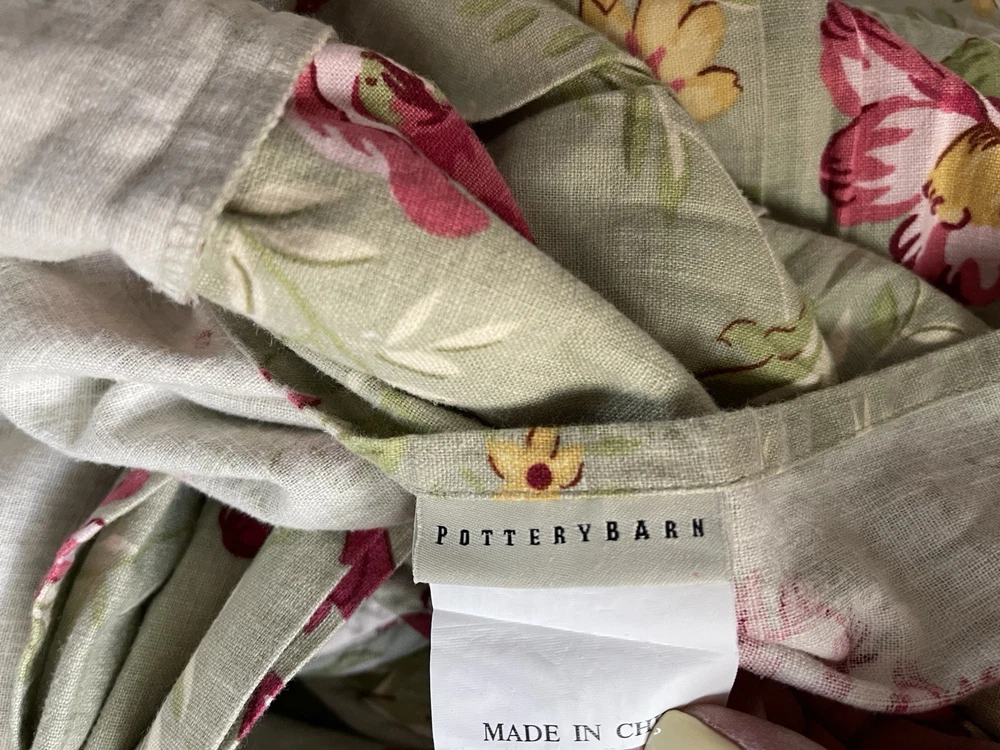 The Pottery Barn Manchester Rose Queen Duvet 2 Shams in green and pink floral is a three-piece duvet cover set perfect for adding a touch of nature to your bedroom decor. Made from a luxurious linen blend, this set features a beautiful floral pattern in vibrant colors. The set includes a duvet cover and shams, both adorned with buttons for easy closure. Ideal for a queen-sized bed, this set is sure to bring a charming and elegant look to any bedroom.