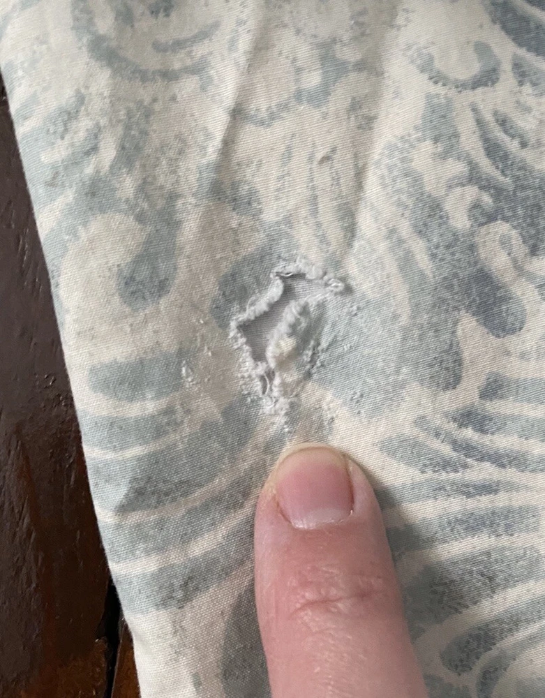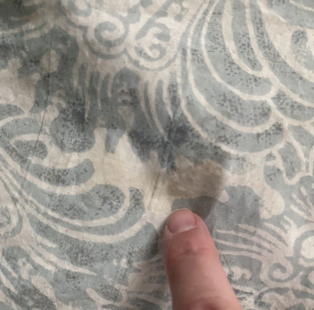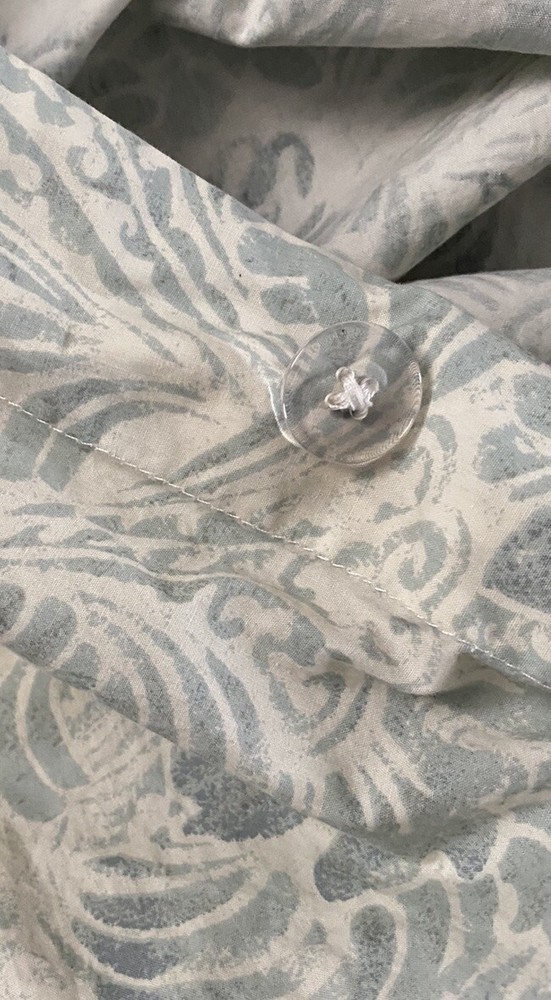 Absolutely love this duvet cover! The blue floral pattern is gorgeous on both sides, and the 100% cotton feels so soft and comfortable. Despite the minor imperfections mentioned, it's in great preowned condition and adds a lovely touch to my bedroom. Quick shipping too!
