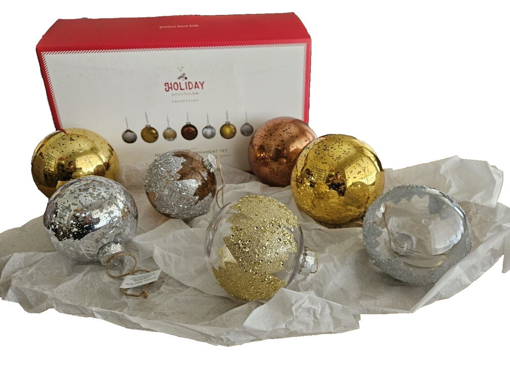 Channel old-world charm to your holiday tree with this timeless gold and silver ornament collection. Featuring a mirrored patina that recalls the antique of mercury glass, their glittering finish sparkles with the reflected light from a tree for a celebratory feel. Set of 7 ornaments, 3 large and 4 small Dimensions small: 3.75 in diameter, 4 in long Dimensions large: 4.75 in diameter, 5 in long Made of plastic Jute hanging string Shatterproof Spot clean only
