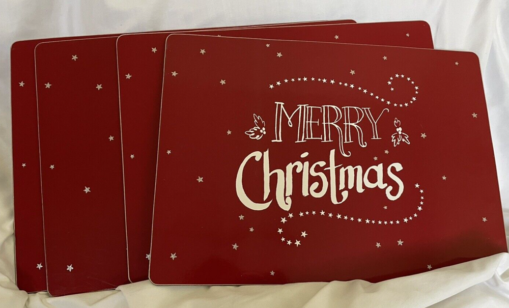 Pottery Barn Merry Christmas Cork Placements Set of Four No longer available Pre - owned just about 16" wide - 13" long made of cork sheet covered in coated paper & hardboard wipe w/ damp cloth or sponge to clean Smoke free Pet free home