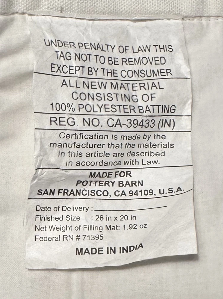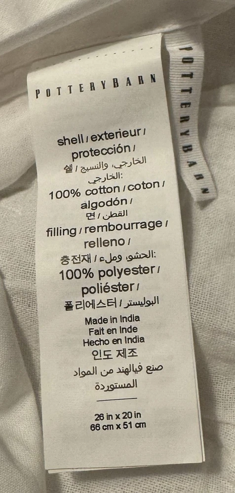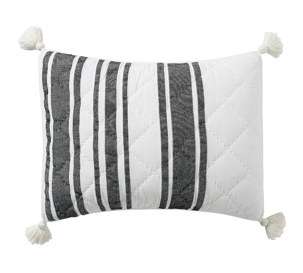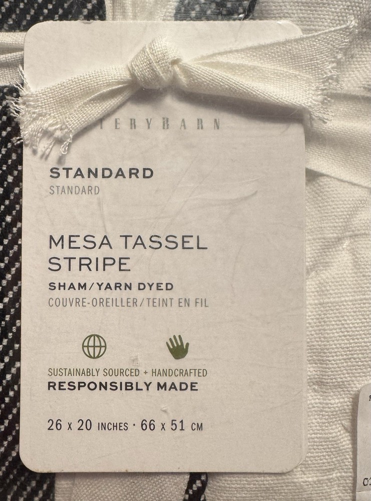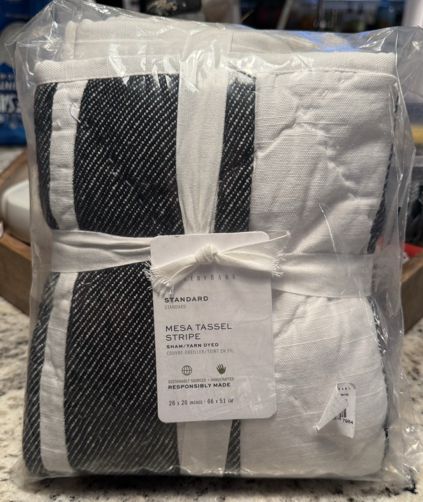 Pottery Barn 100% cotton standard size pillow sham. Features are: Pottery Barn Mesa Hand quilted of 100% yarn-dyed cotton with tassels at all 4 corners Farmhouse stripe in white and black Filling is 100% polyester Reverses to solid white Envelope closure Measures 20" h by 26" w Sham insert is NOT included Machine wash in warm water; normal cycle. Tumble dry on low heat; remove promptly. Warm iron as needed. Photos are a part of the listing description, please view them for detail In brand new condition with tags and in original packaging From a non-smoking, pet-friendly home Questions? Need more information or photos? Email me through the eBay messaging center and I'll get back to you promptly Check out my eBay store, Petite to Plus Resale Boutique , for a great selection of new and pre-owned name brand fashions and more in a wide range of sizes. From ladies petite to plus, and men's regular to Big and Tall, you'll find something to please everyone! We also carry a nice selection of name brand home decor, bedding, small electronics, collectibles and accessories