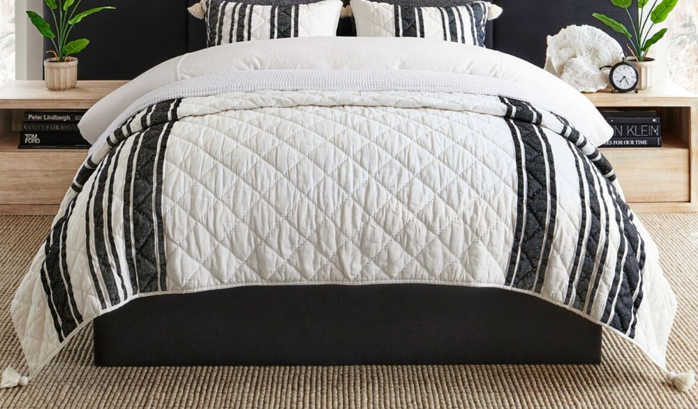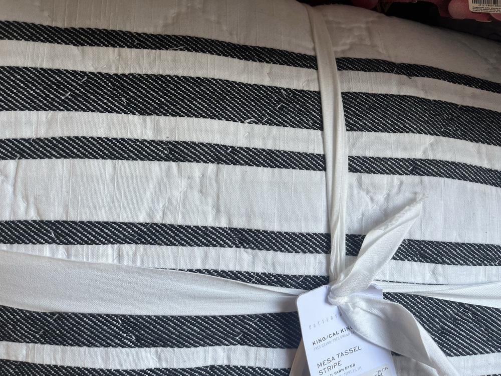 Up For Auction is - Pottery Barn Mesa striped Handcrafted King quilt with tassel corners Material: Hand quilted of 100% yarn-dyed cotton. Reversible Design: Reverses to solid white. King: 108" w x 92" l Smoke and pet free home.