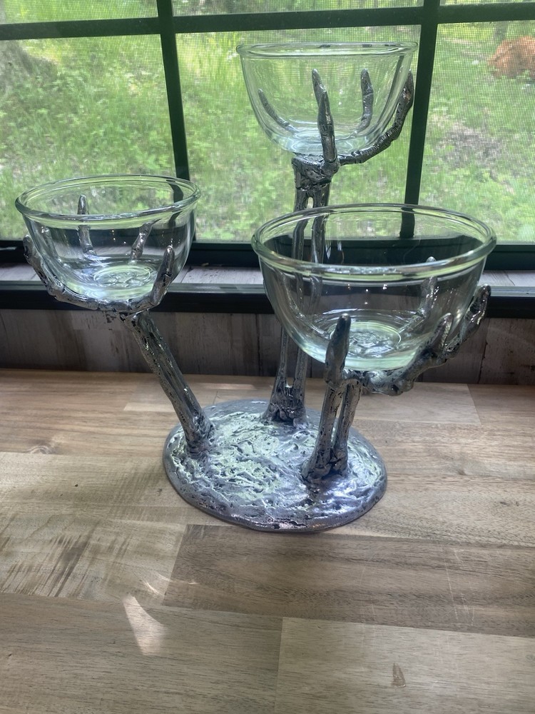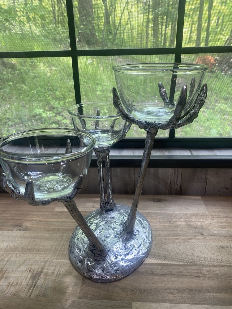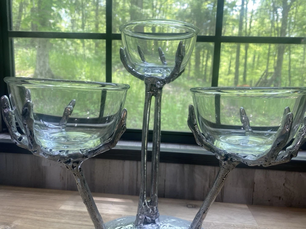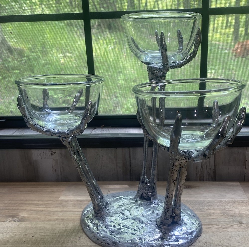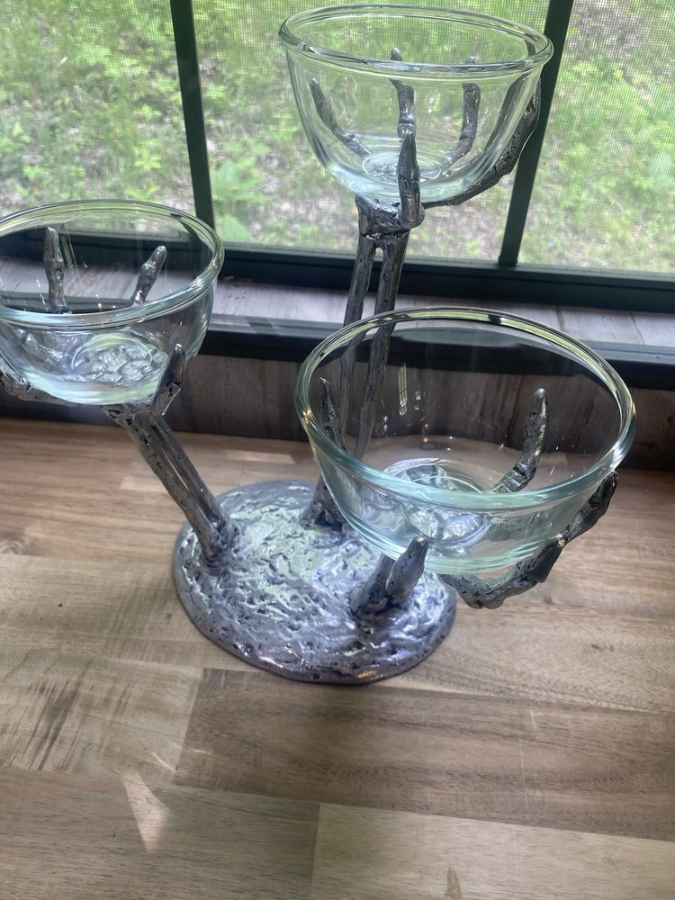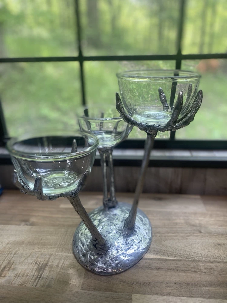 Elevate your entertaining game with this stunning Pottery Barn Metal Skeleton Hand Triple Condiment Serving Dish. The intricate skeleton hand design adds a touch of elegance and sophistication to any party or gathering. Perfect for serving condiments or small appetizers, this dish is sure to impress your guests. Made of high-quality metal, this dish is durable and long-lasting, ensuring that it will be a beloved piece in your collection for years to come. The multicolor design adds a pop of color to your table setting, making it a great addition to any decor style.