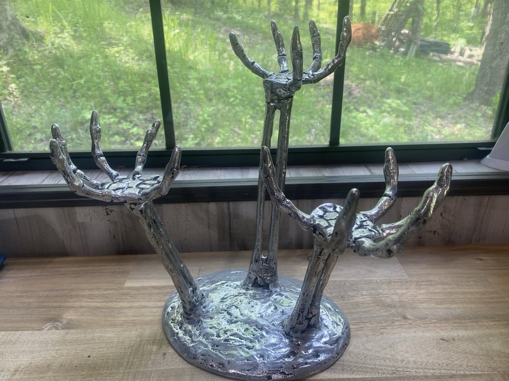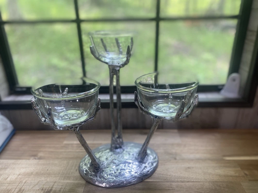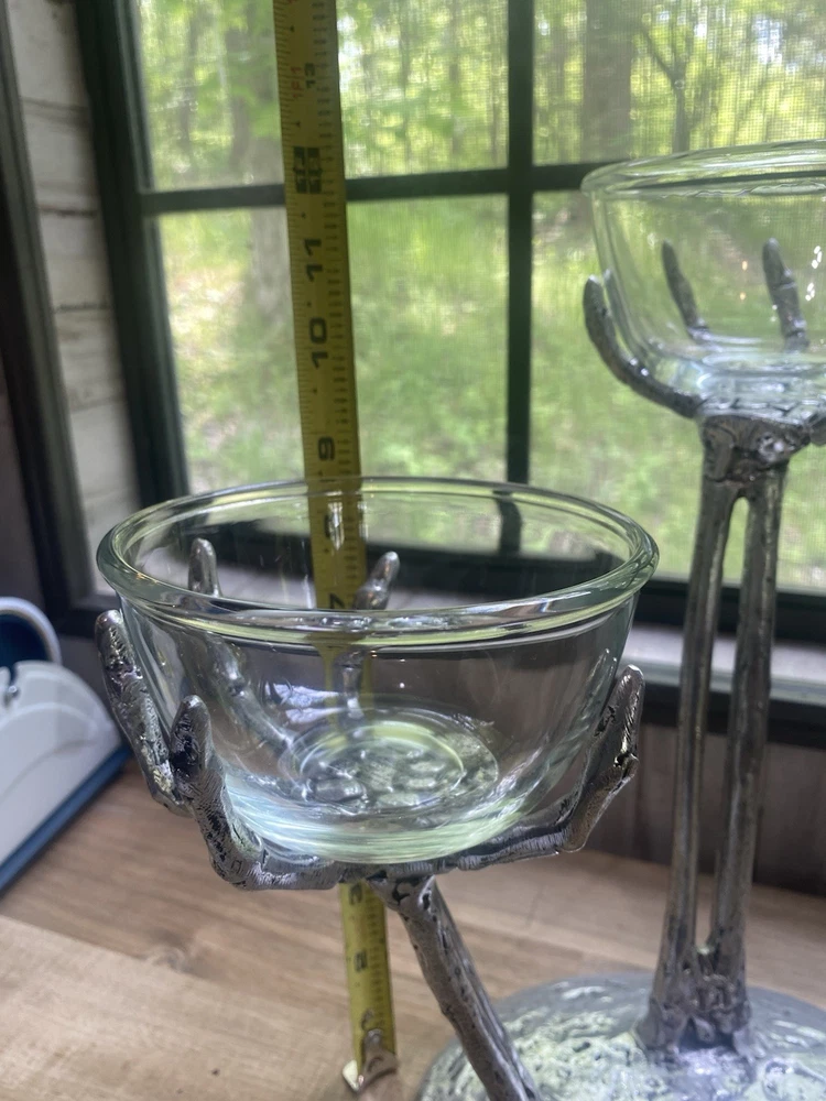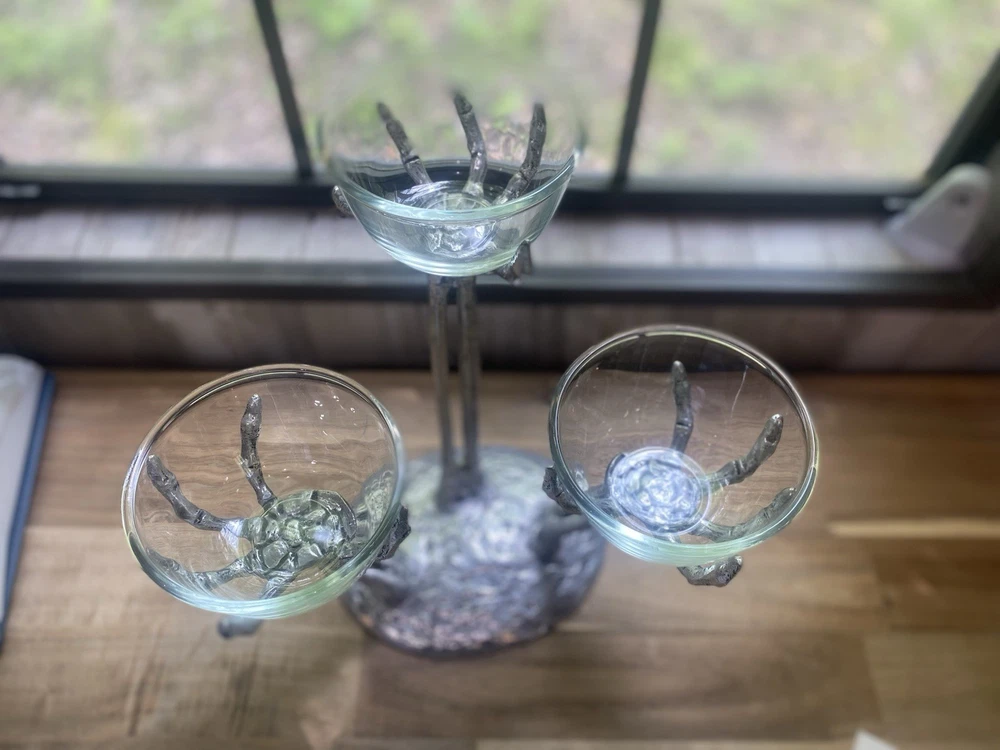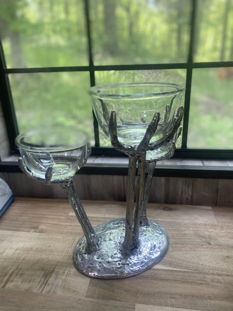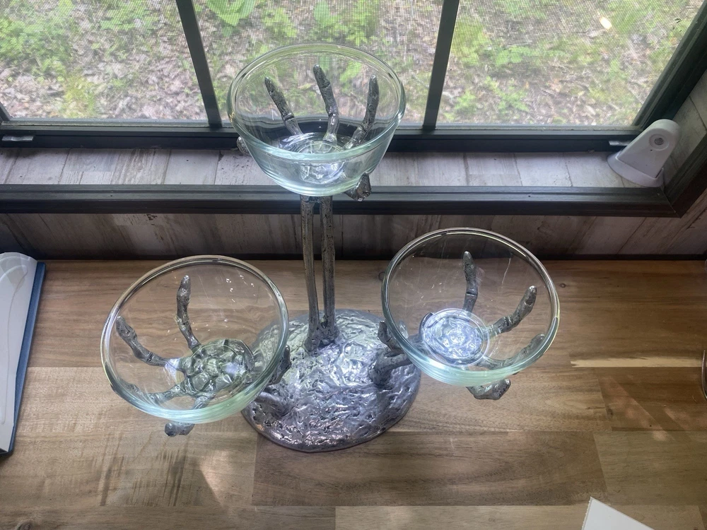 Elevate your entertaining game with this stunning Pottery Barn Metal Skeleton Hand Triple Condiment Serving Dish. The intricate skeleton hand design adds a touch of elegance and sophistication to any party or gathering. Perfect for serving condiments or small appetizers, this dish is sure to impress your guests. Made of high-quality metal, this dish is durable and long-lasting, ensuring that it will be a beloved piece in your collection for years to come. The multicolor design adds a pop of color to your table setting, making it a great addition to any decor style.