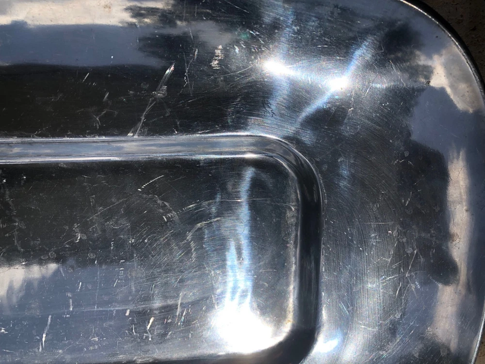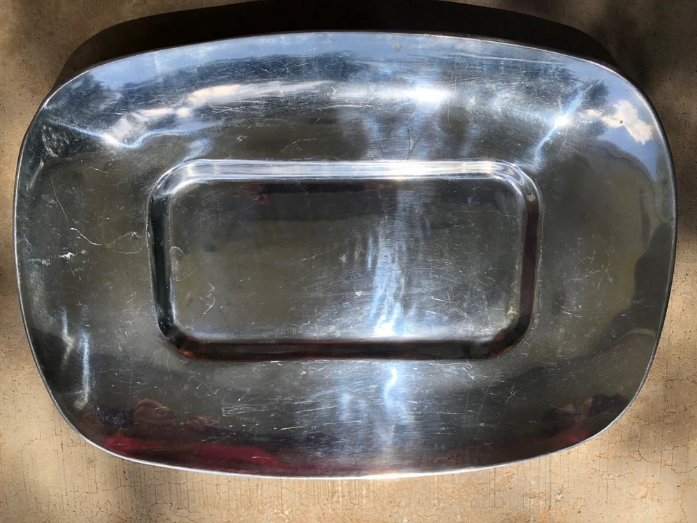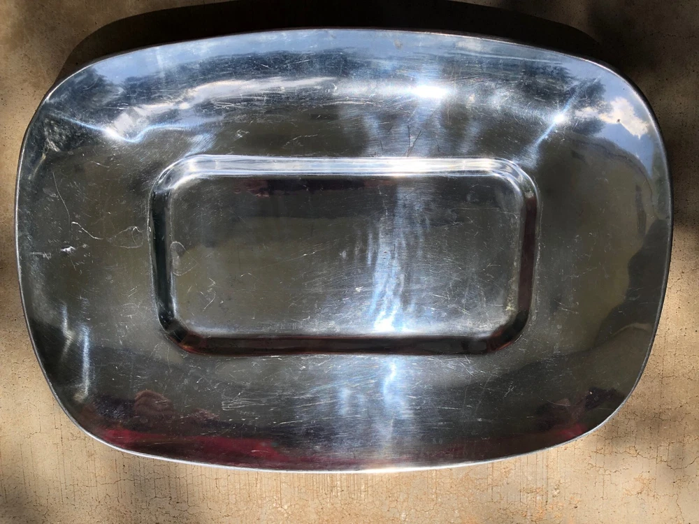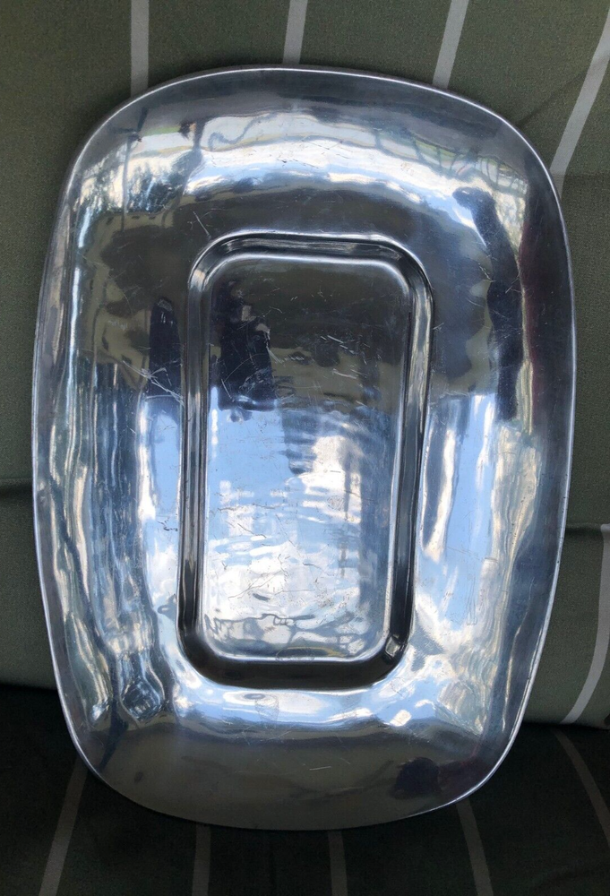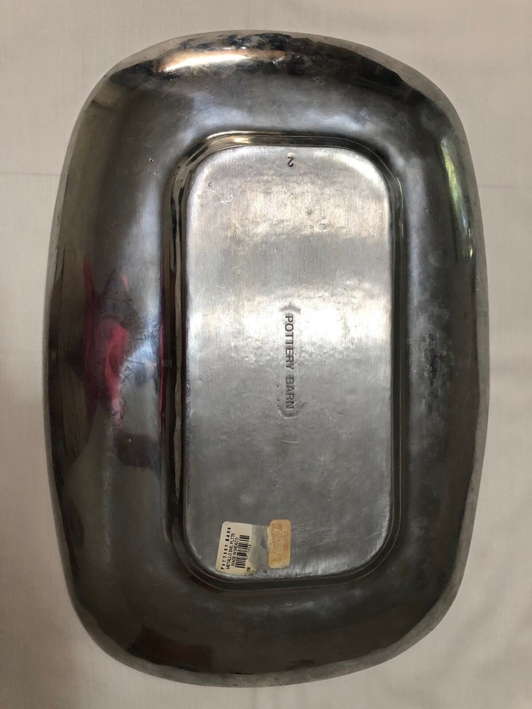 Pottery Barn Servicing Platter measures 18" x 12-3/8". Platter has minor scratches. Please see photos. Platter is silver in color. (Difficult to photograph shiny silver)