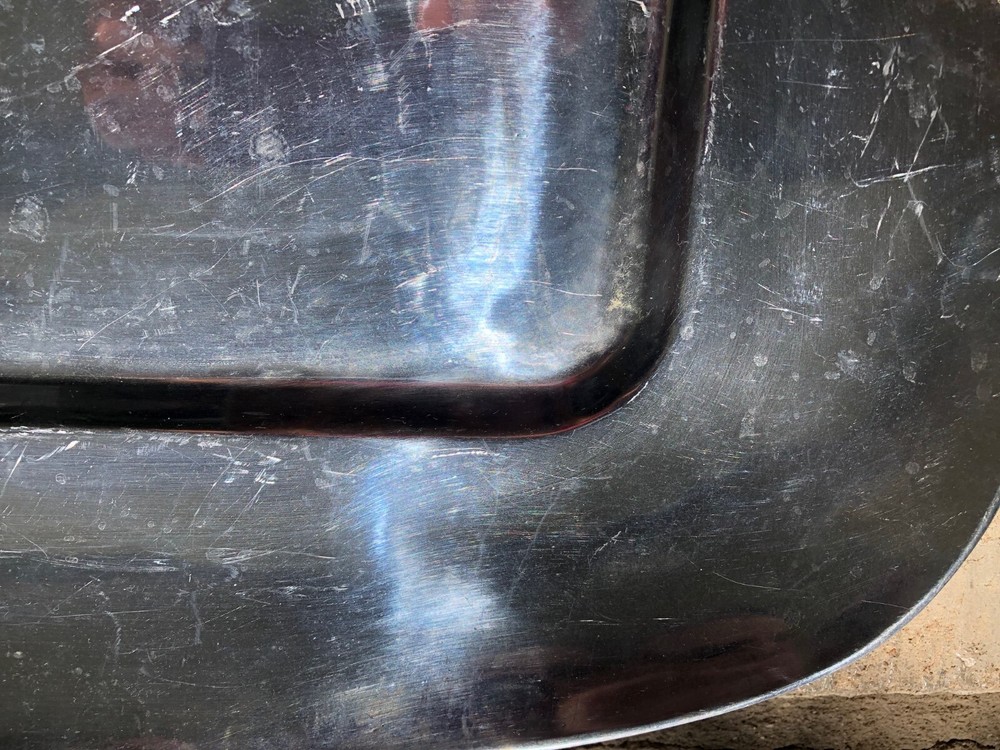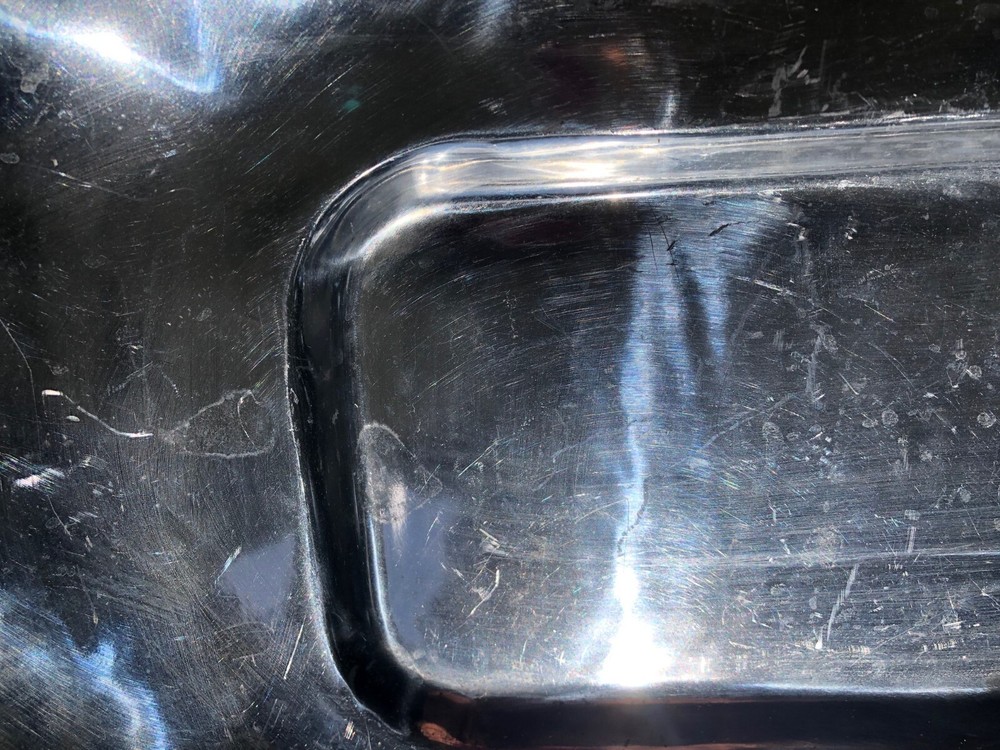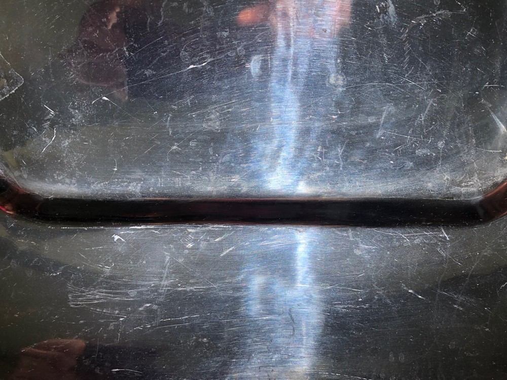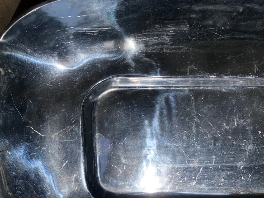 Pottery Barn Servicing Platter measures 18" x 12-3/8". Platter has minor scratches. Please see photos. Platter is silver in color. (Difficult to photograph shiny silver)