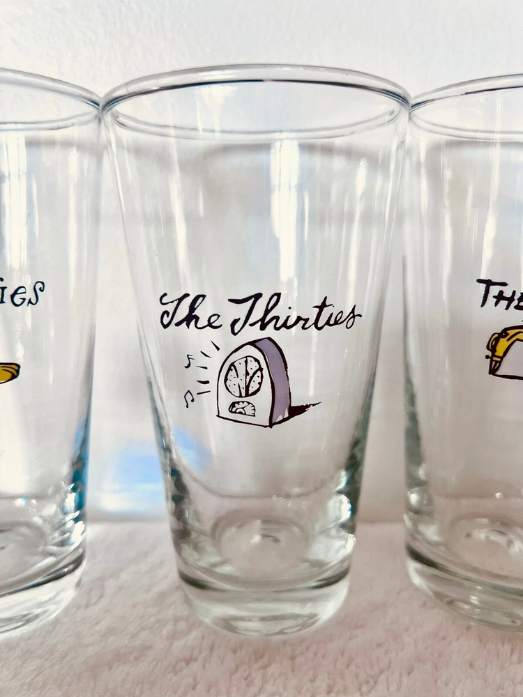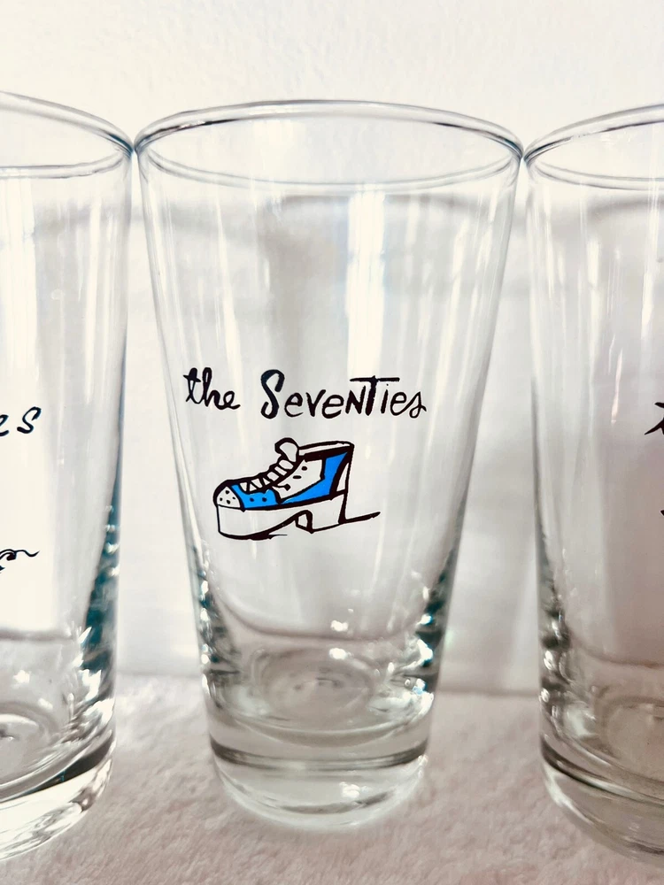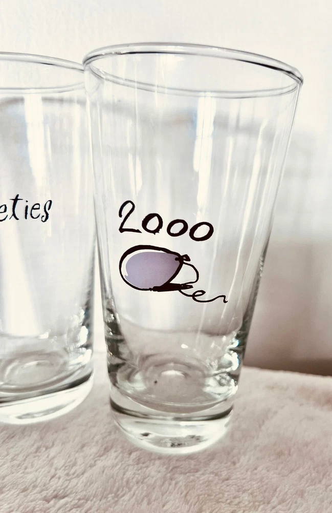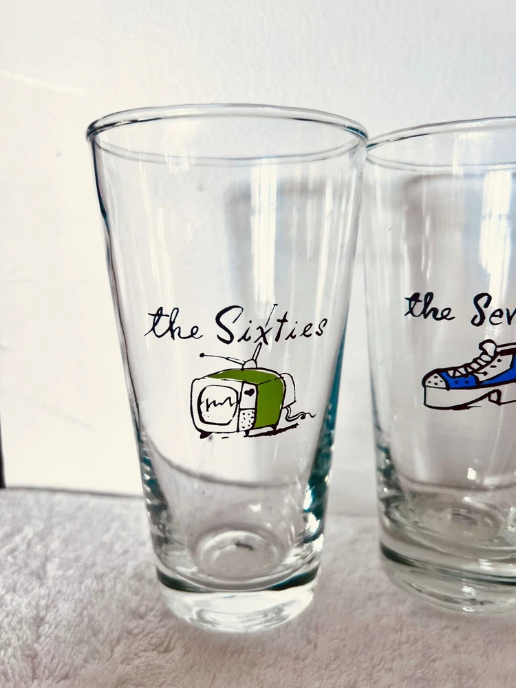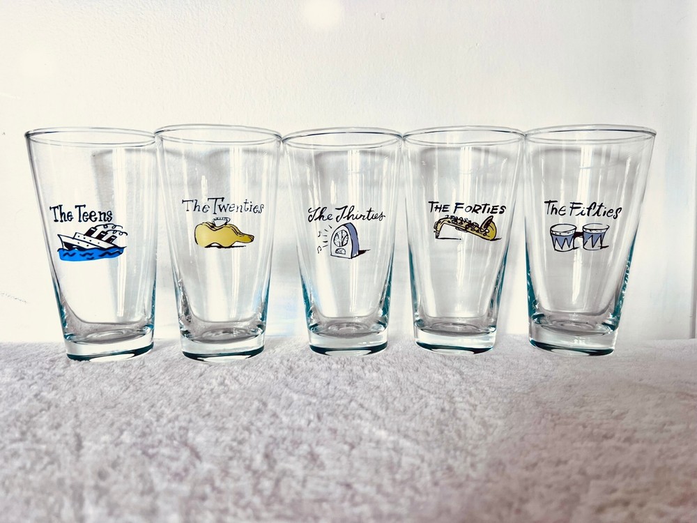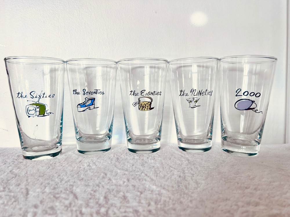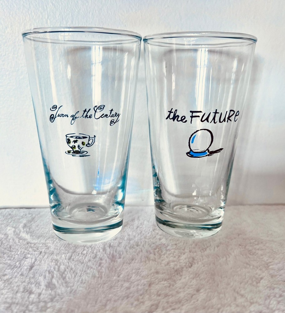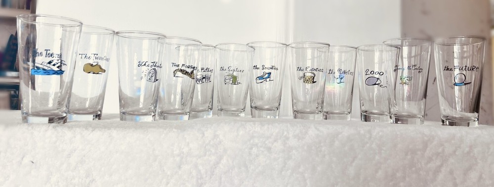 Millennium by Pottery BarnPottery Barn's Millennium New Years Decade GlassesReleased at the turn of the century, the year 2000RARE: A Complete Set of 12(teens, twenties, thirties, forties, fifties, sixties, seventies, eighties, nineties, 2000, Turn of the century, the future)These glasses are like new. I have only ever had them as decoration, I never used them.