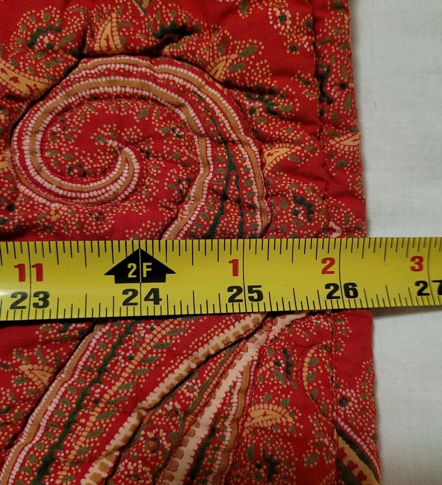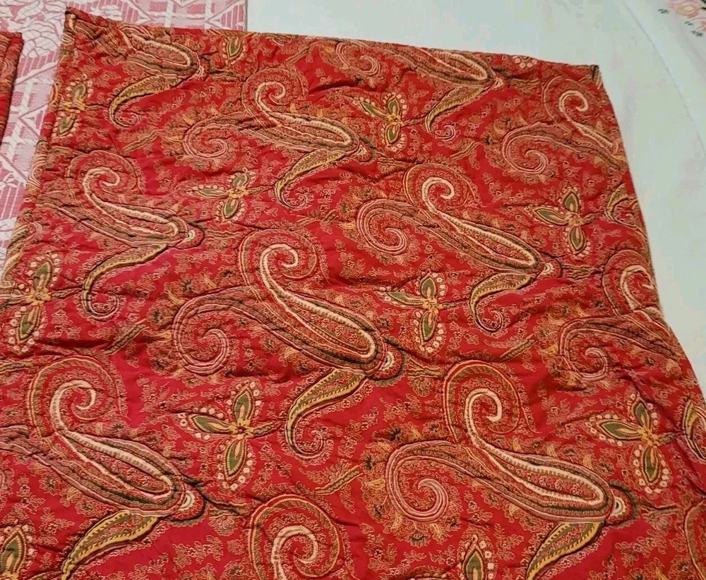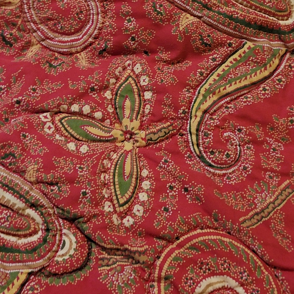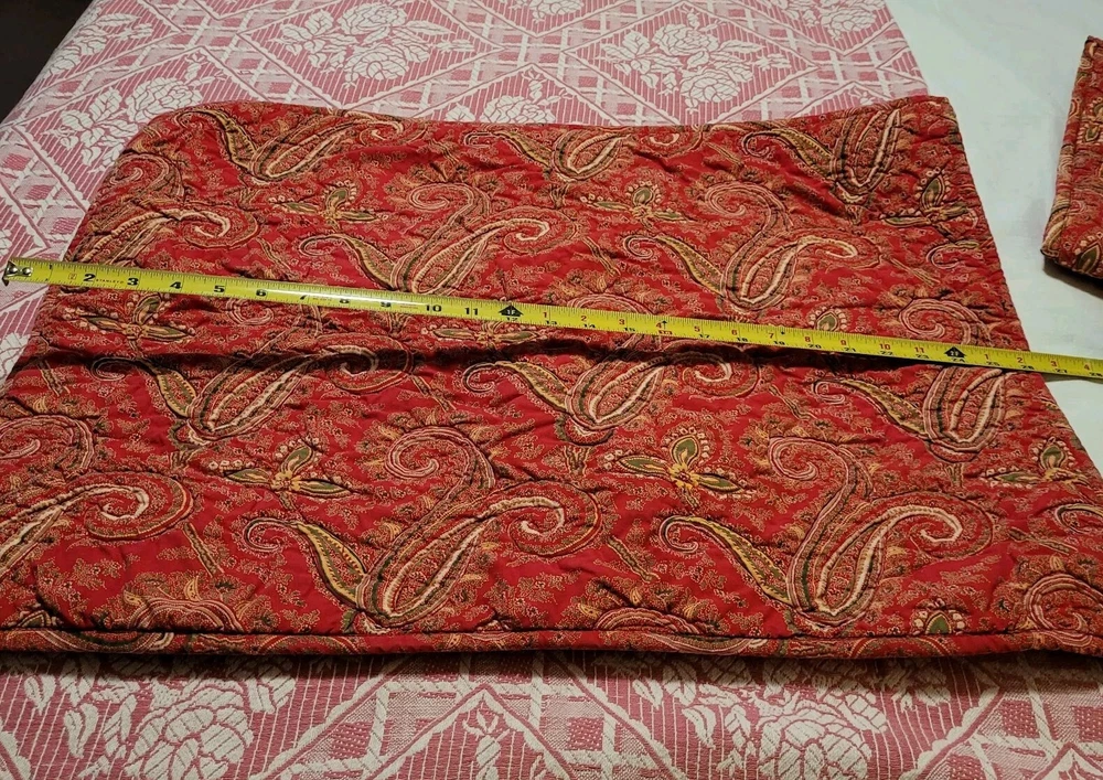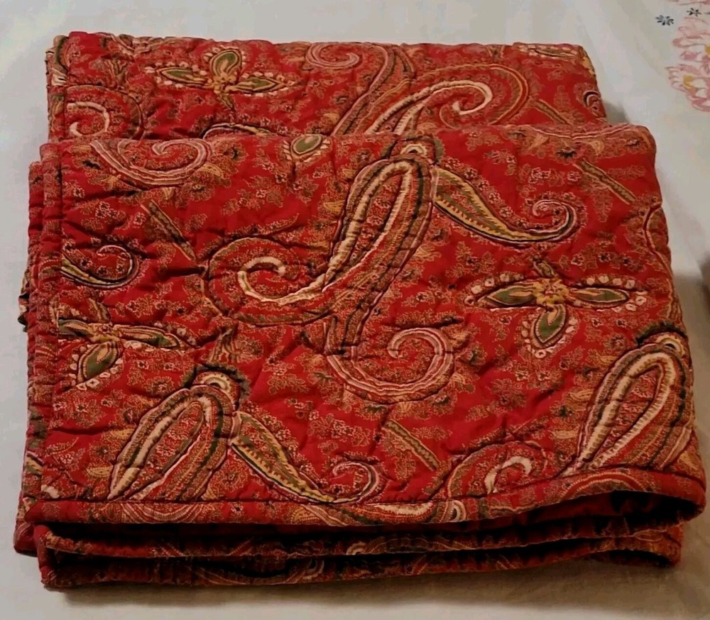 Pottery Barn Mira Anibel Quilted Red Paisley Standard Pillow Shams (2) 20x26" Beautiful pair of Pottery Barn Mira Anibel quilted red paisley standard pillow shams. These feature a gorgeous jeweled red background with yellow, green paisley. They have 2 ribbon tie closures and are 100% cotton. These have a very rich, Boho look and would be a great addition to a collection. Shams are in preowned condition & have been freshly washed & ironed. ***Tags show wear.***Please enlarge pics and ask any questions you may have before purchasing.
