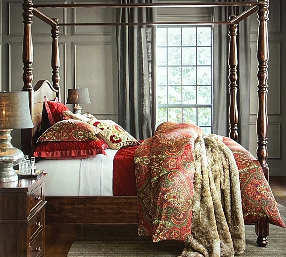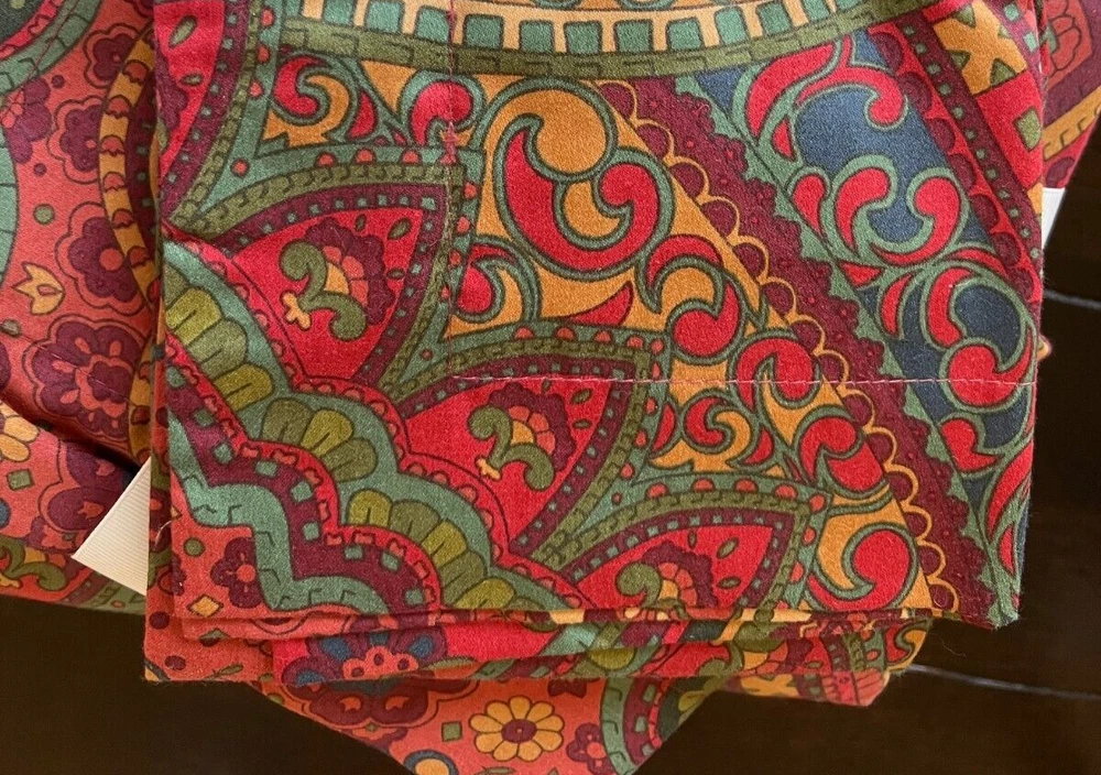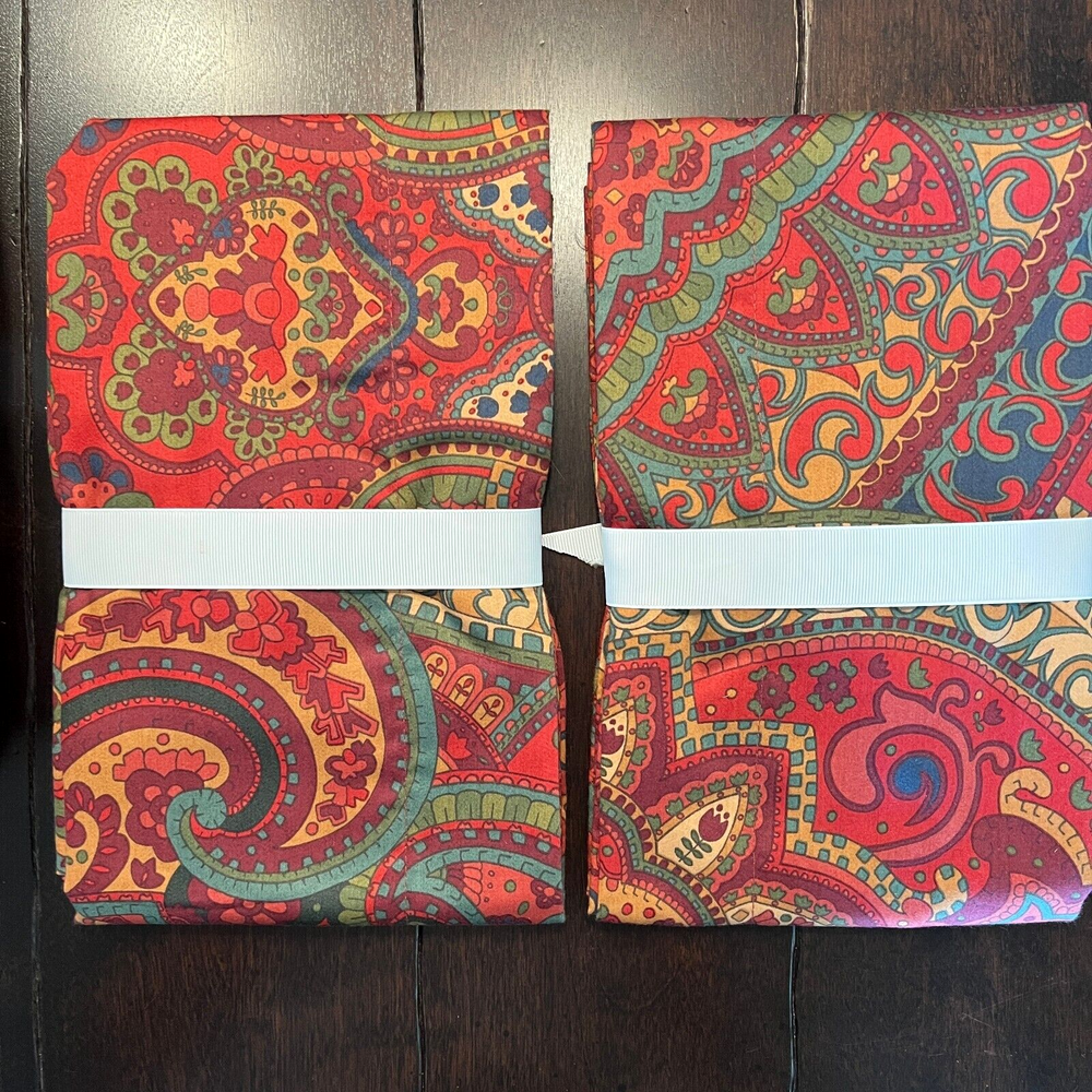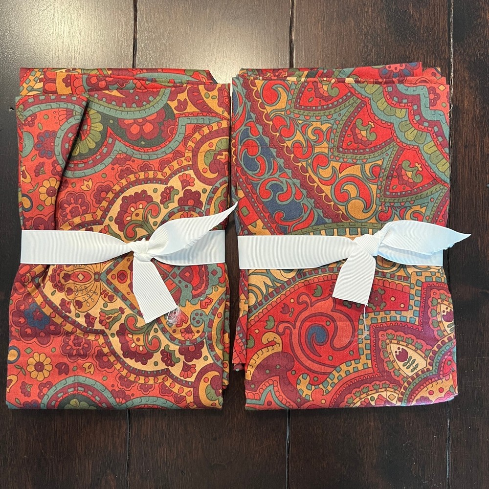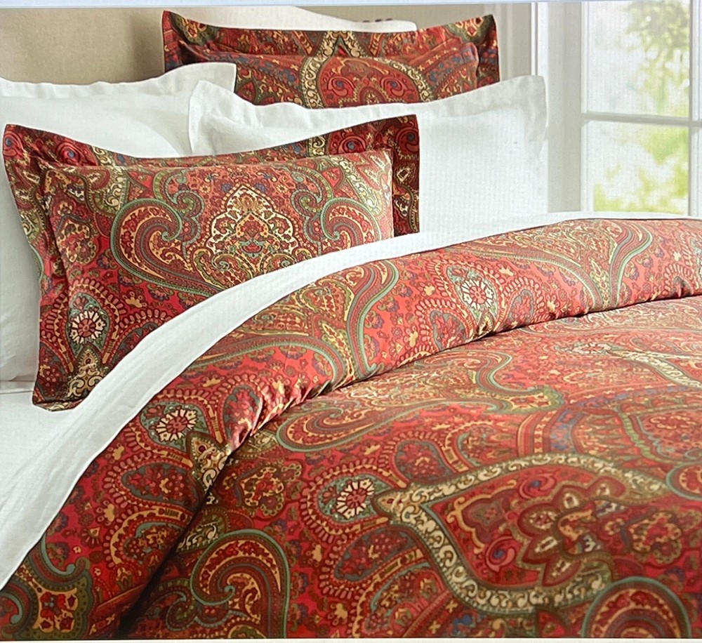 Pottery Barn Mira Paisley Sateen D uvet Cover & Shams New duvet with tag, new shams do not have tags Set Includes: One Full /Queen Duvet cover and two Standard Shams Color: Red multi Please let me know if you have any questions. no returns. A beautiful paisley pattern in rich colors on silky smooth sateen brings a sumptuous feel to your bed. Add a fur throw and pillows, to complete the look of pure luxury. Front and reverse fabric is 100% cotton Reverses to same pattern Duvet cover has a hidden button closure, sham has an envelope closure 350-Thread count Machine wash, tumble dry Full/Queen: 88" long x 92" wide Standard: 20" high x 26" wide