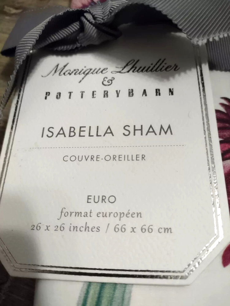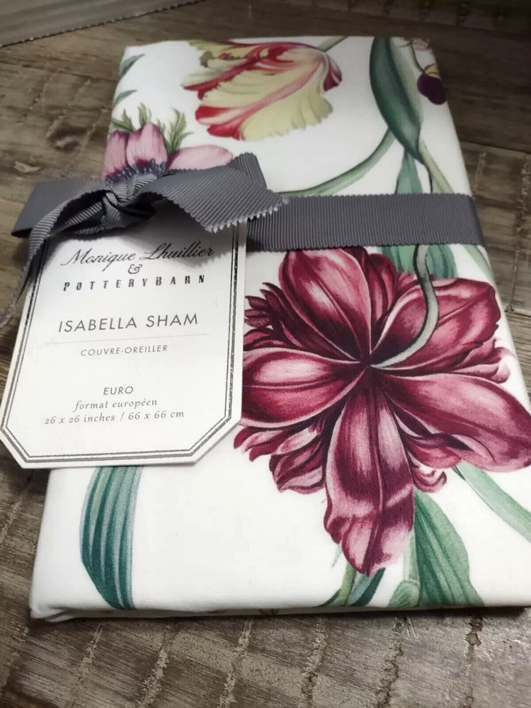 This was described as follows by Pottery Barn: A hand-painted floral artwork is brought to life in this romantic bedding. It mixes beautifully with solid bedding in coordinating hues for a garden-like look. Fashion designer Monique Lhuillier brings her sophisticated style in this bedding for Pottery Barn. Woven of 100% organic cotton; Organic cotton is grown without the use of toxic and persistent pesticides and synthetic fertilizers. GOTS certified. Oeko-Tex® certified, the definitive mark of excellence for products that are healthy for you and healthy for the environment. Reverses to solid. Sham features an envelope closure. 200 thread count DIMENSIONS Sham Euro: 26" square CARE AND MAINTENANCE Machine wash in cold water with like colors, gentle cycle. Use only non-chlorine bleach when needed. Tumble dry on medium heat; remove promptly. Warm iron as needed. This is being stored in my smoke-free clean home. Check out my other items for more great deals! Other Information Thank you for looking at my merchandise. I really appreciate your browsing and shopping. Mostly the buying, but it's all appreciated nonetheless. Ebay is my preferred method of payment. Who am I kidding? I prefer cash. But since that isn't an option, we will discuss Ebay. Payments must clear before the item(s) will be shipped. I do not ship to alternate addresses (be a grownup and update your address, already!), nor do I ship outside the contiguous 48 states or to APOs. If you don't know what an APO is, then it doesn't apply to you. No need to lose any sleep over it. Or you can just google it and kill another two minutes of the day. Then google "cats on Roombas" and there goes the rest of your day. You're welcome. Ebay collects tax from buyers. I do not personally receive the tax – Ebay sends it to the state comptroller. Otherwise, the state comptroller will get very cranky. I am happy to leave positive feedback for those who kindly take the time to do the same for me. Yes, it's a pain to take the time to leave feedback for me. But it gives me warm fuzzies. I LOVE warm fuzzies. And remember... Santa takes notes all year long. You don't want to get on his naughty list. Well, not for that reason anyway. ;) Color is subjective. The digital pictures I display are sometimes less than optimal. Well, not "sometimes". Let's be honest and say "almost always". I am not a professional photographer and I do not have a photo studio. I don't have a pet monkey either. All things I regret. Also, I cannot be held responsible for the differences in individual monitor settings. (You know you love to set that fluorescent pink filter on high! You go, girl!) Additionally, different lighting may affect the color perception of an item, so please be familiar with the items you are purchasing. It is possible that not all things in the pictures are included in the auction. For example, if, for some reason, my Aunt Bertha did a photo bomb when I was taking a picture of an item, you CANNOT BUY HER! Well, probably not. Make me an offer. Full disclosure: She passes gas. A lot. But I digress. The point is: Please read the description carefully and ask questions if you are unsure about what is and is not included. All items come from a pet-free, smoke-free, very clean home. No seriously. I have 19 bottles of Windex and my spices are alphabetized (with front-facing labels, of course! Duh! I'm not an animal.) That being said, some items that I sell are customer return items and it is impossible to tell if it was ever in a home with, say, stuffed squirrels everywhere. As much as I would love to have you as a customer, if you have strong aversions to scents and/or animal fur, perhaps it would be best for you to buy directly from the manufacturer. Or simply be prepared to launder the item (when applicable) prior to use. Or breathe less. I am in no way affiliated with (nor is this auction condoned by) any of the companies whose products I am selling (Neiman-Marcus, Williams-Sonoma Home, Restoration Hardware, Pottery Barn, Pottery Barn Kids, Pottery Barn Teen, West Elm, CB2, Crate and Barrel, etc.). My children also don't claim to know me when we are in public.