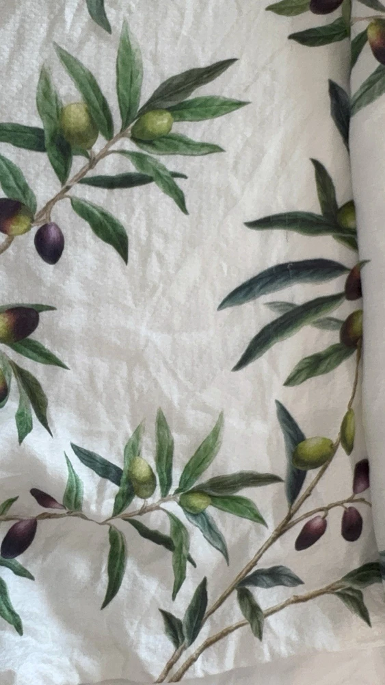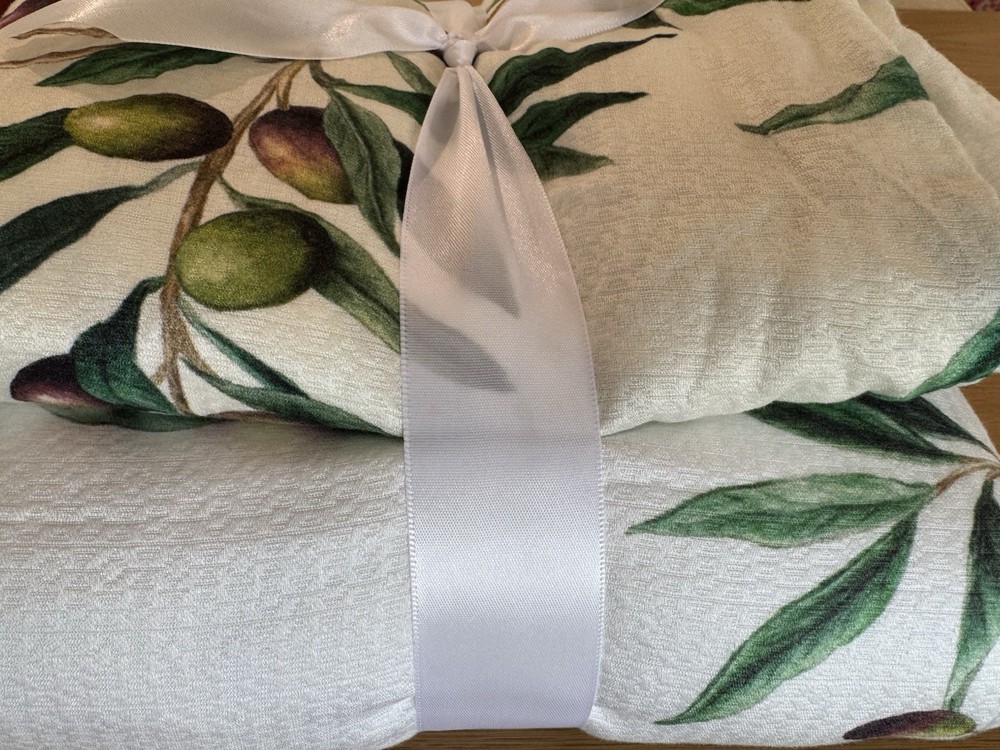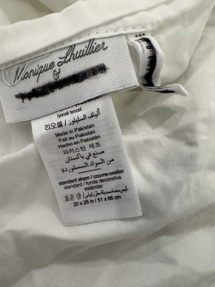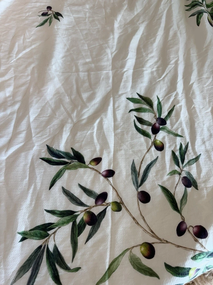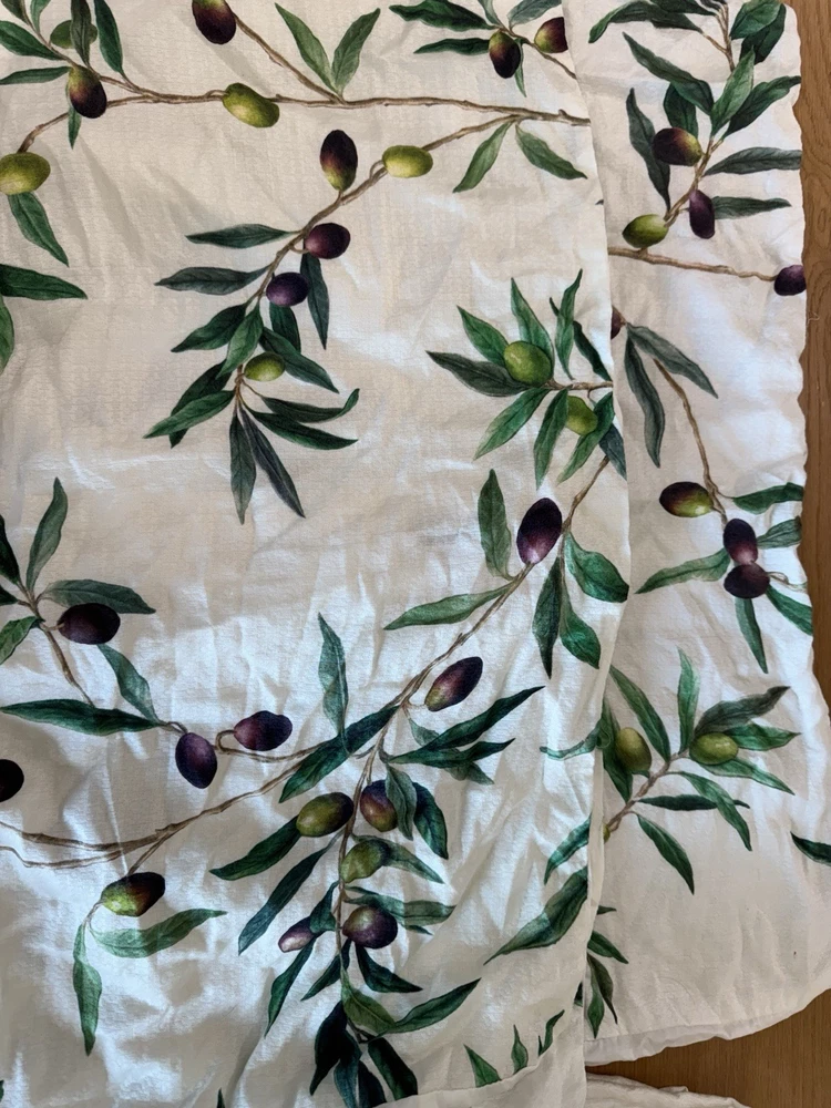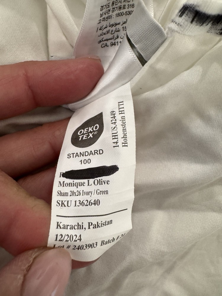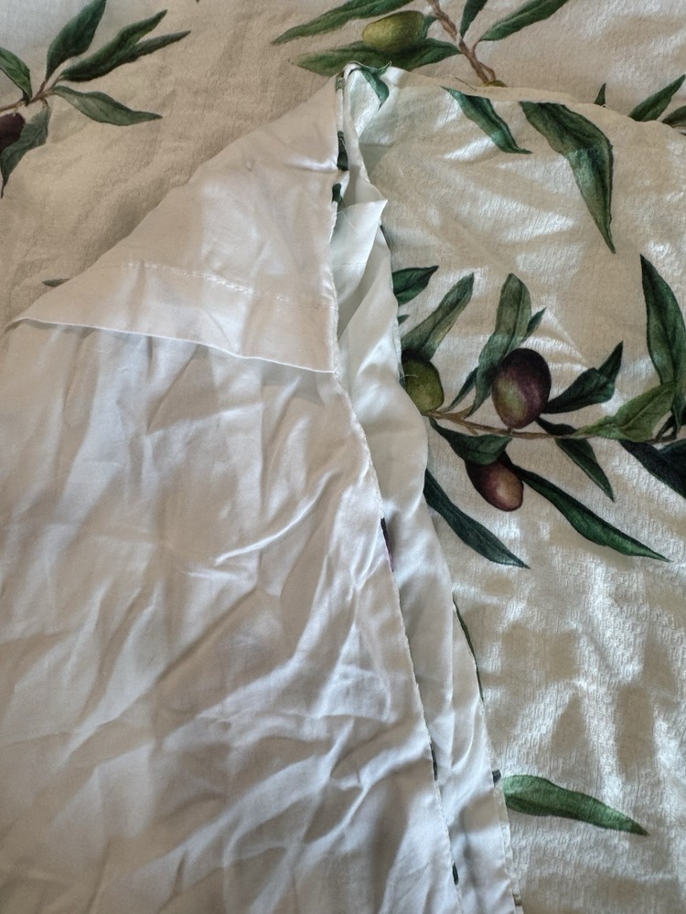 Pottery Barn Monique Lhuillier Olive Duvet Cover and 2 standard shams Tags marked with black marker as shown in last photo Open box No manufacturing packaging Preowned with flaw Pull in fabric in one corner of duvet As shown in pictures Made from 100% tencel. Reverses to the same. Duvet features a zipper closure with inner ties to keep insert in place; sham features an envelope closure.