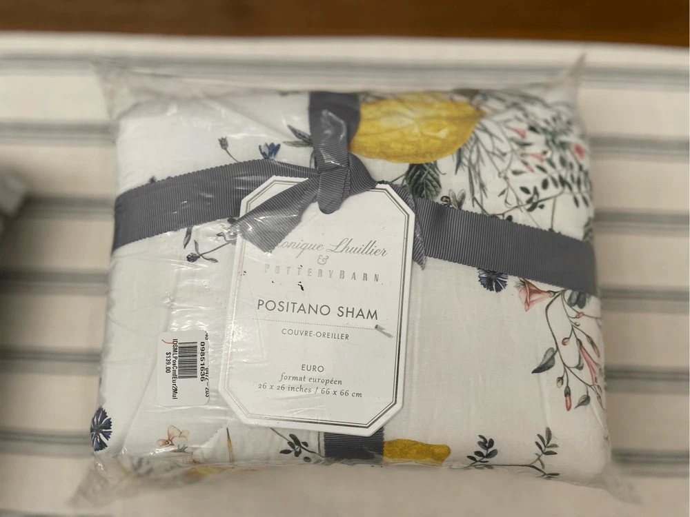 Pottery Barn Monique Lhuillier Positano Percale Duvet Cover + 2 Shams FULL QUEEN. Listing is for Full Queen Duvet and 2 Euro Shams. The crisp percale has a tailored feel that layers beautifully with stripes and other solids. Make luxury an everyday occasion with this exclusive collection. Made with 100% cotton percale. Reverses to same Duvet features a zipper closure with inner ties that keep insert in place; sham features an overlap closure. Machine wash.