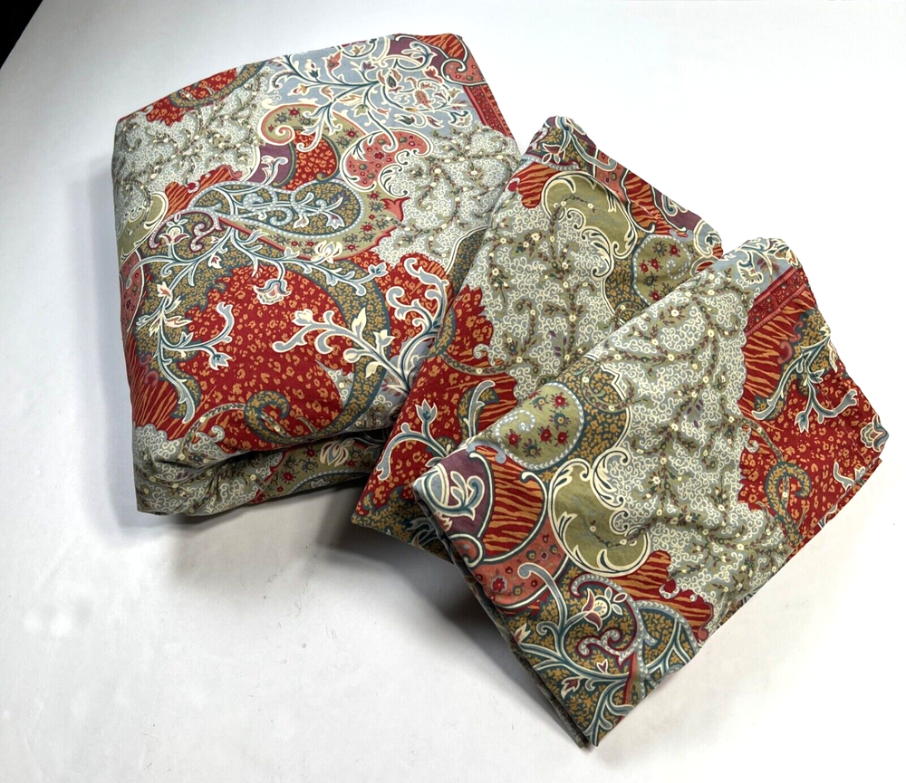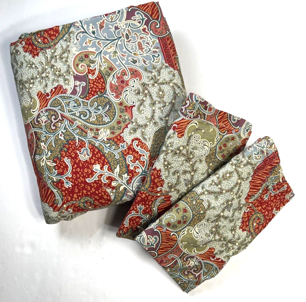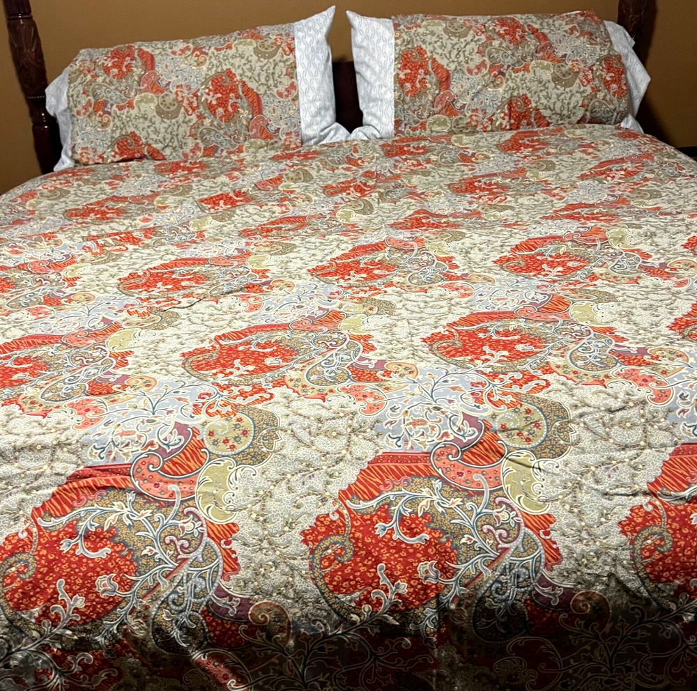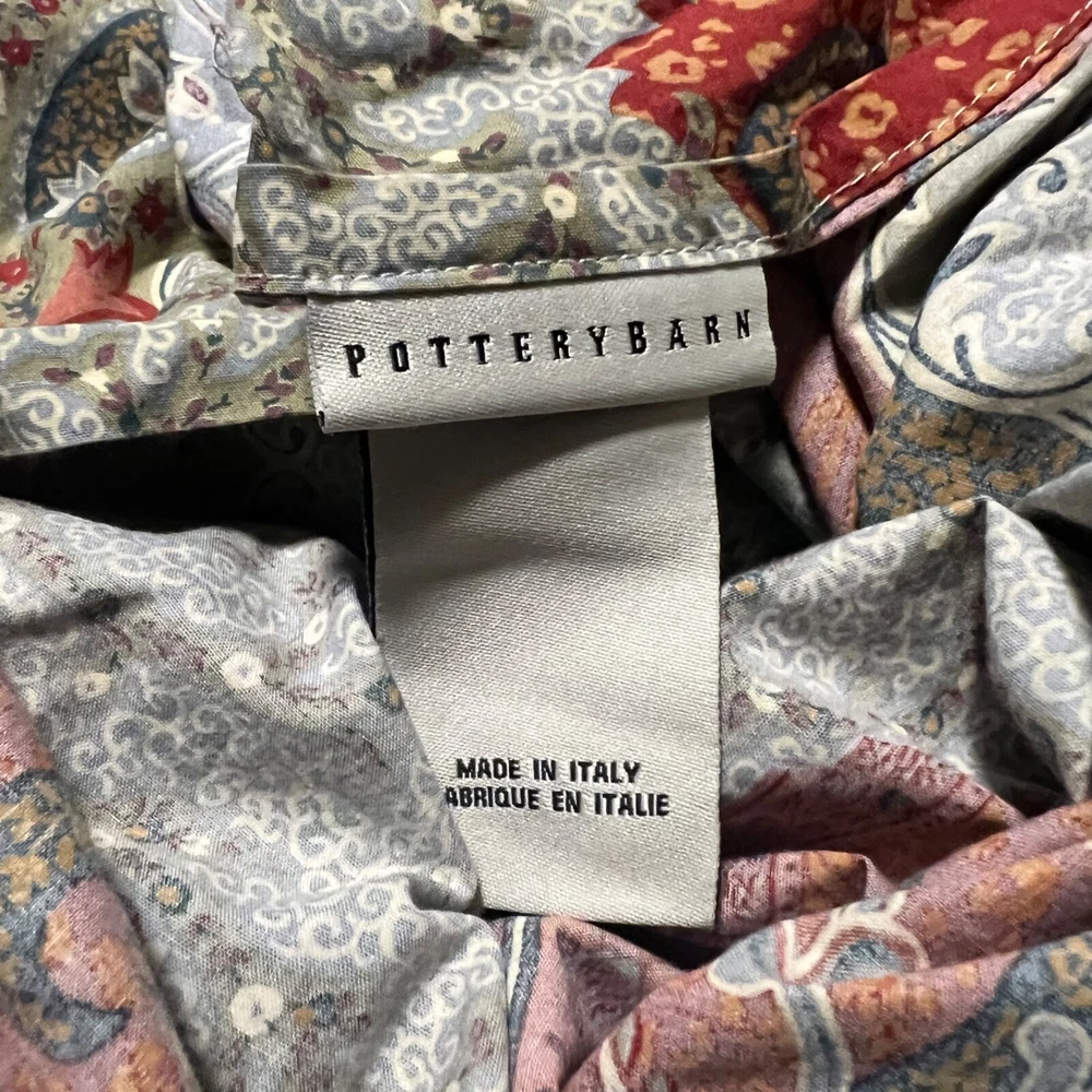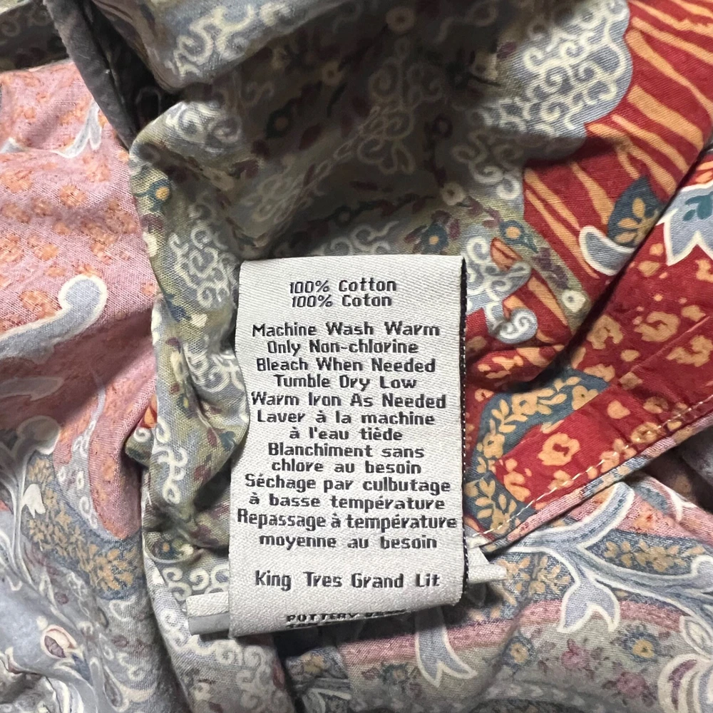 This is a Pottery Barn Monreal Paisley Duvet Cover set in King size made of 100% Cotton in Italy. The set includes two Standard shams. The design features a multicolor paisley pattern, suitable for a bedroom. Pre-owned, in good condition. D780