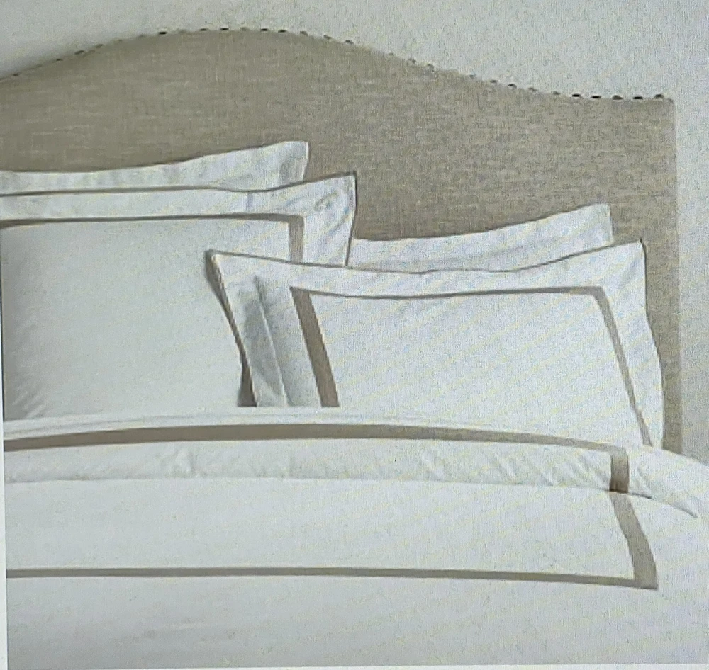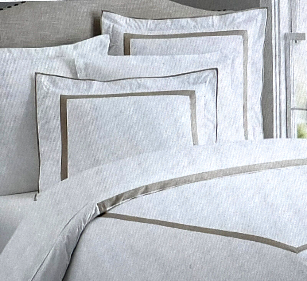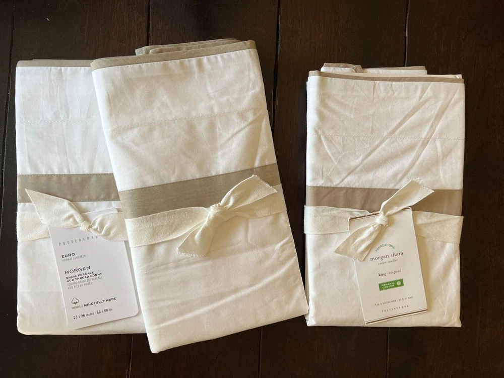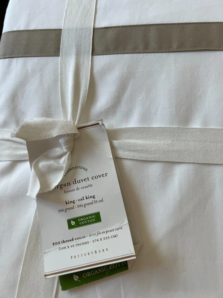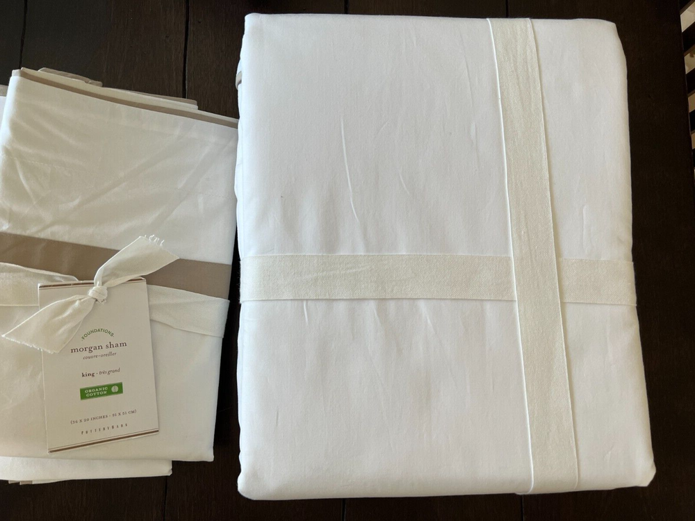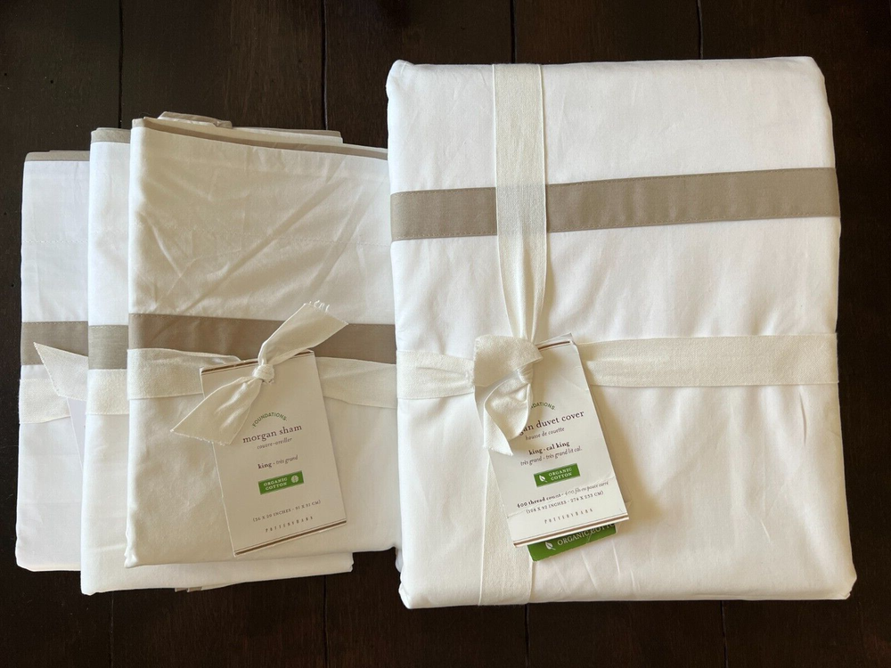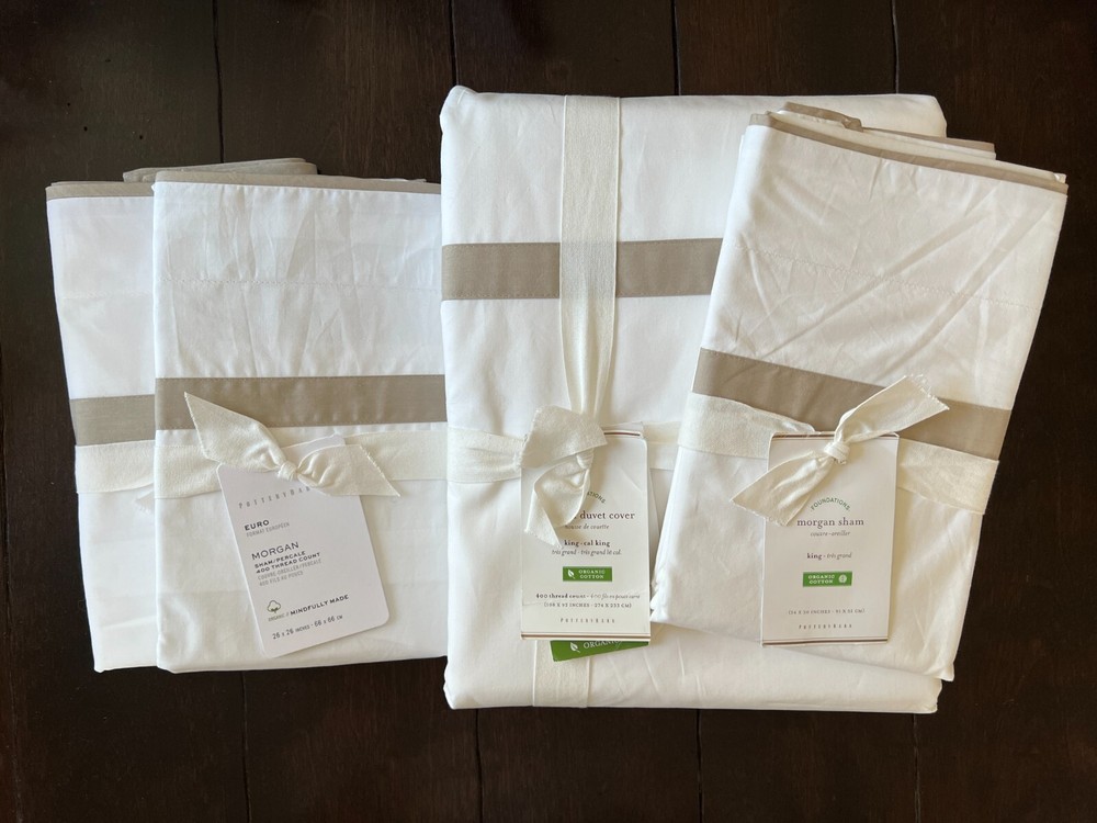 Pottery Barn Morgan 400 thread Count Organic Percale Duvet Cover & Shams 4 piece Set Includes: One King/Cal King Duvet cover, two Euro Shams, one King Sham Color: White and Simply Taupe New with Tags one euro sham does not have a tag. and it does have a sku number written on it. see picture #9 - might wash out ? It is on the inside seem, on the backside opening area. So will not be visible from the front. Please let me know if you have any questions . no returns . 400-thread-count Morgan Duvet Cover has an exceptionally crisp, smooth hand. A thick band applique lets it coordinate perfectly with our Morgan Sheet Sets. Made of 100% organic cotton Duvet features a hidden button closure with inner ties that keep insert in place, sham features an envelope closure. 400-thread count Reverses to solid white Machine Washable King/Cal. King Duvet: 92" long x 108" wide Euro Sham: 26" x 26" square King Sham: 20" high x 36" wide Flange: 2"