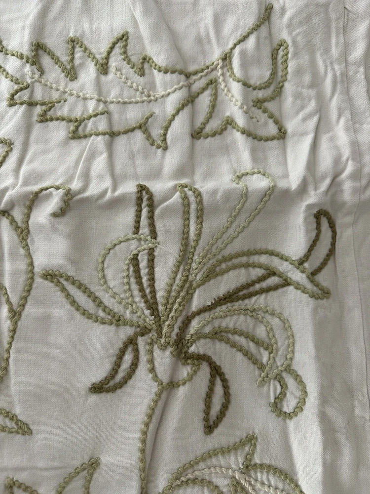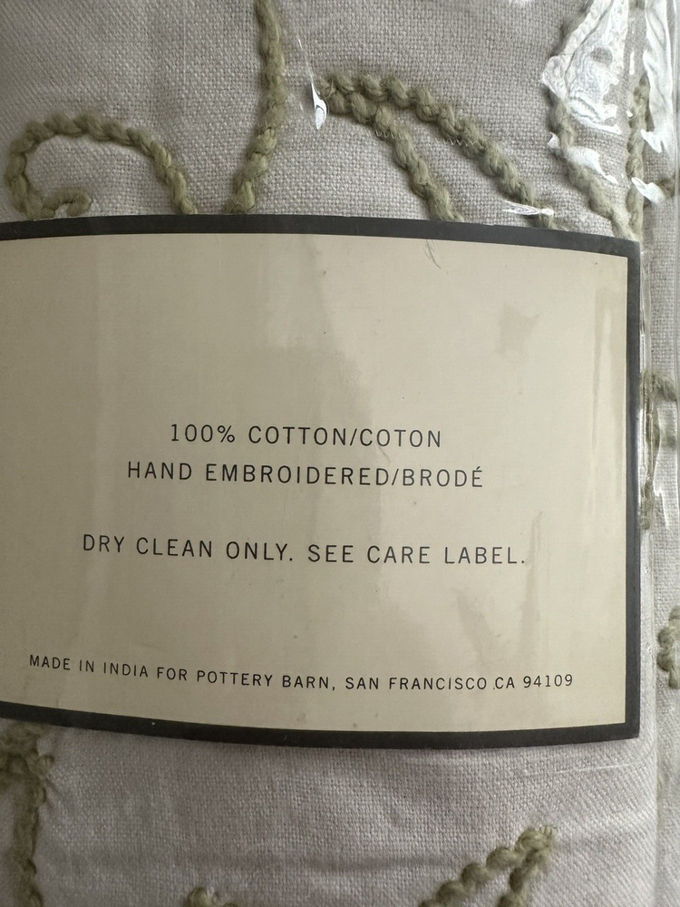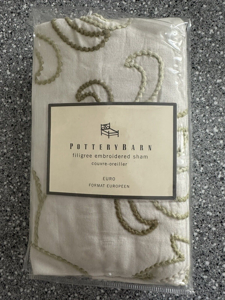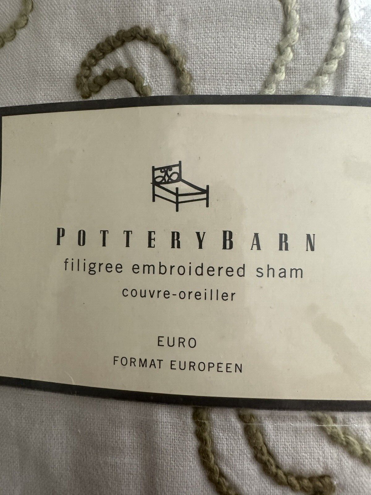 Pottery Barn ~ Filigree HAND embroidered EURO Pillow Sham Quantity: (1) EURO Sham Item is NEW (old stock) in original packaging. Hard to find older pattern. Ivory cotton with beautifully hand embroidered Leaves and Plants in varied shades of green. Tropical style. Reverse side is solid ivory. Any questions, please ask prior to purchase. Please check out my other treasures! New and hard to find items listed weekly. I usually offer 4 shipping options, so please compare and select the best option for you. I am always happy to combine items to save you money on shipping costs. Please request PRIOR to making payment. Thank you for browsing my store, I greatly appreciate it!
