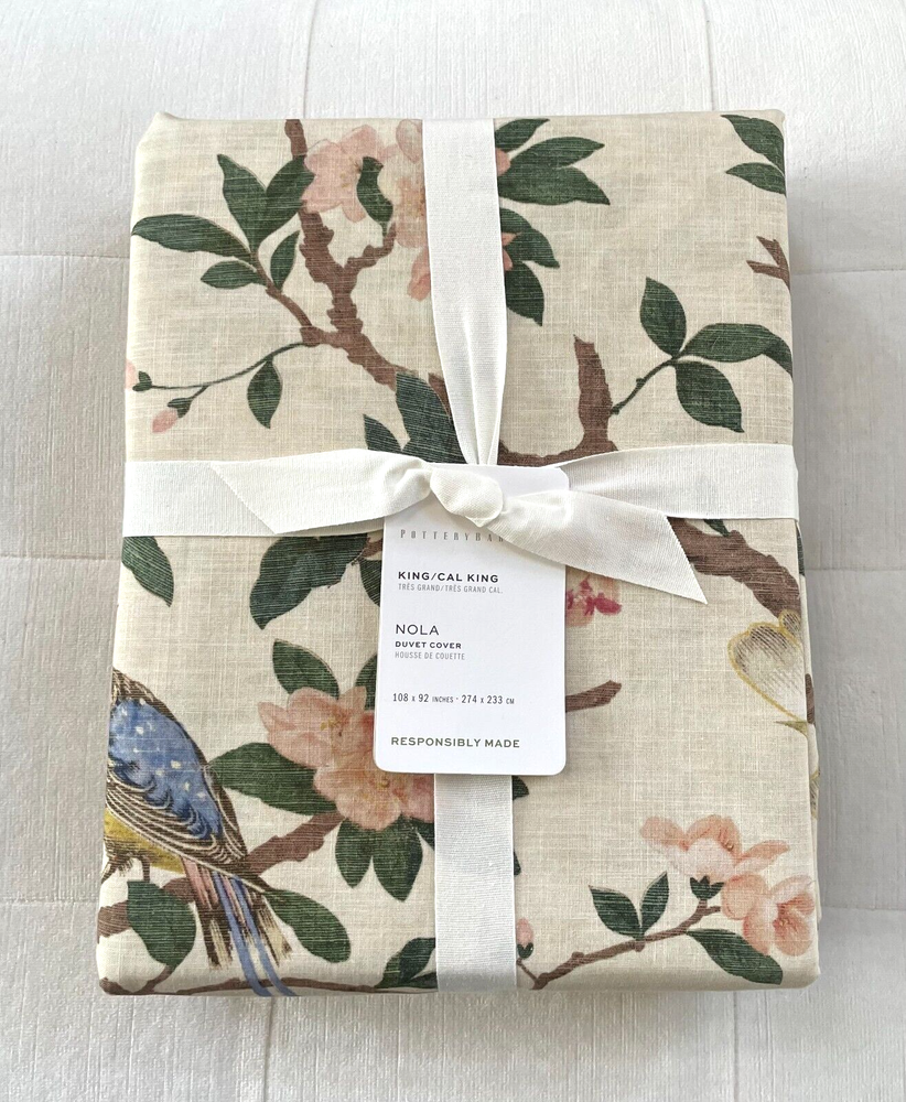 Pottery Barn Nola Songbird King/California King Duvet Cover New with Tag PB describes as: Inspired by traditional chinoiserie, this pattern makes rooms sing, from Charleston to New Orleans. It has a classic look when paired with solids and layers beautifully with a range of hues. Made of 100% cotton slub. Reverses to same as front OEKO-TEX® STANDARD 100: tested for 1000+ harmful substances. 14.HUS.42449 HOHENSTEIN HTTI. By choosing our cotton products, you’re supporting our investment in Better Cotton’s mission. This product is sourced via mass balance and therefore may not contain Better Cotton. Imported. Machine wash in warm; gentle cycle. Only non-chlorine bleach when needed. Tumble dry on low heat; remove promptly. Warm iron, as needed. King/Cal. King Duvet: 92" l x 108" Pet & Smoke free Ships within 1 business day Thank you