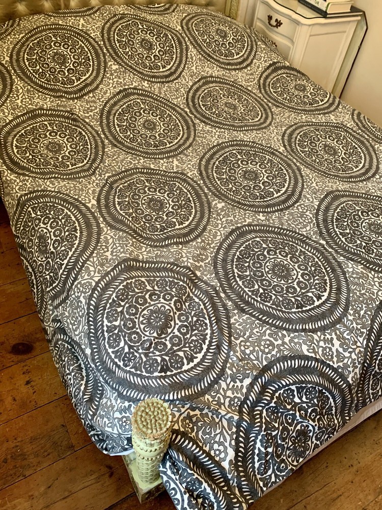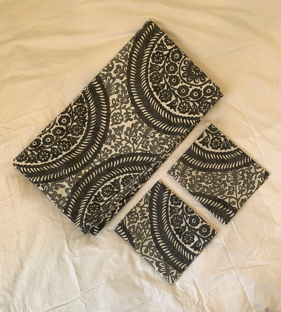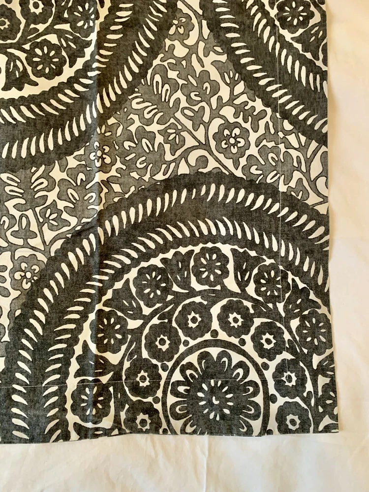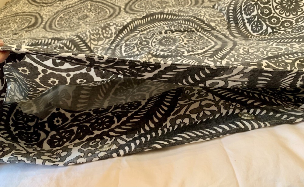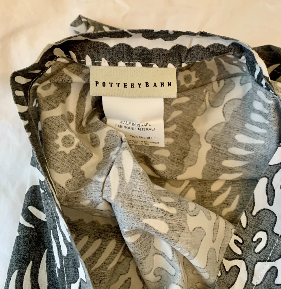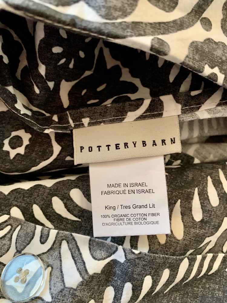 This elegant three-piece duvet cover set from Pottery Barn features a beautiful medallion pattern in black, gray, and white. The set includes a KING-sized duvet cover and two KING shams. The duvet cover is a rectangular shape. The set is made of high-quality cotton fabric that is machine washable and reversible, making it easy to maintain its appearance. The duvet cover features a button closure and is designed to hold a king size duvet. The set is made in Israel. With its stylish design and comfortable material, this Pottery Barn NORA MEDALLION duvet cover set is a perfect addition to any bedroom. Excellent pre owned condition. Freshly laundered! These photos are of the actual items and were taken using a queen sized bed. Thanks for looking!
